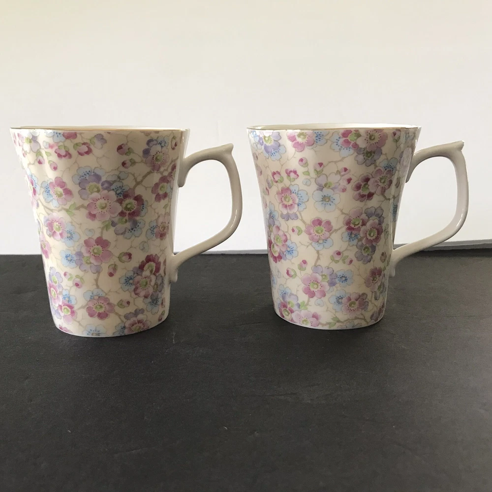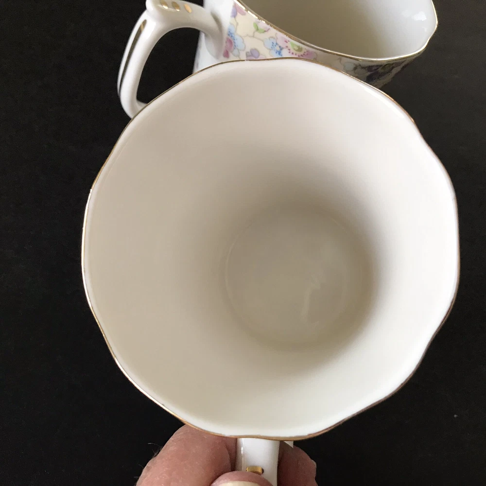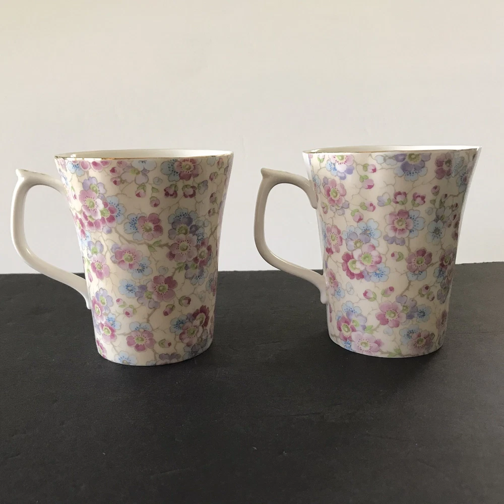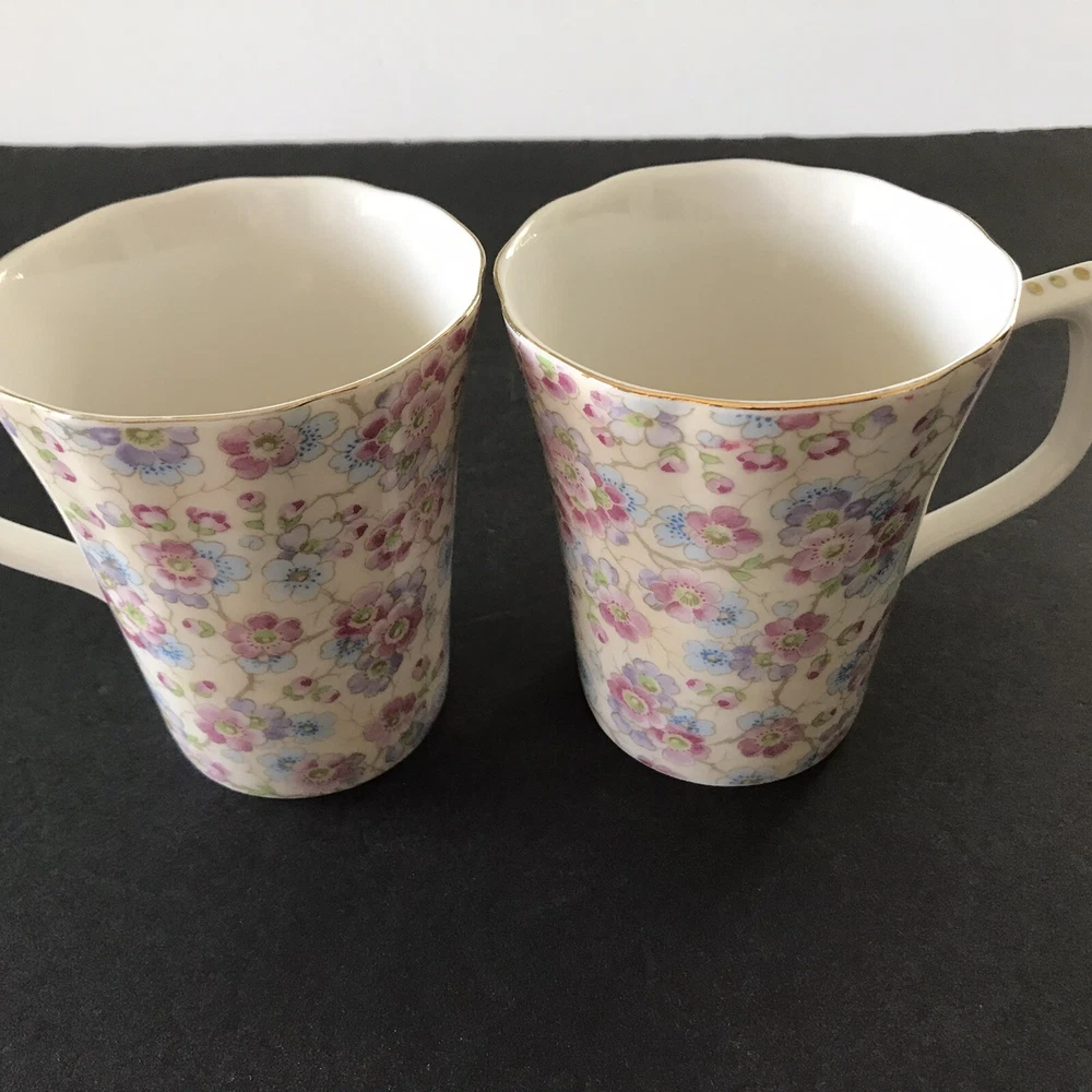 Grace's Teaware Two Pink Floral Scallop Rims with Gold Trim Tea Coffee Mugs Cups with Thumb Rest 9 fl oz Capacity Used in Good Condition: No Chips, Cracks, Crazing, Scratches or Staining Thank You for Viewing