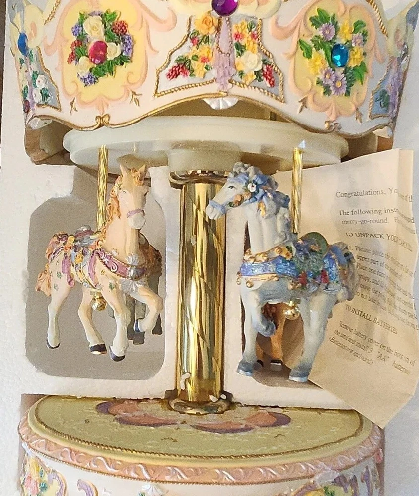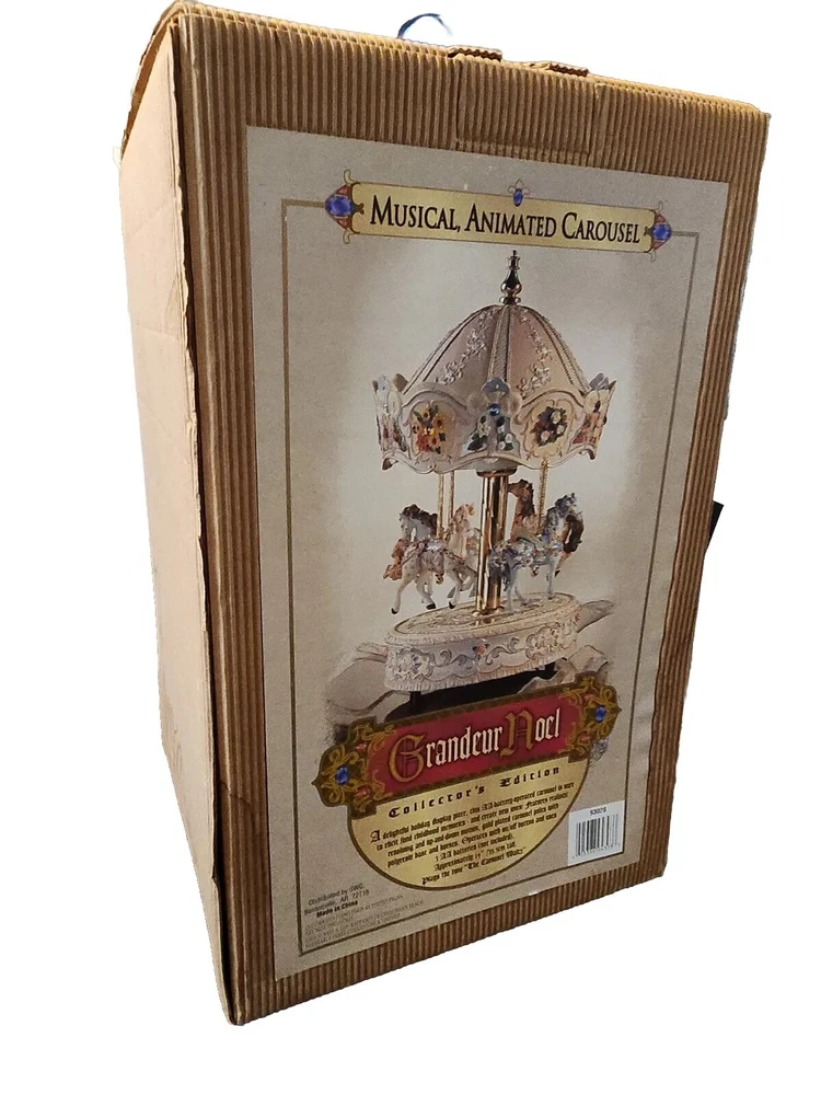 This Grandeur Noel 2000 Collector's Edition Musical Horse Carousel is a beautiful addition to any collection. The carousel features intricately designed horses that rotate to the tune of a delightful melody. This item was made in China and comes with free shipping. It is an ideal Christmas gift or birthday present for any collector or music box enthusiast. The carousel is not handmade, and it does not have any California Prop 65 Warning. The time period manufactured for this item is 1970-Now.
