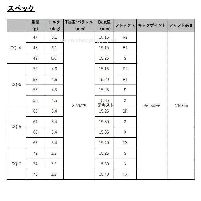 Returns We take returns up to 30 days after arrival. Returns must include all original items in undamaged condition with all original packaging. Returning a used item is subject to a minimum 50% restocking fee. Shipping We usually ship out within 5 business days , but keep in mind that our maximum timeframe is 7 days. We are always working hard to ensure your package arrives as soon as possible. Contact We can be contacted at any time through eBay messages if you have any questions, comments, or product requests. We will usually respond to you within 24 hours during business days and do our best to help you out! PRODUCT DETAILS Graphite Design Tour AD CQ Driver Shaft THERE ARE 14 DIFFERENT FLEX AND WEIGHT TYPES. PLEASE CHECK OUR STORE!! A model with a good grip, designed to feel like a whip and accelerate to impact. By increasing the rigidity of the entire body while increasing the rigidity of the hand, we have aimed to increase the sense of speed before and after impact, making it easier to turn the ball around. The light feel and powerful high trajectory enable strategic shots. TX flex is added to the 60- and 70-g weight range. Specifications Common: Length 46in / Kickpoint Mid-High /Tip .335 4R2: Weight 47/Torque 6.1/Butt 15.15 4R1: Weight 48/Torque 6.1/ Butt 15.15 4S: Weight 49/torque 6.0/Butt 15.25 5R2: Weight 52/torque 4.6/Butt 15.15 5R1: Weight 53/Torque 4.6/Butt 15.20 5S: Weight 56/ Torque 4.5/ Butt 15.25 5X: Weight 58/torque 4.5/Butt 15.35 6SR: Weight 62/ Torque 3.4/ Butt 15.25 6S: Weight 64/ Torque 3.4/ Butt 15.30 6X: Weight 65/ Torque 3.4/ Butt 15.35 6TX: Weight 67/ Torque 3.4/ Butt 15.40 7S: Weight 72/ Torque 3.2/ Butt 15.25 7X: Weight 74/ Torque 3.2/ Butt 15.30 7TX: Weight 76/torque 3.2/Butt 15.40 About Us At exclusive.shopping.japan, we are committed to offering high-quality products at the best prices possible. We take customer service very seriously. If you have questions about any item we sell, please send us a message. We stand behind every single product we sell and want to hear from you if are not fully satisfied with anything you receive from us. Payment All payments are handled by eBay through their platform. Shipping We ship via DHL , FedEx , and Japan Post based on the product type, size, and shipping destination. Order tracking information will be provided once the order has been processed for shipping. Delivery estimate is typically 4-5 business days . Please note that the delivery times provided by eBay are estimates, not guarantees. Business Days We are open Mondays to Fridays . Our office is closed on Saturdays, Sundays, and Japan Public Holidays . Disclaimer Import duties, taxes, and charges are not included in the item price or shipping cost. These charges are the buyer's responsibility. Please check with your country's customs office to determine what these additional costs will be prior to bidding or buying. Free eBay listing template designed by © dewiso.com .