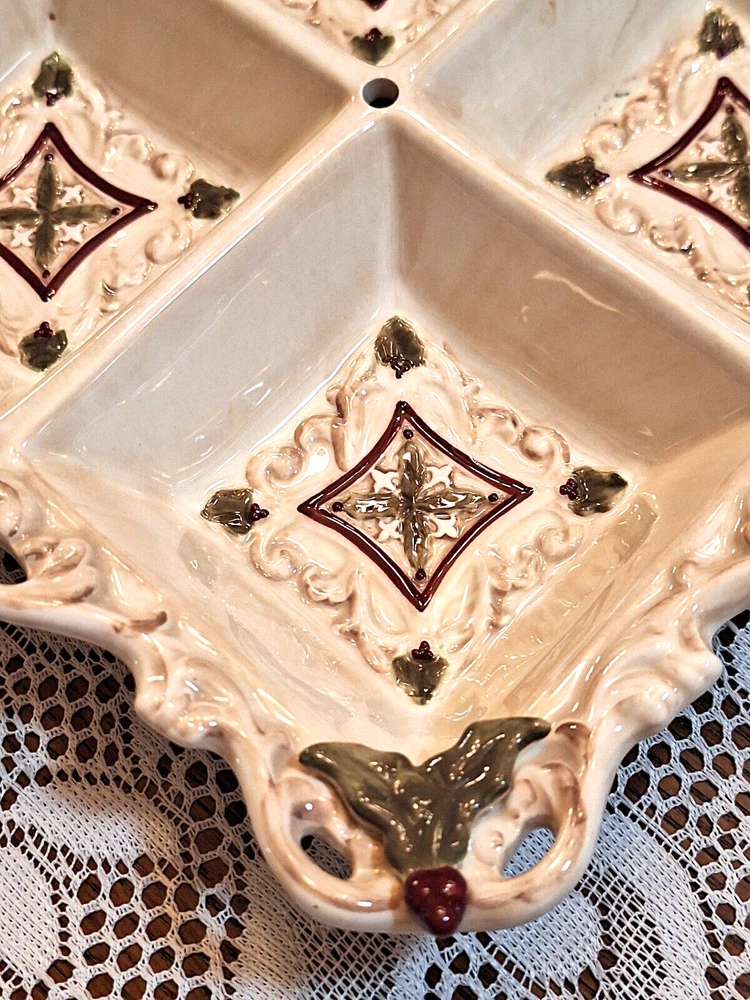 Add a touch of seasonal charm to your dining table with this 4-section ceramic condiment serving dish from Grasslands Road. The dish features a festive design of Christmas Holly in each corner and a lace edge, perfect for the holiday season. Measuring approximately 9.25 inches in length and width, and 1.5 inches in height, this dish is made of high-quality ceramic material that is easy to clean with a damp cloth. Ideal for adults, this condiment dish is a great addition to your kitchen or dining room décor. The dish is designed to serve condiments, dips, or other small dishes and is perfect for Christmas gatherings or any other seasonal occasion. This item does not require any additional parts and is ready to use. In Excellent condition. No chips or cracks. Preowned. Please see photos. Disclaimer : Many of the items I sell are vintage, antique or used, and may not be in perfect condition. They may have age-related wear, imperfections or a minor chip here and there. You may also see air bubbles in crystal items, which are naturally occurring. I will point out any and all of these to the best of my ability. Please review the photos provided carefully, read the description, and judge accordingly. All items are insured for the purchase price in case of damage due to shipping, so please do not throw away any of the original packing materials, the shipping box, or the broken item as these will have to be returned to Memory Lane Treasure in order to file an insurance claim for reimbursement of the item. The buyer is responsible for return shipping costs and reimbursement to the Buyer will not take place until the Seller has received all of the above. Please feel free to contact me with any and all questions you may have before purchasing an item—I am happy to assist. Thank you for visiting Memory Lane Treasure! Shipping and Handling : The misnomer regarding Shipping is that the amount charged only covers what it costs to ship an item by its weight. Shipping covers more than just the weight of an item, it also includes logistics costs such as packing supplies, inventory storage, transportation, and delivery. Due to the rising costs in our economy, Memory Lane Treasure has had to start charging for shipping; however, to keep the total cost as low as possible for our customers, Memory Lane Treasure has not yet started to charge a Handling fee, which is the cost of labor. Also note, that depending on the destination of the purchased item, eBay may calculate a different Shipping from what was listed by Memory Lane Treasure. Should that occur, it is not something done by our facility and Memory Lane Treasure should not be held responsible. 100% Customer Satisfaction is Memory Lane Treasure’s ultimate standard. Should a customer have any questions or concerns, they are always encouraged to contact Memory Lane Treasure before purchasing an item—I am happy to assist.