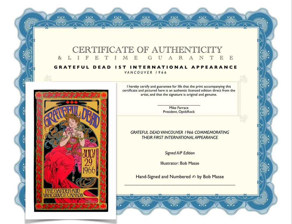 Grateful Dead Poster Special Artist Edition created to commemorate their first appearance outside the USA in Vancouver, July, 1966. Dimensions: 13 ⅞" x 24" Condition: Flawless Mint This artist's giclee print was created by Bob Masse for the official launch of Record Store Day, 2016. It has been signed in silver ink by Bob. This is an A/P print. Bob also created the cover for the special Record Store Day live 50th Anniversary Grateful Dead 180 gram vinyl album set of the recording from this show. The album cover is basically the upper 2/3 or so of this poster. Includes signed Certificate of Authenticity and Lifetime Guarantee (COA) This is an impeccably printed GICLEE on heavy coated stock It is annotated and signed in silver ink by its creator Bob Masse Depicts the historic first international appearance of the Grateful Dead in July 1966 In flawless mint condition, its beautiful art nouveau style fits well in any decor. Includes a signed Certificate of Authenticity and Lifetime Guarantee (COA) Legendary Canadian illustrator Bob Masse is one of rock's most seasoned and prolific poster artists, dating back to the '60s. But as his recent work shows, Bob's work is as cool today as ever. All the Masses we have are very nice -- ultra-mint with nice, bold signatures by Bob, mostly in silver ink. His mastery of typography and composition and his illustrative skill and imagination combined with our choice of great bands from Bob's collection make these nicely-priced posters excellent gifts for a fan of any of these bands, or a great source for decorators looking for fine art lithography with interesting and relevant themes and subjects in a wide variety of color pallets. This is good stuff -- hand-signed and nice to have around at a terrific price. Click Here for More Great Bob Masse Posters Visit My eBay Store: OptikRock Click here to make OptikRock one of your favorite sellers! Why Us: We pack correctly and ship quickly. We hold and combine orders. We accept all payment methods. We have a 14-day, no questions asked return policy. We love to answer questions. Our mission is your satisfaction. Click here to make OptikRock one of your favorite sellers! Why Us: We pack correctly and ship quickly. We hold and combine orders. We accept all payment methods. We have a 14-day, no questions asked return policy. We love to answer questions. Our mission is your satisfaction. _gsrx_vers_301 (GS 5.3.1 (301))