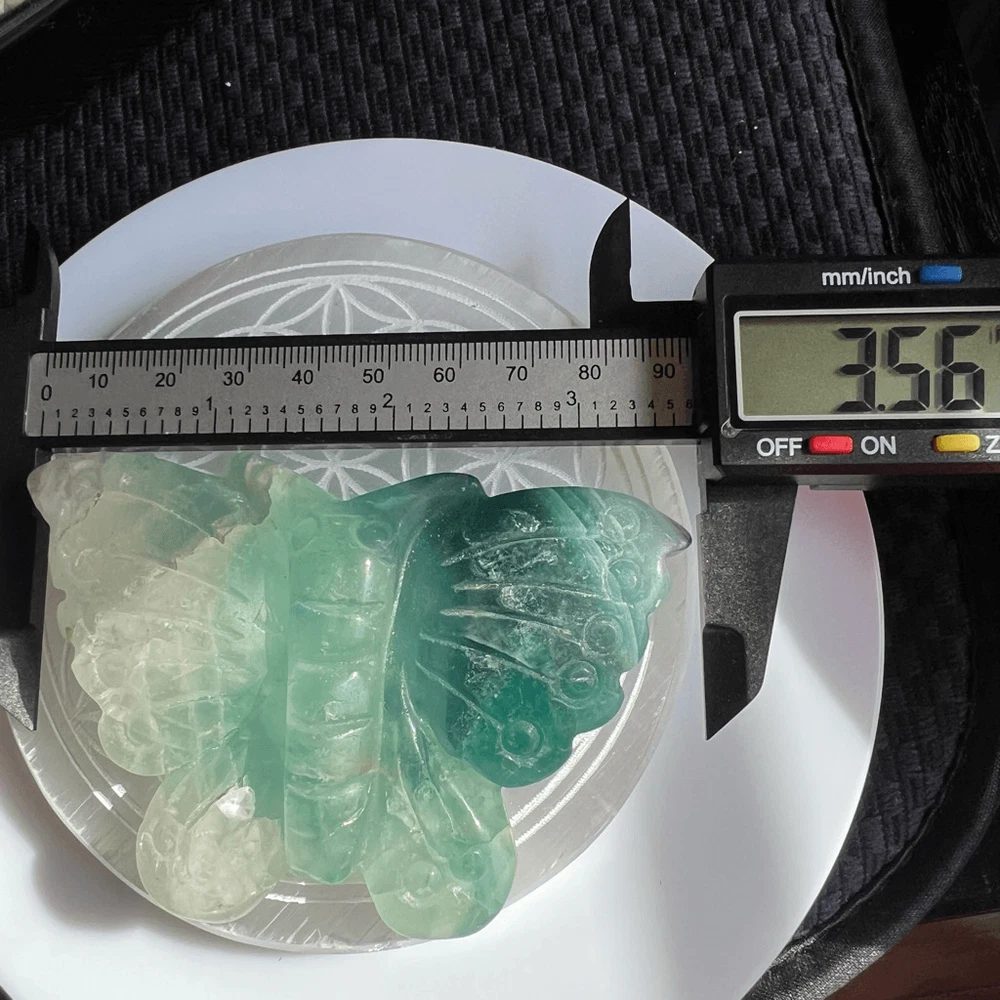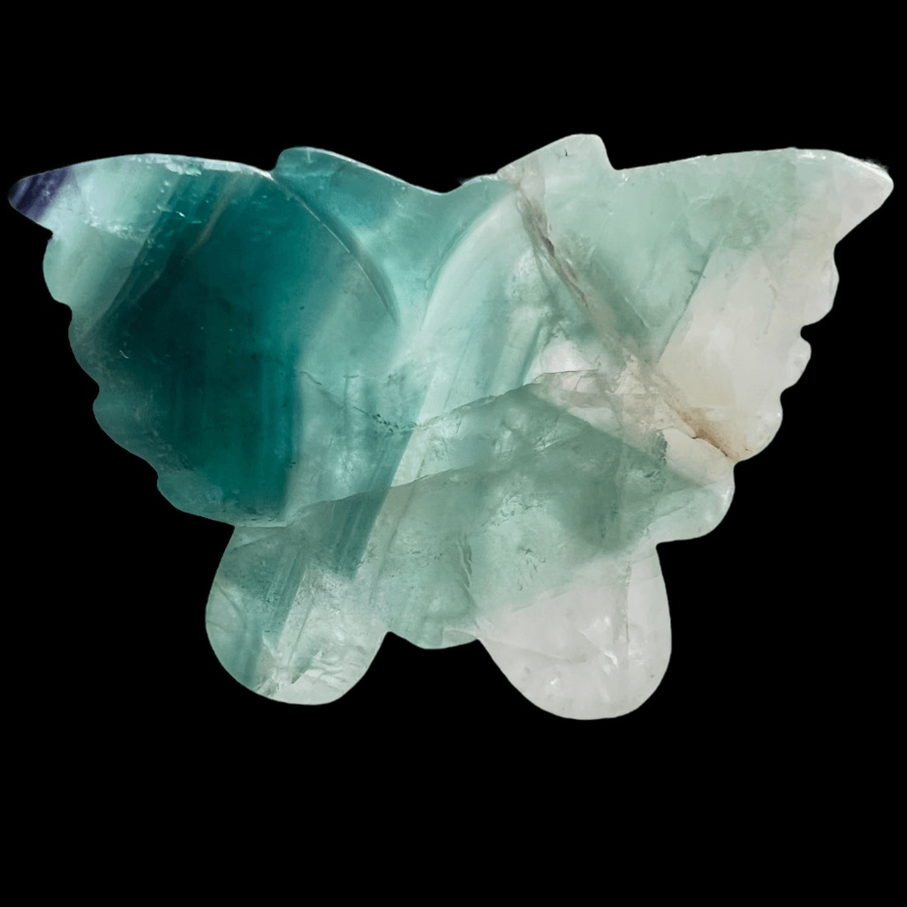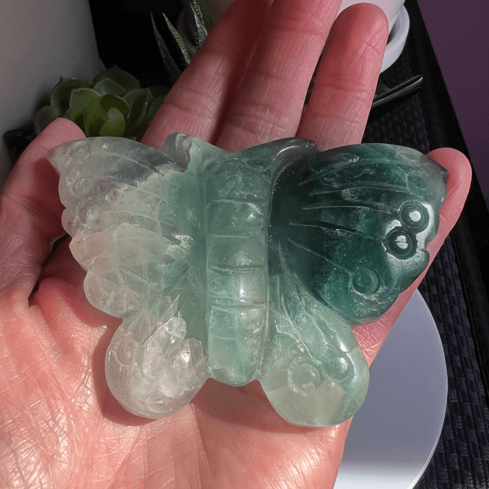 Green Banded Fluorite Crystal Butterfly The small fluorite crystal butterfly carving is a delicate work of art, meticulously crafted from a vibrant, translucent fluorite gemstone. Its iridescent hues of green and blue create a mesmerizing play of colors when held up to the light. Beyond its aesthetic charm, fluorite is believed to possess properties that promote clarity, focus, and emotional balance. This carving, in the form of a butterfly, symbolizes transformation and growth. It's said to bring about positive energy and help one release negativity, making it a beautiful and meaningful addition to any collection or space. Approximate Measurements 77.43 grams 3.56” x 2.32” x 0.54” Please note natural stones are one of a kind and tend to have imperfections. Certian Lighting may alter the crystal’s color display in photos. Smoke Free | Pet Free Environment