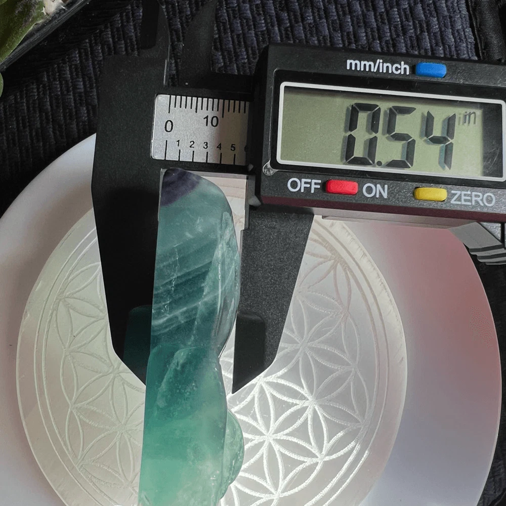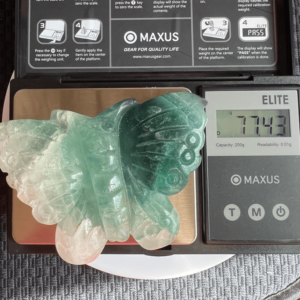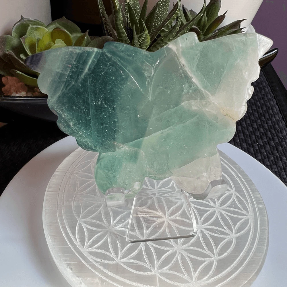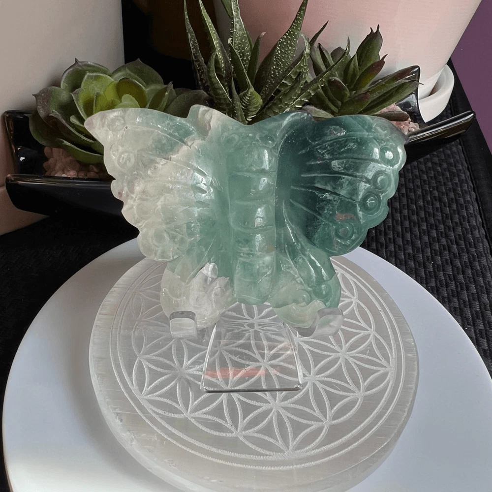Green Banded Fluorite Crystal Butterfly The small fluorite crystal butterfly carving is a delicate work of art, meticulously crafted from a vibrant, translucent fluorite gemstone. Its iridescent hues of green and blue create a mesmerizing play of colors when held up to the light. Beyond its aesthetic charm, fluorite is believed to possess properties that promote clarity, focus, and emotional balance. This carving, in the form of a butterfly, symbolizes transformation and growth. It's said to bring about positive energy and help one release negativity, making it a beautiful and meaningful addition to any collection or space. Approximate Measurements 77.43 grams 3.56” x 2.32” x 0.54” Please note natural stones are one of a kind and tend to have imperfections. Certian Lighting may alter the crystal’s color display in photos. Smoke Free | Pet Free Environment