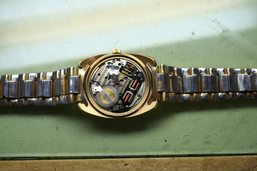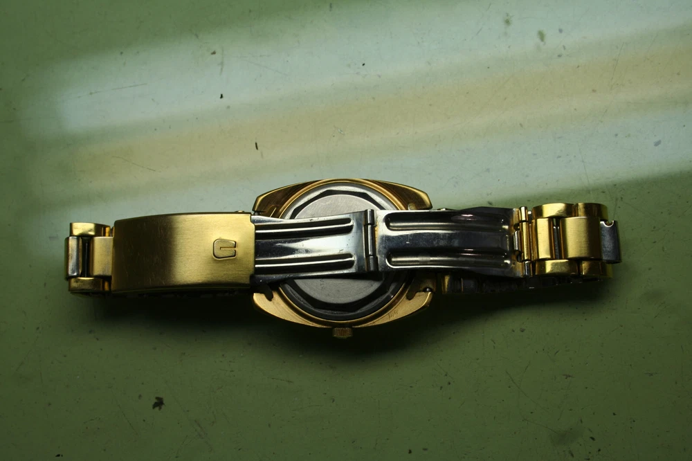 RARE FIND! Working Universal Geneve Unisonic Tuning-fork wrist watch with day/date. Clean dial, crystal, and case. Movement 253 -- 15 jewels 16ky Electro-plate -- model# 2-831-628 -- serial# 553105 Bracelet has original fold-over clasp and is in excellent condition.