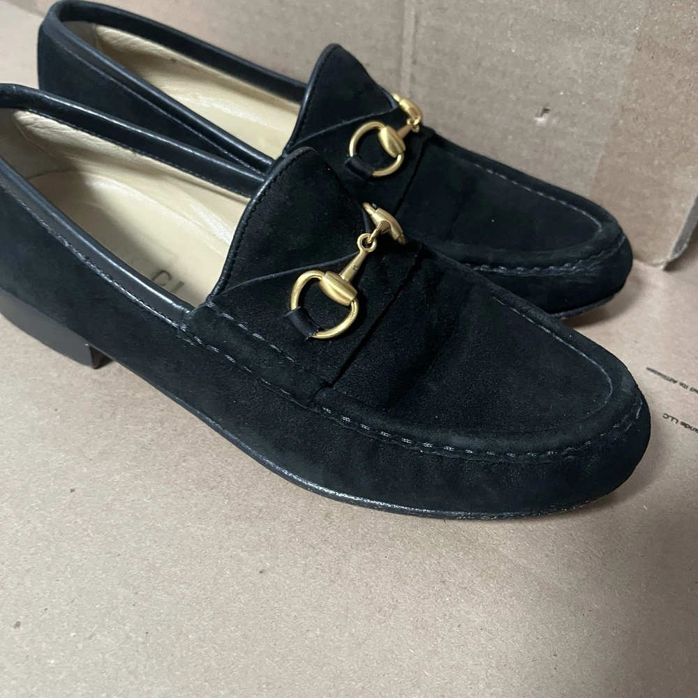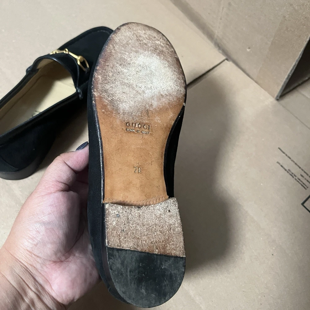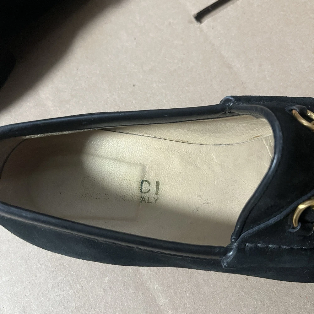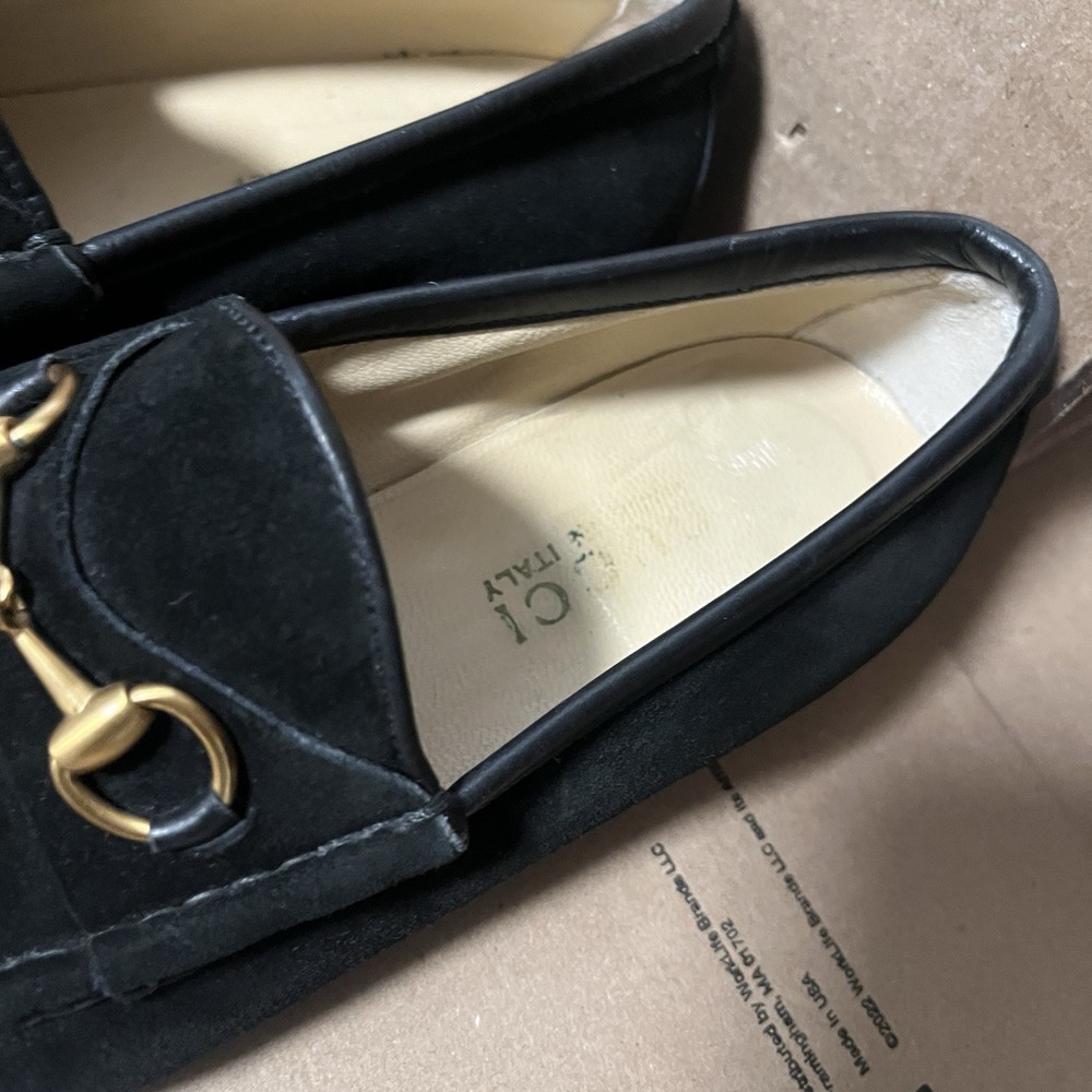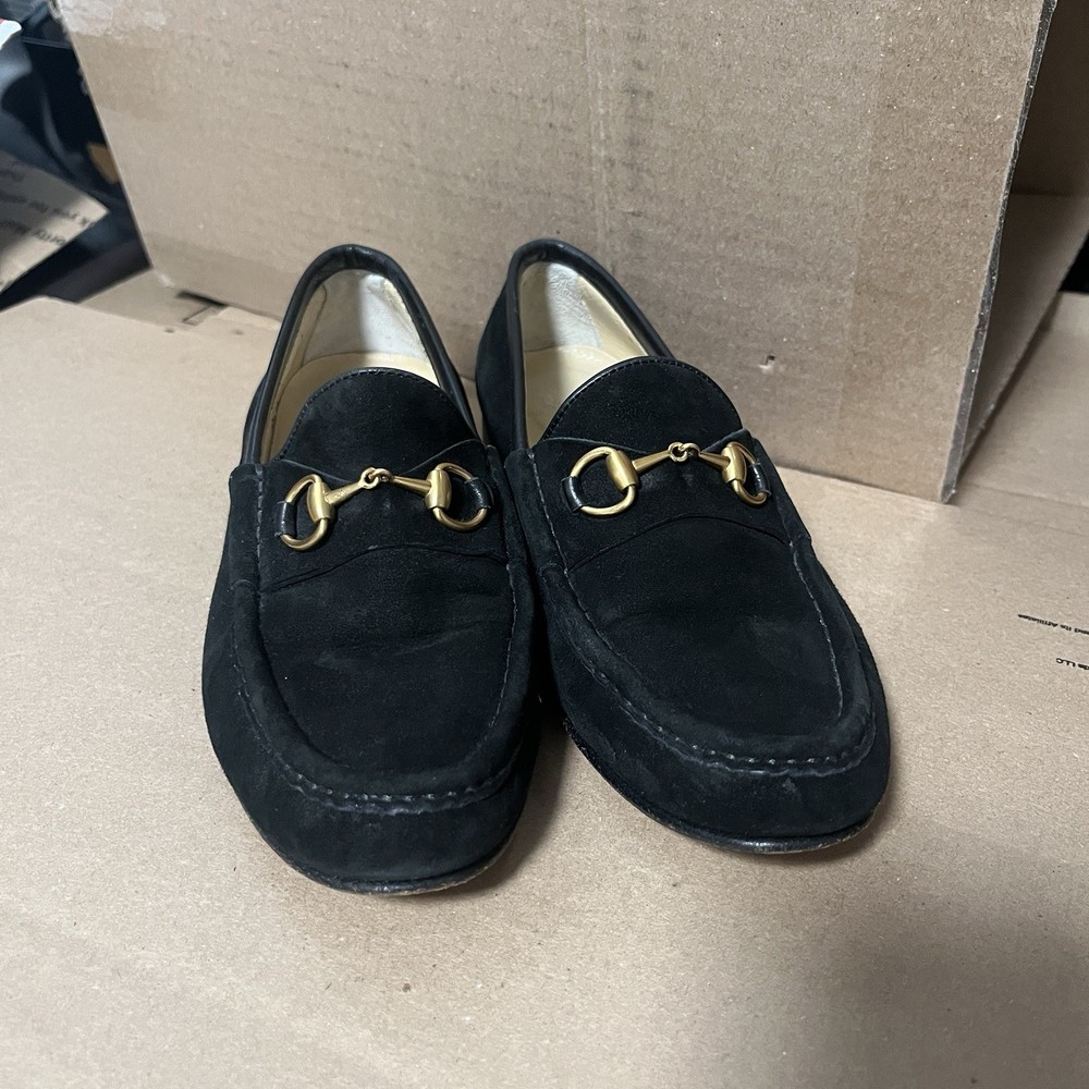 Elevate your wardrobe with these authentic Gucci 1953 Horsebit Loafers in rich black suede, size 7B. Made in Italy, these timeless loafers feature the iconic gold horsebit hardware, smooth leather lining, and leather soles. A classic, luxurious style that never goes out of fashion. Features: Authentic Gucci (stamped inside + outsole) Style: 1953 Horsebit Loafer Color: Black Material: Suede upper / Leather lining & sole Size: 7B (Women’s) 5.5 (Men’s) Made in Italy Gold-tone horsebit detail Timeless and elegant classic Gucci design Condition: Suede uppers: clean with normal light wear Interior: clean Outsoles: wear consistent with age (see photos) Heels: some wear but plenty of life left No rips, tears, or major flaws