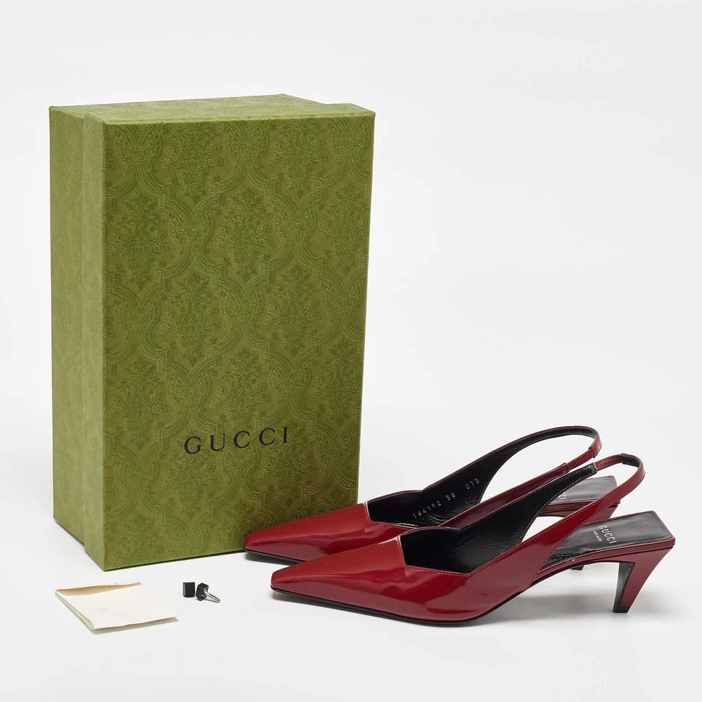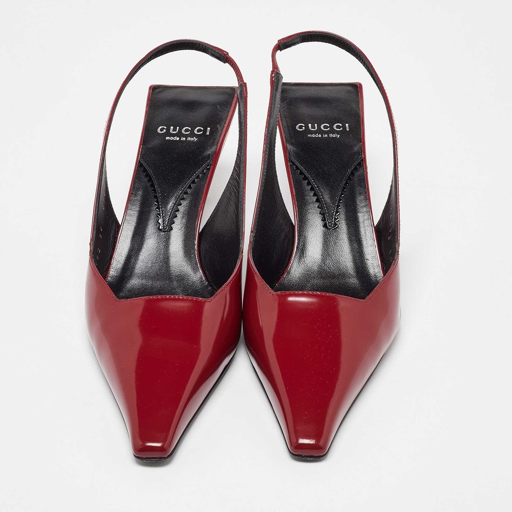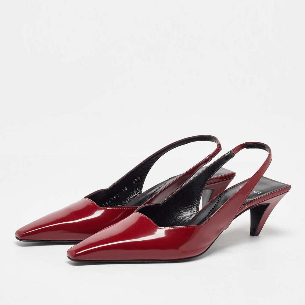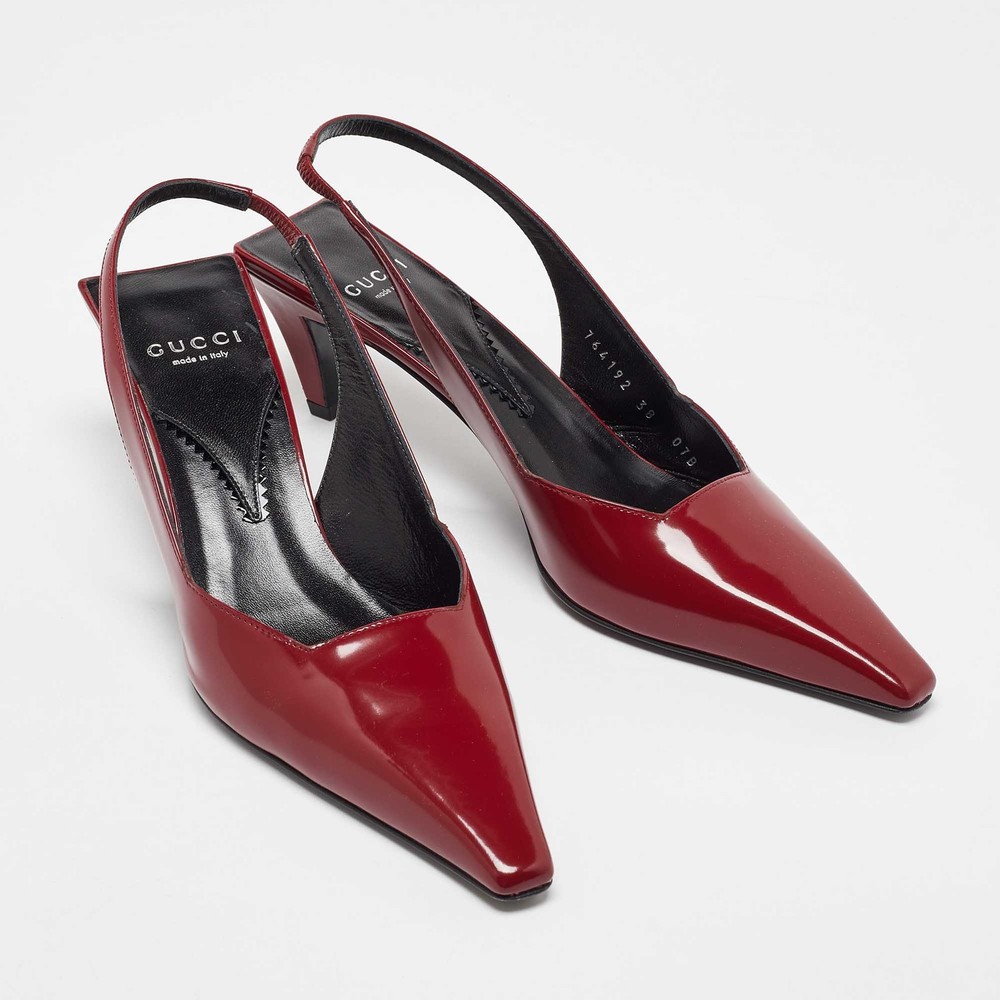 Experience timeless elegance with these Gucci slingback pumps. Crafted from burgundy patent leather, it features a smooth leather lining, insole, and sole for unparalleled comfort. The adjustable slingback closure, brand signature at the back and 6.5 cm heels complete the creation.Certified by The Luxury Closet - This item has gone through a detailed authentication process overseen by our experts. We offer a lifetime guarantee of authenticity on all our items. Import duties, taxes and charges are not included in the item price. These charges are the buyers responsibility. Please check with your country’s customs office to determine what these additional cost will be prior to buying. Our eBay Store About Us Contact Us Add to Favorite Sellers Gucci Burgundy Patent Leather Slingback Pumps Size 38 $326.7 Experience timeless elegance with these Gucci slingback pumps. Crafted from burgundy patent leather, it features a smooth leather lining, insole, and sole for unparalleled comfort. The adjustable slingback closure, brand signature at the back and 6.5 cm heels complete the creation. Product Details Brand Color Burgundy Dimensions Material Patent Leather Size 38 Outsole Width 8 cm Outsole Length 28 cm Heel Height 6.5 cm Includes Original Box, Extra Heel Tips Certified by The Luxury Closet This item has gone through a detailed authentication process overseen by our experts. We offer a lifetime guarantee of authenticity on all our items. How We Check The in-house team of experts at The Luxury Closet is highly trained to verify the authenticity and the condition of the luxury products. They ensure that only 100% authentic items are put on sale.The evaluation process is unique with its own mix of assessment criteria and differs according to the category. Each item is evaluated based on the following combination of hallmarks, hardware, stitching, symmetry, material, craftsmanship, stamping, codes, hologram stickers, and packaging. Our authenticators also check if the items have been modified or amended (e.g., aftermarket diamonds, replaced batteries, repaired bags, etc.) International Buyers Import duties, taxes and charges are not included in the item price. These charges are the buyers responsibility. Please check with your country’s customs office to determine what these additional cost will be prior to buying.