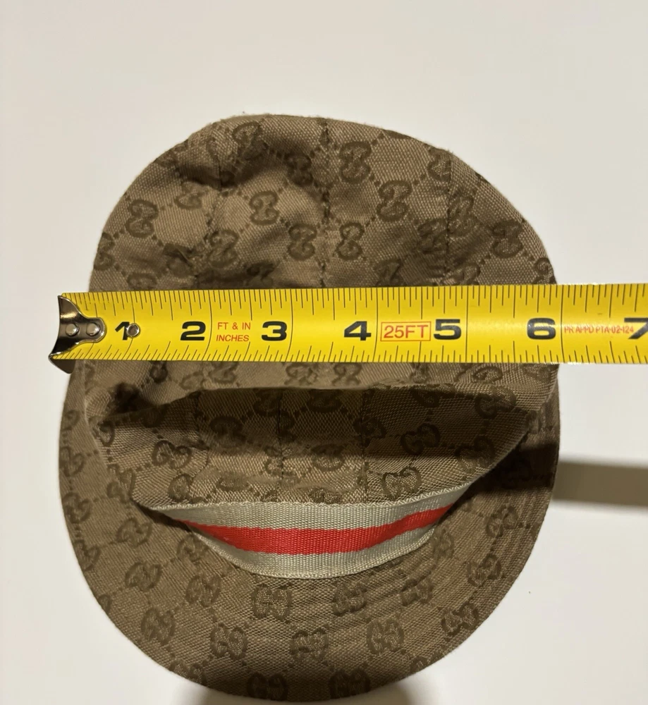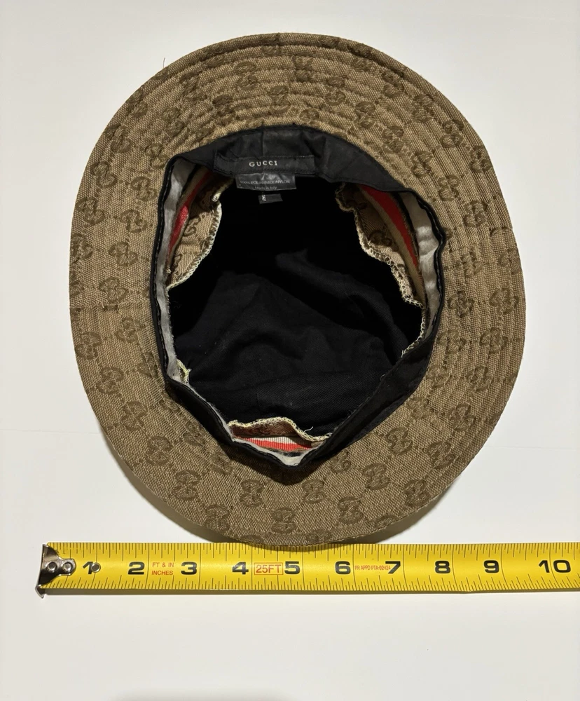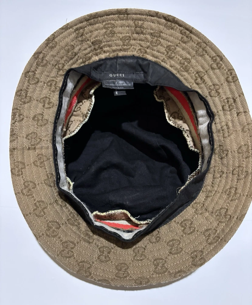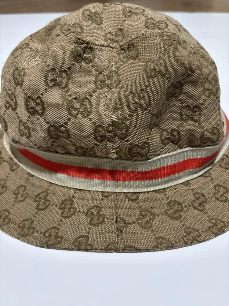 Elevate your style with this vintage Gucci fedora hat. Made with a durable nylon and polyamide fiber blend, this beige canvas hat is perfect for any occasion, whether you're traveling, attending a party, or just out and about. The hat features the iconic Gucci logo pattern and is lined for added comfort. This unisex L-sized hat is perfect for anyone looking to add a touch of Italian designer style to their wardrobe. Whether you're going for a boho, classic, or retro look, this hat is sure to complement any outfit. Don't miss out on the opportunity to own a piece of Gucci history. This amazing hat is preowned and may show lite wear.