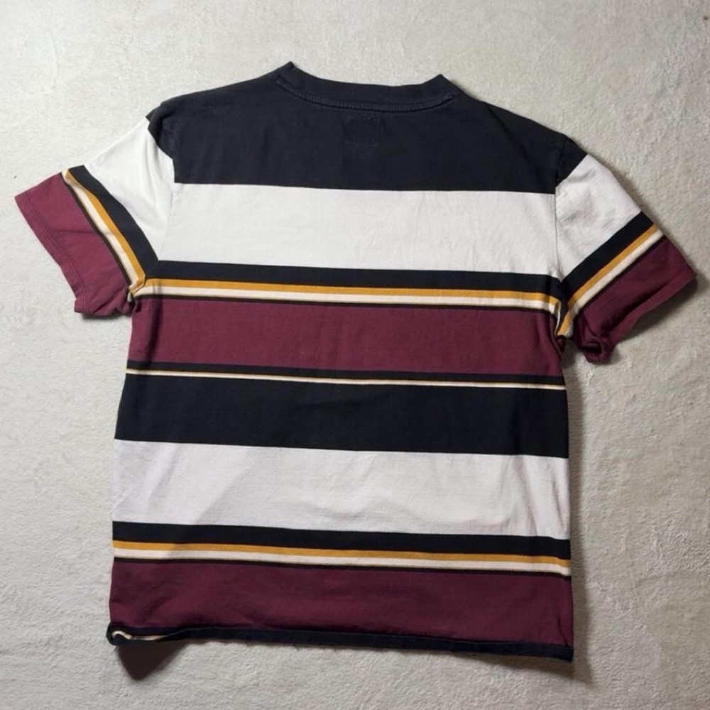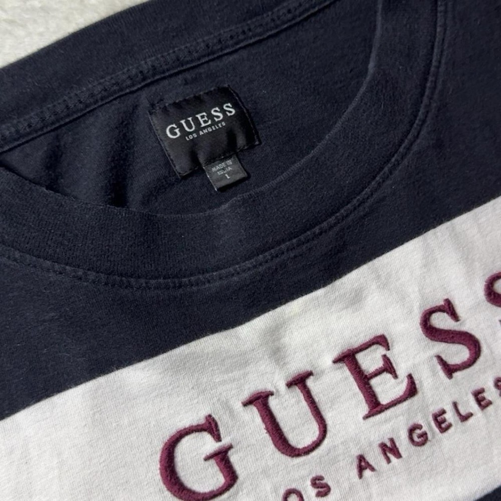 The product is a vintage Guess Originals tee t-shirt for men in size large, featuring an embroidered striped design with a crew neck and short sleeves. Made of cotton, the shirt is multicolor with accents of logos. It has a retro 90s vibe, perfect for the summer, fall, or spring seasons. The shirt is a piece of Y2K fashion history, showcasing the brand's California cool style with a hint of colorful preppy flair. Made in India, this heavyweight t-shirt offers a regular fit for a classic look.
