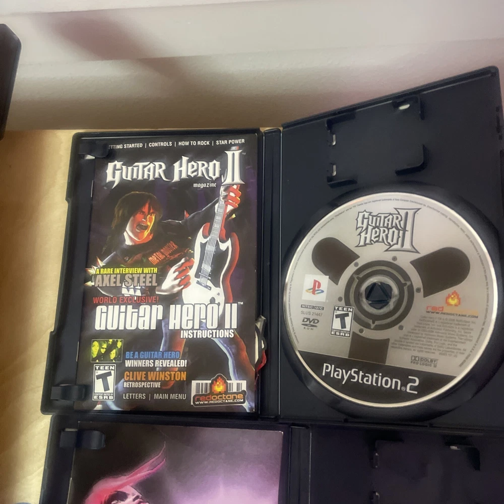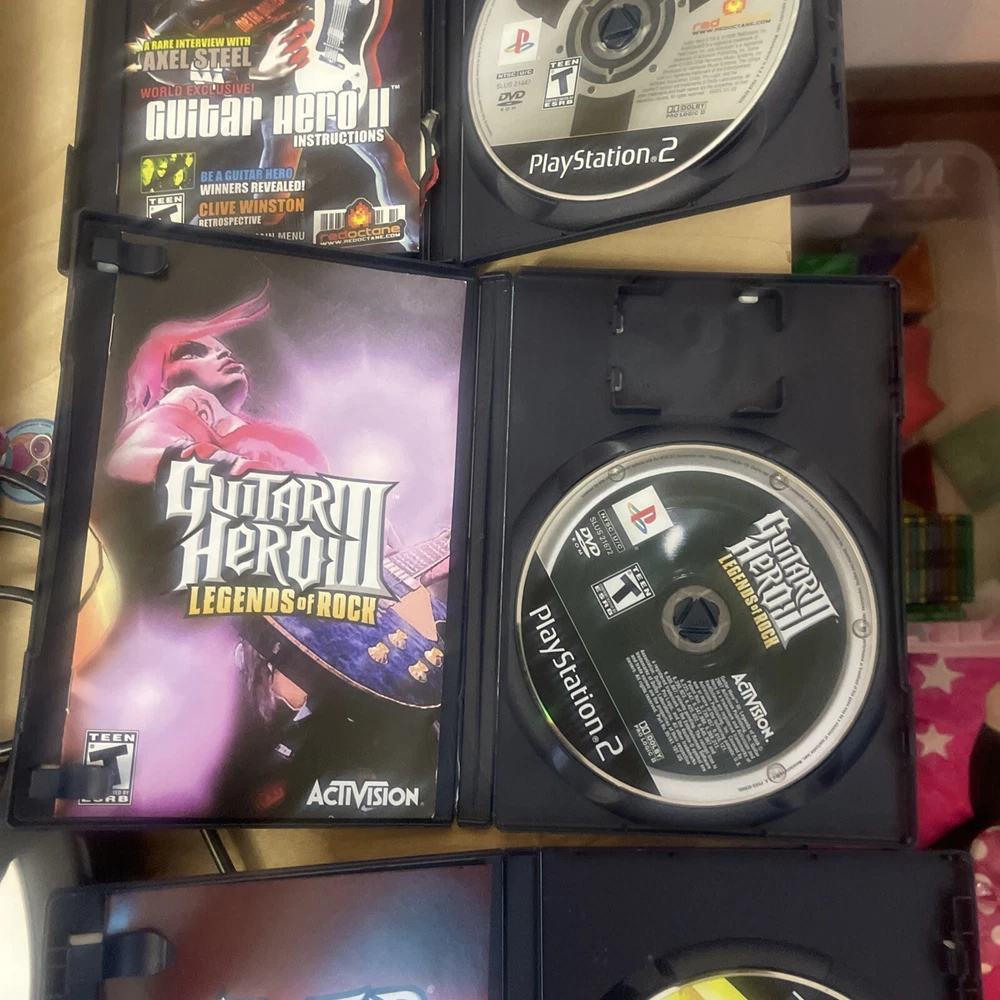 For sale: an essential starter pack for guitar hero. Everything is in overall great condition. The reverb bar is a little loose and there is something rattling in the guitar but it functions perfectly. The games are all CIB and in great shape. One game case has a small crack on the side of the case. Thanks for looking.