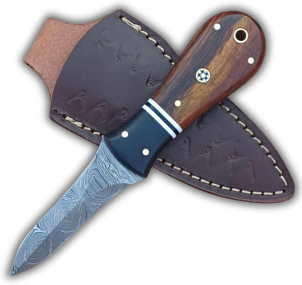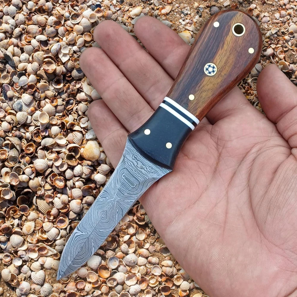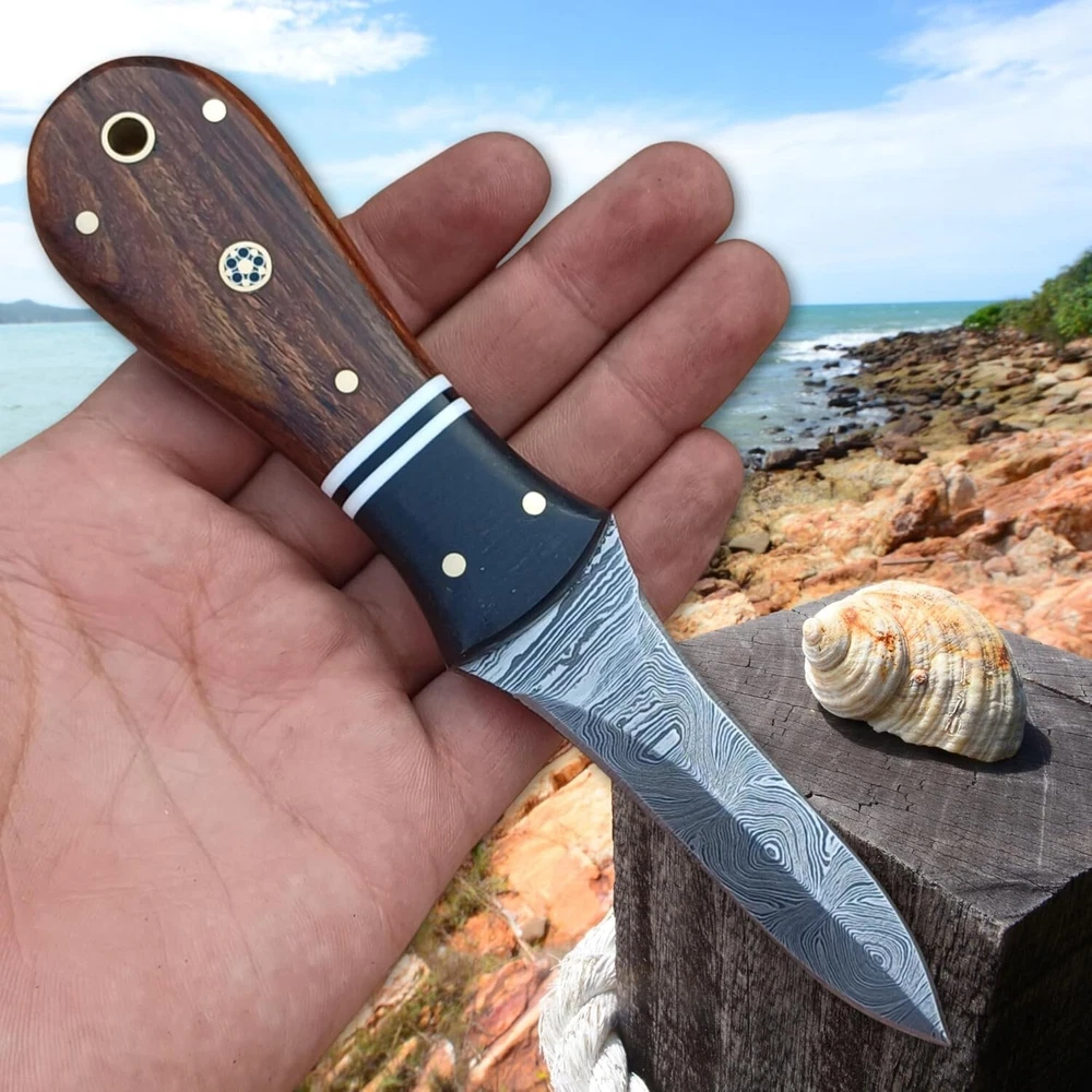 HANDMADE DAMASCUS SEA FOOD OYSTER SHUCKER KNIFE, SHUCKING TOOL WITH SHEATH DOUBLE EDGE FIXED BLADE KNIFE, 06.50 inch Sea Food Opener Tools Kit. HANDLE= Rosewood FIRE STORM PATTERN DAMASCUS STEEL ( 1095 AND 15n20 ) Hardness = 56-58 HRC 352 Layers forged by Hammer MEASUREMENTS OVER ALL LENGTH = 06.50 Inches HANDLE LENGTH = 03.50 Inches BLADE LENGTH = 03.00 Inches BLADE THICKNESS = 4MM SHEATH Custom Handmade Genuine Cow Hide Leather Sheath BUYING Before Bidding or Buying items please make sure that the State, Local and Federal Law of you country allow the parcel to reach you .if your purchase will be held by custom authorities in your country then I will not be responsible for any thing . you will have to deal with the custom of your country . no refund or refund will be given by me . so please make sure that you have all the documents to provide if custom demands from you .. I will only be responsible to provide every documentation needed from my side You will have to deal on your own with VAT or any other TAXES charged in your country you must be sure and certify that you are 18+ of age and are able to legally purchase and own an item ~: HAPPY BUYING :~