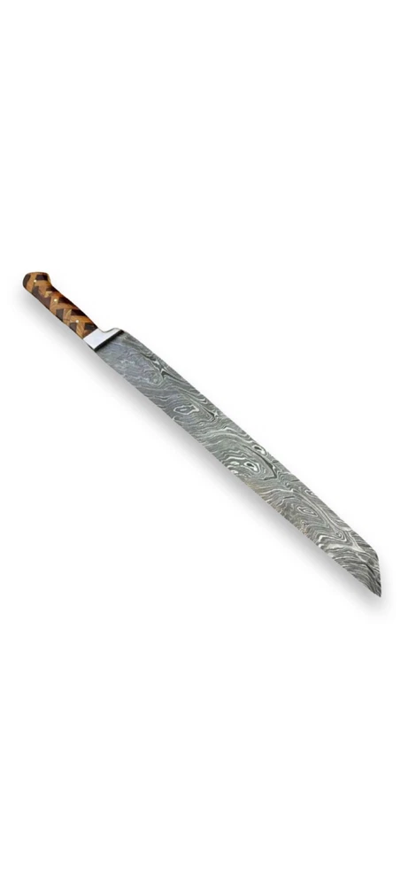 HAND FORGED DAMASCUS STEEL BUTCHER/BRISKE T CHEF KNIFE Blade of this knife has a nice file work and is made of 256 layers of stainless steel and high carbon steel with hardness 56-58 HRC. This process takes approximately 48 hours to complete. Specifications: Handle Material : ROSE AND OLIVE WOOD Lanyard Hole : ------- Blade Material : Damascus steel Overall Length :17.5" inch Handle Length : 5.5" inch Blade Length : 12" inch Layers: 256 Sheath Material: Leather Hardness: 56-58 HRC Package Includes: Knife and Leather Sheath Packing: Our products are packed after oiling and finishing as per tool requirements which are safe and reliable AGE RESTRICTION: WE DON'T SELL KNIVES TO ANY ONE WHO IS UNDER AGE 18. WHEN YOU BUY A KNIFE FROM US YOU ARE CONFIRMING THAT YOUR AGE QUALIFIES FOR THIS PURCHASE AND THIS IS A LEGAL PURCHASE. Warning: Take care when removing product from packaging. Keep fingers clear of blades. Keep away from children. We are not responsible for injuries caused by the use of this item. FEEDBACK POLICY: YOUR FEEDBACK IS VERY IMPORTANT FOR US, IF THEIR IS ANY KIND OF PROBLEM PLEASE GIVE US OPPORTUNITY TO SORT THE ISSUE
