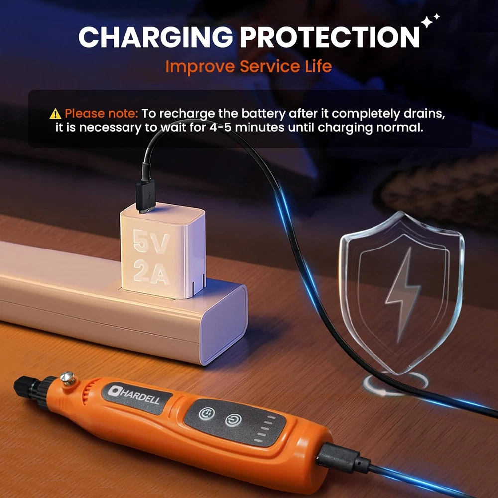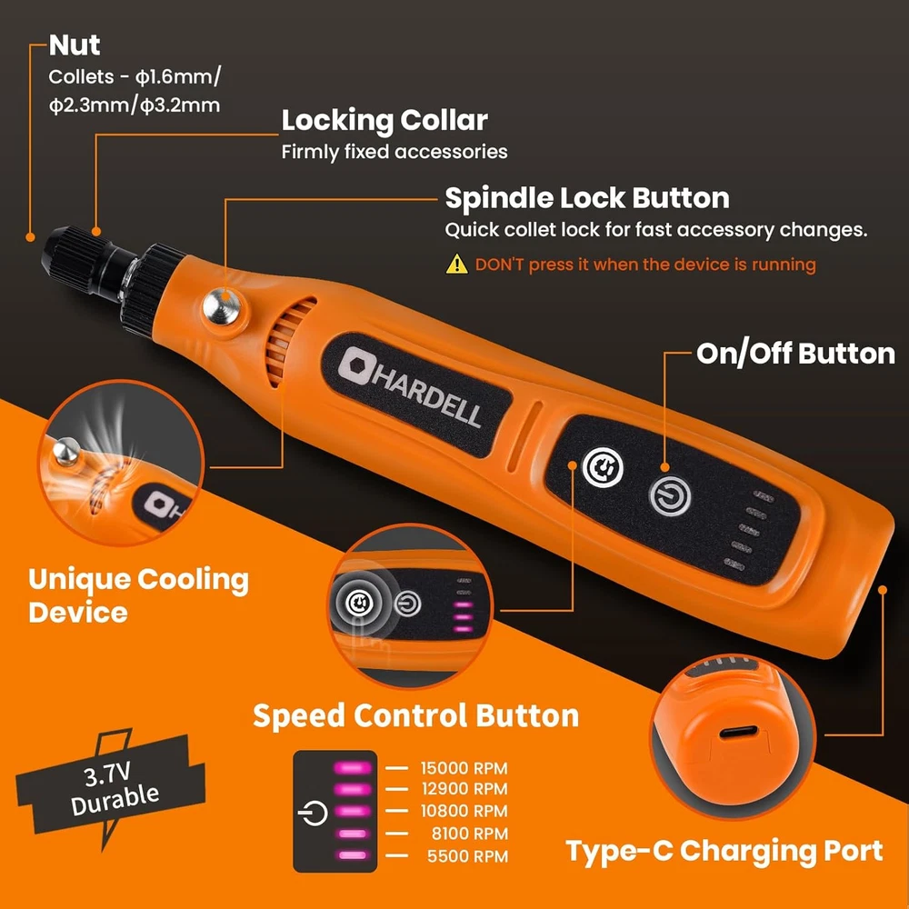 Store New Arrivals Add to Favorite View Feedback Contact HARDELL Mini Cordless Rotary Tool 3.7V, 5-Speed Rotary Tool Kit with 43 Accessories, Type-C Charging Power Rotary Tool for Engraving, Sanding, Polishing, Drilling, Grinding, Small DIY Crafts Description Item model number A41-HDCR0701-11 Style Cordless Rotary Tool 5-Speed Power Source Battery Powered Country of Origin China Battery Cell Type Lithium Ion Batteries Included? Yes Usage DIY Batteries Required? Yes Brand HARDELL Material ABS Minimum Speed 5000 RPM Number of Batteries 1 Lithium Ion batteries required. (included) Package Dimensions 6.77 x 4.25 x 1.85 inches Manufacturer HARDELL Item Weight 9.1 ounces Maximum Rotational Speed 15000 RPM Special Features Light Duty, Variable Speed, Cordless, Multi Use, Use While Charging Special Feature Light Duty, Variable Speed, Cordless, Multi Use, Use While Charging Color Orange Batteries 1 Lithium Ion batteries required. (included) Voltage 3.7 Volts Recommended Uses For Product Drilling, Engraving, Carving, Sanding, Polishing, Grinding Included Components 1* Cordless Rotary Tool 3.7V, 1* Tool Bag, 1* Spanner, 1* USB Cable, 42* Power Rotary Tool Accessories Size Small 【STAY UNSTOPPED WITH USE WHILE CHARGING】- Equipped with a 1M TYPE-C fast charging cable, our rotary tool can be used while charging, allowing you to stay in the creative zone without interruptions. Say goodbye to the frustration of forgotten charges. 【UNLEASH YOUR CREATIVITY WITH NEW POWER】- Featuring an upgraded motor, our rotary tool puts more power into your DIY projects. handling most of the small DIY materials, perfecting every detail, and personalizing special presents for your family. 【IMPROVE SERVICE LIFE WITH CHARGING PROTECTION】- Our HARDELL mini cordless rotary tool is built to last with enhanced battery durability. Its unique charging protection ensures a longer lifespan and optimal performance, let your creativity is never compromised. (Wait for just 4-5 minutes after a full discharge, until the rotary tool kit charge normally) 【CONQUER ANY SMALL DIY TASK WITH EASE】- With 5 adjustable speeds (5500/8100/10800/12900/15000 RPM), our mini rotary tool empowers you to effortlessly tackle any small DIY project. Even if you're a beginner, still can experience effortless control joy. the cloud-lightweight feeling reduces hand strain, allows you to work for hours without fatigue. 【YOUR VERSATILE DIY PARTERNE】- This rotary tool set includes a high-performance rotary tool with 43 of the most popular power rotary tool accessories for fine DIY work. Ideal for engraving,carving, sanding, grinding and polishing, this rotary tool cordless is perfect for creating resin,clay crafts, like a portable toolbox in the palm of your hand. Product Description The video showcases the product in use. The video guides you through product setup. The video compares multiple products. The video shows the product being unpacked. Like a portable toolbox in your hand NEVER MISS ANY BEAT WITH OUR CORDLESS ROTARY TOOL Handier , smaller , and more controllable . The mini cordless rotary tool will make your wonderful ideas come true. Charge while Using , which let you can fully focus on your creation. It has 43 rotary tool accessories . you can grind , carve , polish , engrave , drill , sand , clean and other amazing uses await your exploration. Freely exchange the multifunctional bits , which can be applied to different materials and projects. Your manual DIY advanture will be more effective and efficient . Mini Cordless Rotary Tool Small Handheld Sander Tool As a detail sanding tool, help you sanding all the tight spaces of your crafts Mini Cordless Rotary Tool lightweight Engraving Pen As an easy engraving tool, helps you carve your own works and names Mini Cordless Rotary Tool Jewelry Drilling Tool Kit As a jewelry drilling tool kit, helps you create unique jewelry that will wow everyone Mini Cordless Rotary Tool Mini Jewelry Polishing Tool As a lightweight Polishing tool, helps you build a smooth craft for anyone you care about Mini Cordless Rotary Tool Simple Power Grinding Tool As a powerful grinding tool kit, helps you grind the crafts/thin nails to make them perfect 1 Sanding 2 Engraving 3 Drilling 4 Polishing/Cleaning 5 Grinding Why does my drill bit keep falling off the cordless rotary tool? Usually it's because you have chosen the wrong collet. The drill bit has a shank diameter of 1.6 MM. Please choose the smallest collet (1.6 MM). Or it may be you did not tighten the black nut. Why does my sanding drum (not sanding band) keep falling off the mini rotary tool? Usually it's because you have chosen the wrong collet. The sanding drum has a shank diameter of 2.3 MM. Please choose the middle collet (2.3 MM). Or it may be you did not tighten the black nut. Why does my sanding band (not sanding drum) keep falling off the mini rotary tool kit? This is because the expansion screws on the top of the sanding drum are not tightened. Please refer to the installation instructions in the picture to adjust them. Why my HARDELL mini cordless rotary tool can't be charged after it runs out of power (or no charging indication)? To protect the battery, when the battery is exhausted (or in a low voltage state), you need to connect the charger (no LED display is normal) , and wait for about ten minutes before it can start charging normally ( LED display). Why does my rotary tool kit feel like it has no power? We recommend fully charging before use. If you need to use it for a longer time, you can try the function of charging while using (this function can only be used when the power is over 50%). HARDELL Cordless Rotary Tool, One Step To Become DIY Master Add to Cart Add to Cart Add to Cart Add to Cart Add to Cart Add to Cart Customer Reviews 4.2 out of 5 stars 1,299 4.3 out of 5 stars 564 4.3 out of 5 stars 9,186 4.3 out of 5 stars 164 4.1 out of 5 stars 134 4.6 out of 5 stars 90 3.5 out of 5 stars 52 Price $19.99 $ 19 . 99 $25.99 $ 25 . 99