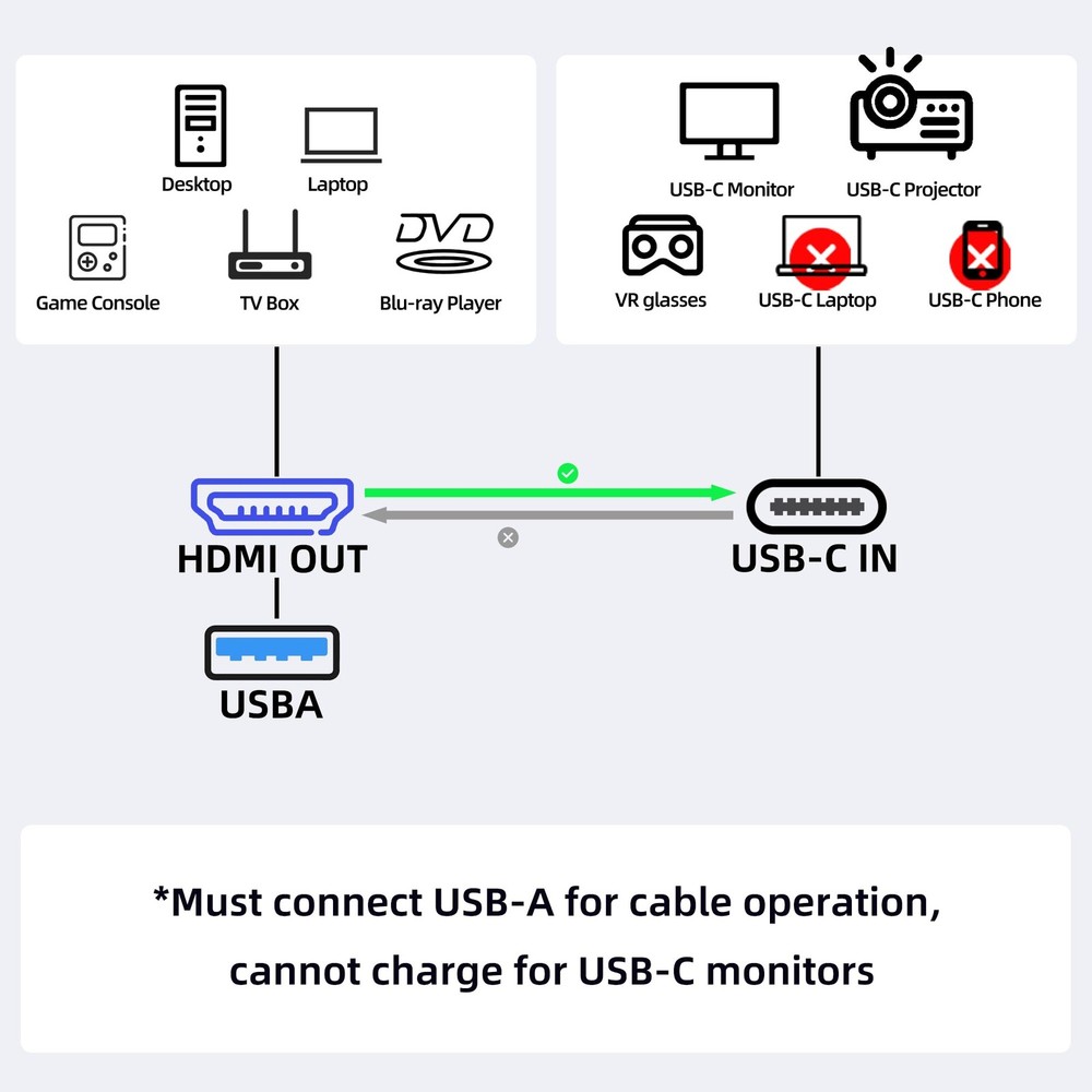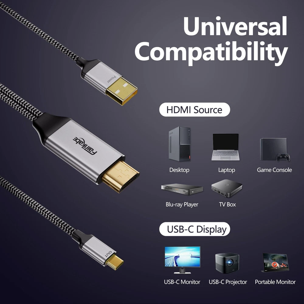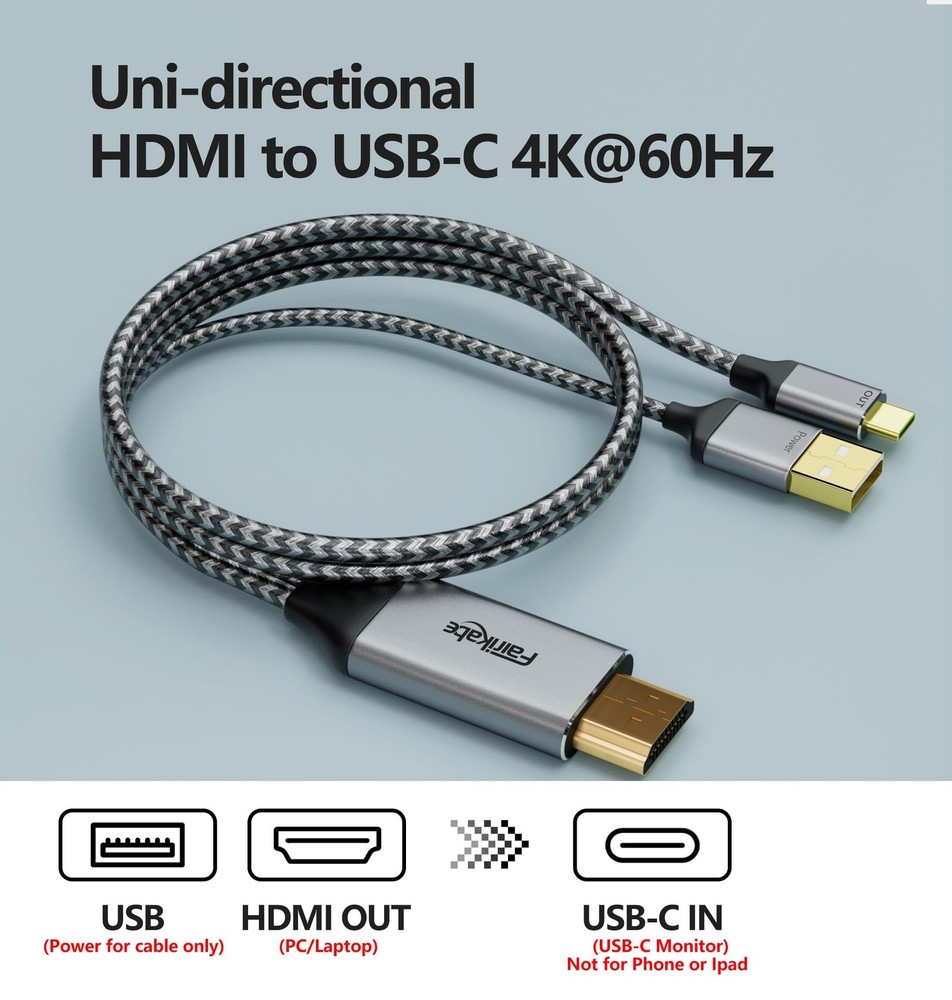 HDMI to USB C: from HDMI source to USB-C monitor, do not transfer from USB-C to HDMI.nreal air ar dell hdmi to usb-c cord hdmi input to usbc output portable monitor cable hdmi to usbc cable hdmi female output to usb c input hdmi input to usb type c hdmi source to portable monitor. hdmi input to usb c output hdmi to usb c hdmi to usb c converter bi-directional usb-c to hdmi cable hdmi to usb c cable hdmi output to usb c input hdmi to usb c adapter for monitor usb c to hdmi cord hdmi arc to usb cable for soundbar hdmi in to usb c out hdmi to usb-c cable hdmi to usb c female hdmi usb usb cable bi-directional hdmi to usb c bi-directional usb-c to hdmi ugreen usb c to hdmi cable hdmi to usb 3 cable hdmi male to usb-c female cable hdmi to usb to usb c cable laptop hdmi to portable monitor usb-c cable 2-in-1 hdmi usbc hdmi to usb c for dell monitor u2419hc display port output to type c input displayport+alt+hdmi+bidirectional hdmi to mini usb cable converter hdmi to usb c adapter cable 4k60hz 6.6ft, hdmi source input to usb type c output display converter, hdmi 2.0, usb powered, thunberbolt 3 compatible, for usb-c portable monitor hdmi to usbc-c bi-directional adapter hdmi usb universal cable usb c to displayport adapter powered type c to hdmi cable hdmi to usb-c cord hdmi to usb cable hdmi to usb c bidirectional cable hdmi usb c adapter usb to hdmi cable usb c to hdmi usb-c to hdmi cable usb type c to hdmi cable usb c to hdmi cable usb c to hdmi powered adapter hdmi to usb hdmi source to usb c display cable hdmi con usb hdmi and usb cable usb c to hdmi with charging hdmi to usb c adapter hdmi input adapter hdmi input to usb c cable hdmi to usb c hdmi to usb c adapter cable hdmi to usb c cable 4 feet hdmi output to usb c monitor hdmi output to usb-c input usb c input to hdmi output adapter usb type c to hdmi hdmi usb c and usb y cable usb type c cable to hdmi hdmi usb type c cable charge hdmi to displayport cable bidirectional hdmi to usb hdmi out to usb c in UNIDIRECTIONAL HDMI TO USB C: *Doesn't work with or ipad* Cable Only transfer from HDMI source out to USB-C in monitor display, do not transfer from USB-C to HDMI. Please insert HDMI male connector to HDMI output port of PC, laptop, graphic card, TV box, PS5, Xbox, Raspberry PI etc., and connect USB Type C male connector to Xreal Air, Nreal Air, Rokid, TV, monitor, portable monitor. Support laptop HDMI to USB C monitor, such as Dell Monitor U2419HC. *Not work for USB-C or USB-C laptop, Studio Display. For Studio Display please refer to B0CJC913G4 4K60Hz: This HDMI male to USB Type C male cable support resolution up to 4K60Hz, and backward compatible. *Game console with 4K content will only display in 1080P. Note: for DisplayPort source to USB C monitor, please refer to B0BW8QKFHK. * Update your firmware or driver if you see top image shown on the bottom IMPORTANT NOTES: NO USB-C hub, USB-C docking station, or USB-C drive should be hooked up to the USB-C end of this product since this USB-C port only supports VIDEO IN. Please ensure your display with USB-C input support DP Alt Mode(Video input), some monitor’s USB-C port only with power function. *USB power supply only for adapter's compatiblity, not for charging USB-C monitor or portable monitors, please connect USB-C monitor's own power supply adapter. Not work for Studio Display FOR PORTABLE MONITOR: This HDMI source to USB-C monitor cable works for portable monitors, even portable monitors with touch screen. Only for portable monitors without battery built-in, and please must connect the USB-A connector on HDMI side devices or additional charger HDMI TO USB C DISPLAY: Not a capture card or something like that, just transfer video & audio from HDMI PC/laptop/game console to USB-C monitor or dispays PLUG & PLAY: Plug-n-play, driver free, no more driver installation required. USB powered, can be connect to any USB port or wall socket to get 5V 1A power, power supply above 5W is not allowed. SUPER DURABLE: HDMI to USB-C adapter with gold-plated connectors, premium aluminum casing and nylon braided cable. Ensure the stable transfer and longer service life.