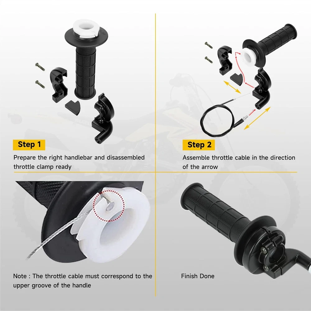 HIAORS 7/8" Mini Bike Throttle Cable Assembly Kit Compatible with A-Black Product Details Material: Plastic, Metal Brand: HIAORS Color: A-Black Product Dimensions: 11.02"L x 7.87"W Special Feature: Easy to Install Included Components: Cover Theme: Motorcycle Package Type: Flat Free Package (FFP) Unit Count: 1.0 Count Number of Items: 1 Manufacturer: HIAORS Part Number: HO-THC-BK Item Weight: 14 ounces Country of Origin: China Item model number: HO-THC-BK Special Features: Easy to Install Batteries Included?: No Batteries Required?: No Material: Plastic, Metal Brand: HIAORS Color: A-Black Product Dimensions: 11.02"L x 7.87"W Special Feature: Easy to Install StyleHandle Type: ClassicLever ShapeHandle Material: RoundRubber Fitment: 7/8" twist throttle cable handle kit fits for 50cc 90cc 110cc 125cc 4-Stroke pit dirt bike, mini bike, ATV, motorcycle and motocross, such as SSR Coolster Apollo CRF50 Roketa X-treme Coleman Baja Massimo Realtre* TrailMaster equipped with Predator 79cc 80cc 97cc 100cc 212cc 196cc 224cc 5.5hp 6.5hp OHV clone engine Compatible with: 7/8 mini bike throttle assembly fits for Coleman CT200U/ CT200U-EX/ BT200X/ B200R/ RB200, Coleman CT100U/ CC100X, Axis M200, Mini Baja Warrior Heat MB200 & MB165/ Baja Dirt Bug (Blitz, Dirt Bug, Racer, Viper) DB30, Massimo MB200, TrailMaster MB200, Monster Mega Moto MM-B80 MM-B105 MM-B212 Mini Bike, Motovox MBX10 MBX11 MBX12, Falcon 200 Mini Bike, Realtre* RT200 RT100 Pit Dirt Bike 4-Stroke SSR125 Coolster Apollo CRF50 Roketa X-trem* Size: The total length of mini bike throttle cable is 50 inch(127cm) / Out conduit measures 45 inch (1148 mm). This mini bike throttle cable is suitable for most pit dirt bike motorcycles and minibike with 7/8 inch handlebar Package Includes: 1 x throttle grips + 1 x twist throttle + 1 x black throttle cable for mini bike + 1x on off kill Switch +1 x throttle housing clamp +1 x wrench + 6 x tie +1 x motorcycle cruise assist