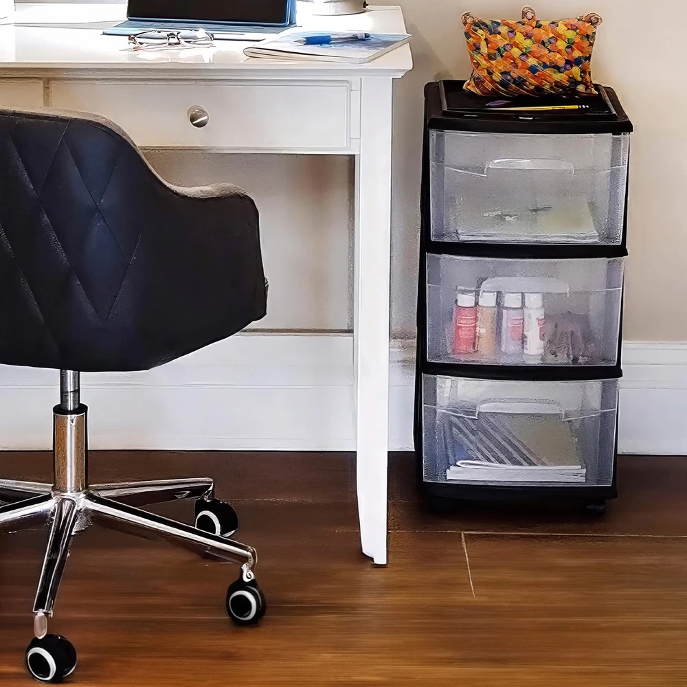 Cart Masterpiece: Perfect the art of hiding your chaos with the HOMZ storage carts with drawers. This plastic drawer cart is made to fit anywhere you need organizing power, whether at home or work. For Small Spaces: This roomy plastic organizer measures 12.5" L x 14.25" W x 25.5" H with the interior of each drawer measuring 12.31" L x 9.92" W x 6.85" H. It Will Fit: Our rolling drawer organizer cart features clear plastic materials and removable wheels for easy transportation. Use them to store toiletries, office supplies, crafts, and more. From Trash to Treasure: Life in plastic is fantastic when the plastic is made from 90% recycled materials. We know the earth is important to you, so our cart is good for your items and the planet. HOMZ for Your Home: From organization to storage, we have the container that you are looking for. Allow us to make your house a HOMZ.