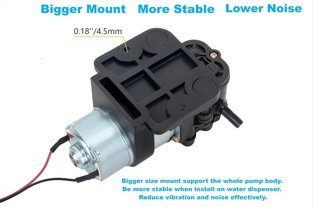 Rated Volt: DC 12V, Max flow rate: 1.6L Pressure: 35 psi. It doesn't mean 1.6L/min at 35PSI.Self priming function allows it to be mounted above water tank, Vertical Suction Lift: 3.3ft (1m). Amp Draw 0.35-0.5A Please do not use AC power source. This water dispenser pump come with pipe quick connect elbow, RO water tubing,heating shrink tube and screws. Full accessories make the installation easily.Inlet and Outlet: 1/4’’ . Size: 4.93’’x 3.1’’ x 2.38’’. Item weight: 500 grams Pump with self-priming function: Max. Vertical Suction Lift: 6.5ft(2m). Max. Flow: 1.6LPM, Head(High Lift):≥100ft (30m). Built-in pressure valve automatically shut-off when the pressure exceed. Bigger size mount support the whole pump body, more stable when install on water dispenser, reduce vibration and noise effectively. Please connect the water pump correctly. Red wire for positive pole and black wire for negative pole. Product Description DC 12V Water Dispenser Pump This water dispenser pump has self priming function, it is specially designed for bottom-loading Water Dispenser, Water Coolers, Water Purification , Hot & Cold Water Dispenser, Refrigerator, Ice Maker, Coffee Machine, Fish tank. Why do I choose it? Easy insatllation Stable performance Food Grade, Long life This water pump has built-in pressure valve automatically shut-off when the pressure exceed. Protect the pump and avoid damage to water dispenser. High-quality motor ensure durable and stable work. Low heat: The pump can work continuously for a long time and won't be hot. Safe Food Grade, Stable performance, Long life Rated Volts DC 12V Amp Draw 0.35-0.5AMP Max Flow rate 1.6 L/min Pressure 35PSI Vertical Suction 4.2ft (1.3m) Working Temperature Range 0~70°C /32~158°F Noise <35DB Inlet/Outlet 1/4" (6.5mm) Pressure Over-load Protection Built-in pressure valve automatically shut-off when the pressure exceed. Effectively protect the water dispenser and pump and avoid leakage caused by excessive pressure. Bigger Mount More Stable Lower Noise Bigger size mount support the whole pump body, more stable when install on water dispenser, reduce vibration and noise effectively. Full Range of Accessories Easy to Install The pump come with qucik connect elbow, silicone tube,screws and heat shrink tubing for your easy and quick installation on water dispenser. Package Includes: 1 x Water Dispenser Pump 2 × 1/4" Pipe Quick Connect Elbow 1 × 1/4"RO Water Tubing 1m 1 × Heat Shrink Tube 2 x screws 1x manual Easy Replacement for Your Drinking Water Equipment This pump will be a good replacement if your water dispenser's old pump is similar to it. It is quite and durable, give more smooth operation on your water dispenser. Warm Tips: Before make deicision, you may check the pump size , voltage, flow rate , loading current , suction lift and flow head. If they are simialar to your old pump. It should be a good replacement for your water dispenser. Please connect the pump correctly. Red wire for positive pole and black wire for negative pole. If the connector of leads is same, just plug in the connector of water dispenser. If not ,cut the power cord from old pump and connect it to the new one. It is better to leave the red wire and black wire about an inch from the new pump. Please try to keep the pump stable when install. Improper installation may generate vibration and noise during operation. The pump can not run continuously more than 6 hours.