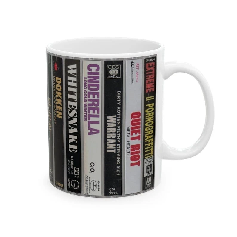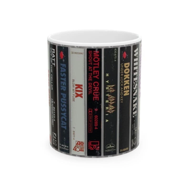 Hair Metal Cassette Cover Ceramic Mug, Music Lover Gift, Retro 80s Coffee Cup
