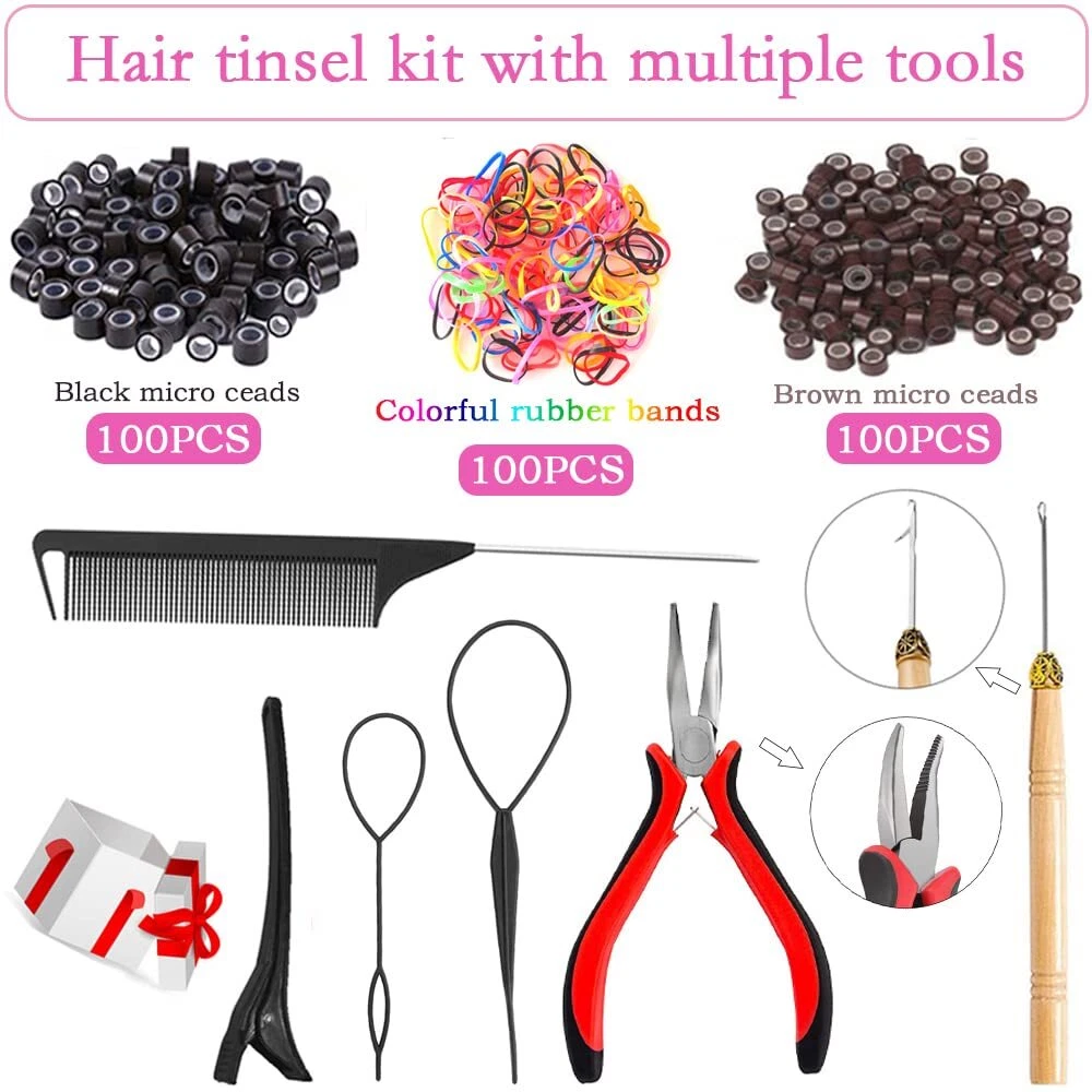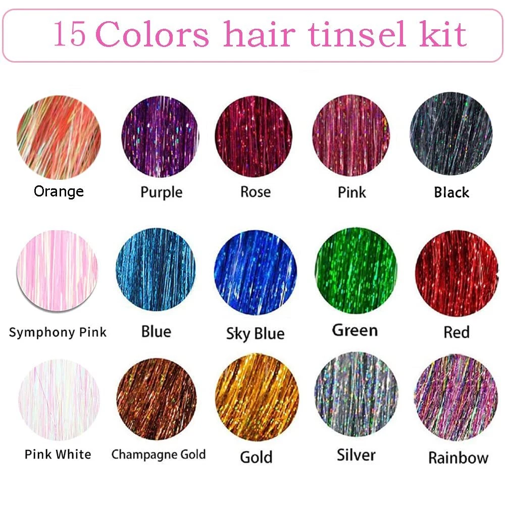 Hair Tinsel Kit with Tools: 15 Colors 4200 strands hair tinsel , 1 piece crochet, 1 piece plier, 200 pieces micro silicone link rings beads (100pcs black + 100pcs brown), 2pcs Ponytail Hoop Tools,1pc Rat Tail Comb,1piece hair clips, 1 pack of Colorful rubber bands as a gift. Definitely worth it for the money. Hair Tinsel Safe: Hair tinsel made by 100% high quality polyester fiber hair tinsel. Safe, , tasteless and will not fade. Can be washed, blow-dried, straighten, ironing,cut into different length according to your hair extension requirements. Each color tinsel is packaged separately, which is more easy to identify and use. Fairy Hiar tinsel Easy Match Your Style: The hair tinsel is the latest trend in hair fashion and the perfect hair accessory for girls of all ages.Adds amazing colors and sparkle to hair. create charming and eye-catching effect , you get tons of compliments. Tinsel Hair Extensions: The hair tinsel strands 48 Inch are long enough , cut into different length according to your hair extension requirements.15 Colors to Choose:Pink White, Symphony Pink, Orange, Gold, Silver, Pink, Violet, Sky Blue, ,Champagne Gold , Rose Red, Black, Red, Blue, Green, Rainbow.a variety of colors meet the various styles of fairy hair, Release Your Charm. Service: If you have any question or problem about the Hair tinsel kit, We provide 24-hours .