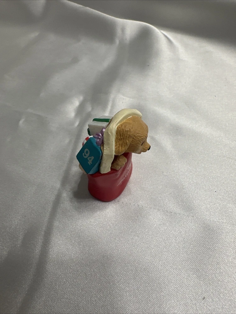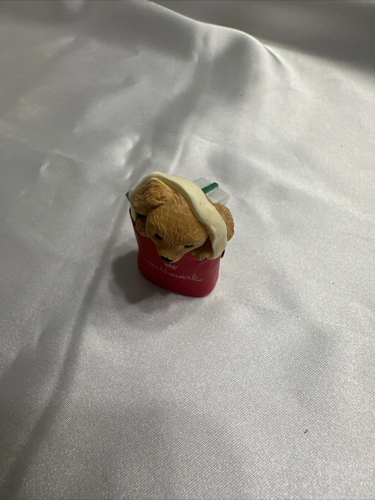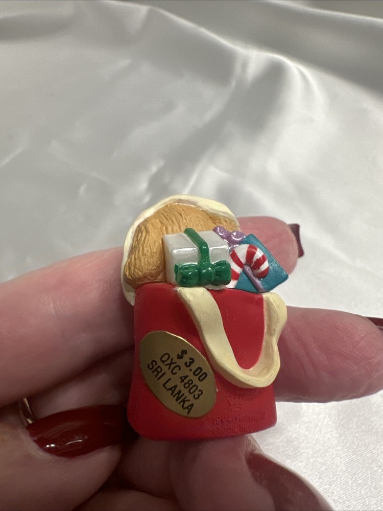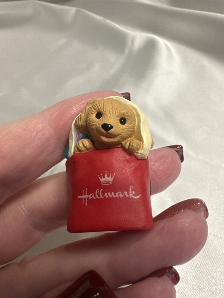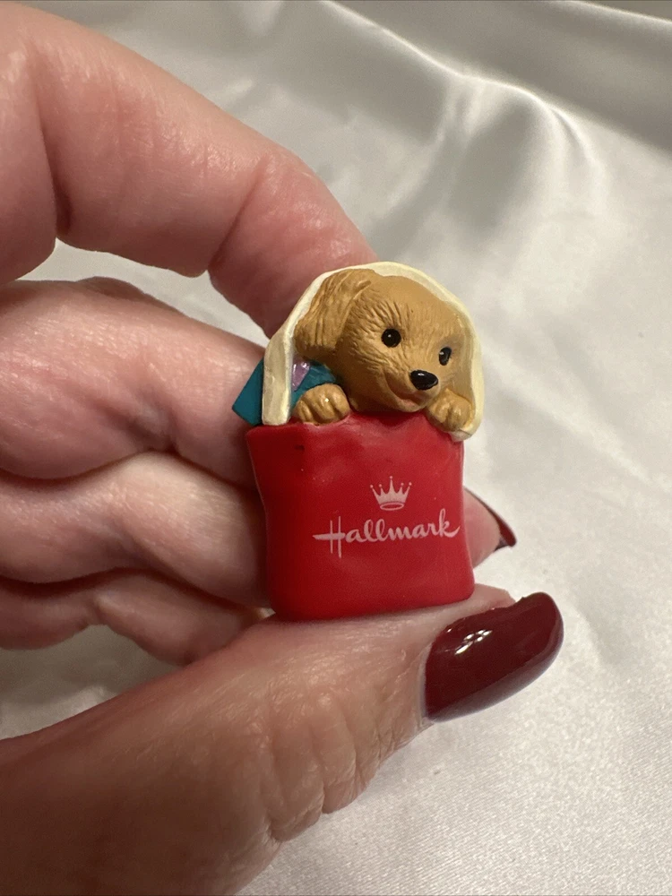 Add a cute and nostalgic touch to your holiday decor with this Hallmark Keepsake Ornament Collectors Club Merry Miniatures Puppy in Gift Bag from 1994. This charming miniature figurine features a multicolor puppy in a gift bag, perfect for adding to your collection or as a Christmas tree ornament. The figurine is an original piece from the Merry Miniatures collection and was manufactured in Sri Lanka in the 1990s. This figurine is a great addition for anyone who loves animals and dinosaurs themed decorations. It is a small-sized piece that can be displayed on a shelf or as part of a larger collection. The figurine is not signed, handmade, or vintage, but it is a valuable collectible item for fans of Hallmark and Christmas decorations.