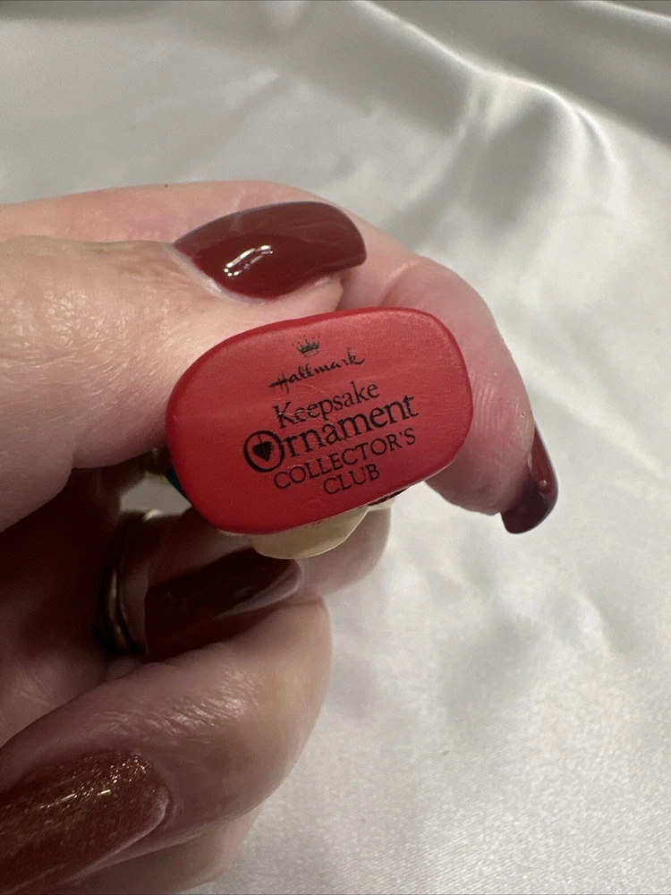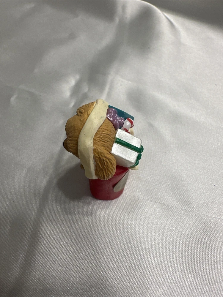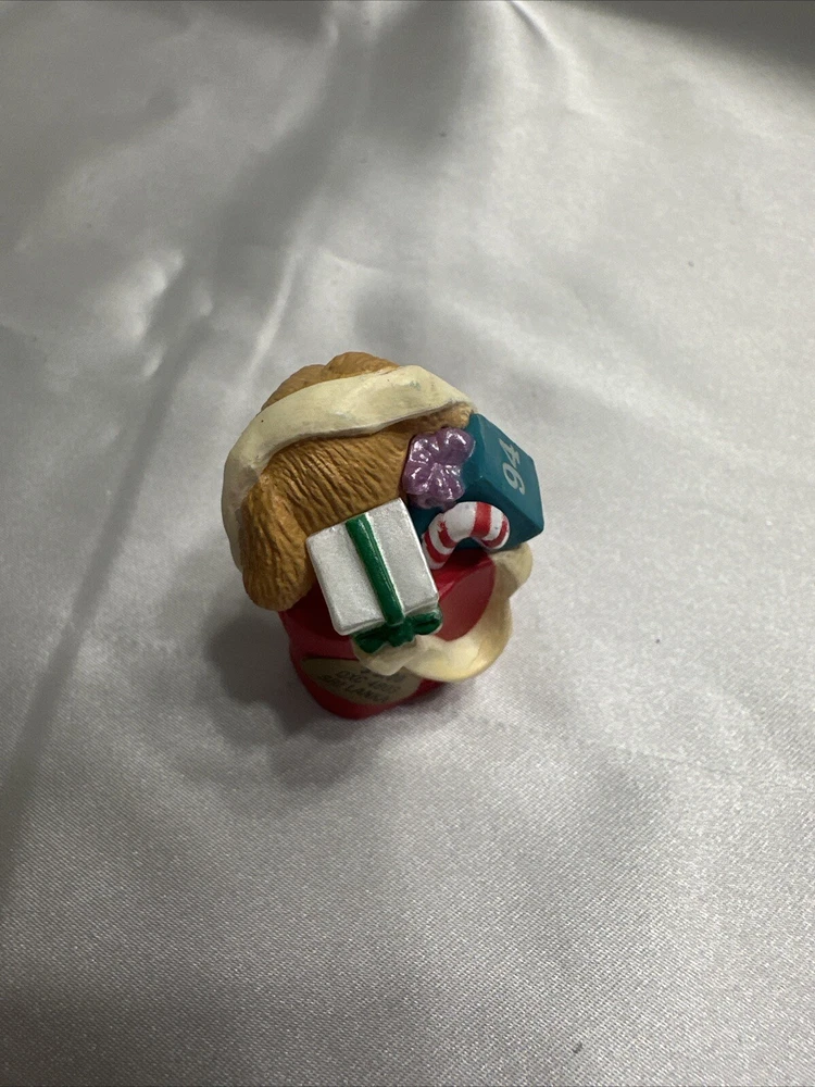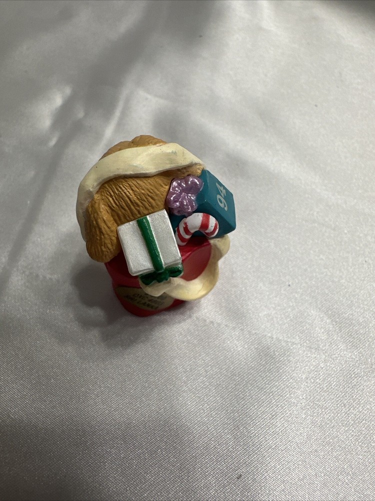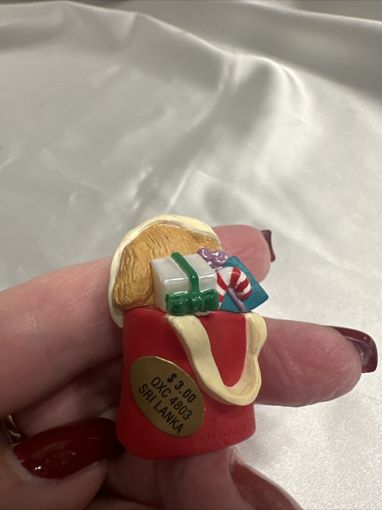 Add a cute and nostalgic touch to your holiday decor with this Hallmark Keepsake Ornament Collectors Club Merry Miniatures Puppy in Gift Bag from 1994. This charming miniature figurine features a multicolor puppy in a gift bag, perfect for adding to your collection or as a Christmas tree ornament. The figurine is an original piece from the Merry Miniatures collection and was manufactured in Sri Lanka in the 1990s. This figurine is a great addition for anyone who loves animals and dinosaurs themed decorations. It is a small-sized piece that can be displayed on a shelf or as part of a larger collection. The figurine is not signed, handmade, or vintage, but it is a valuable collectible item for fans of Hallmark and Christmas decorations.