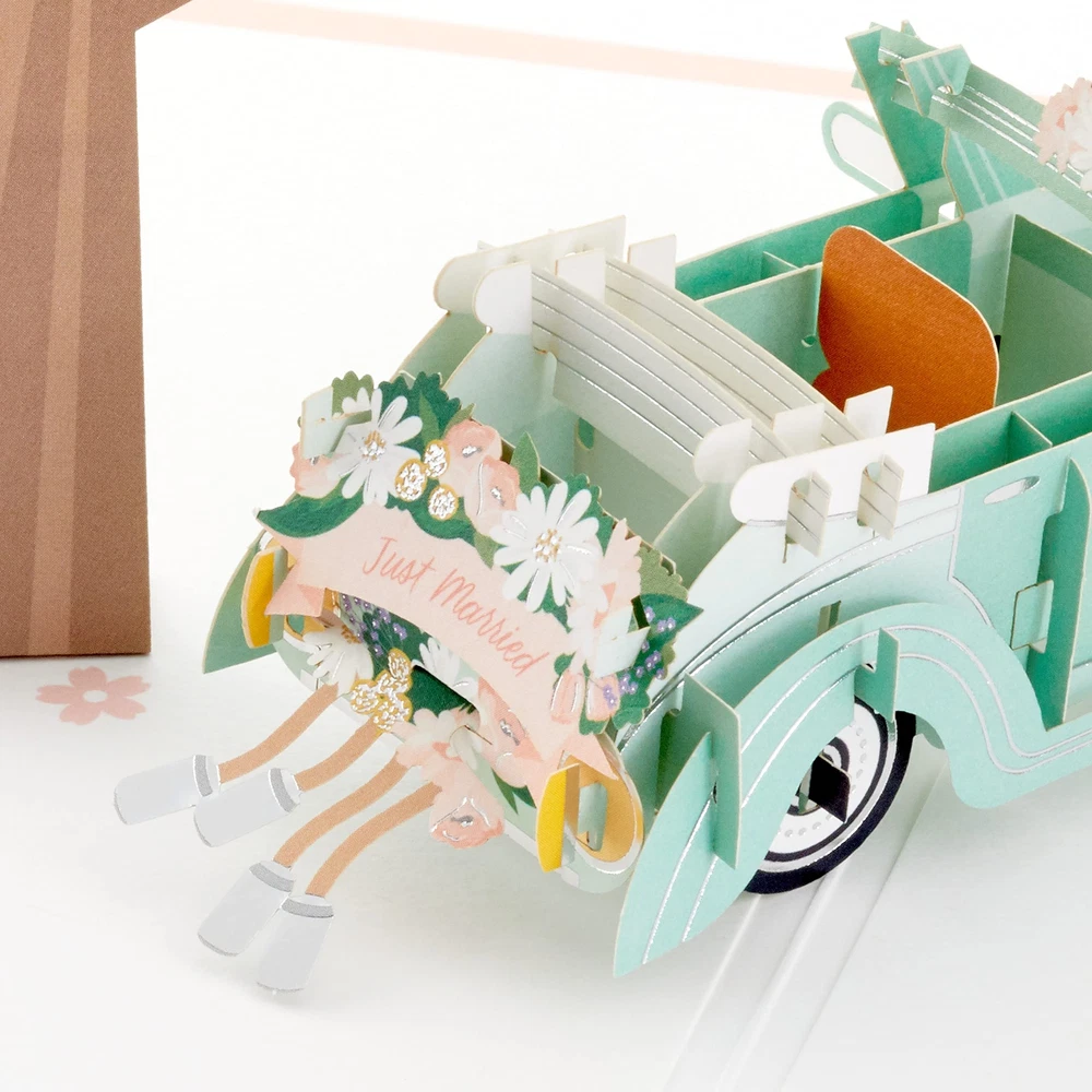 Wish the happy couple well as they embark upon the adventure of married life with this sweet card featuring an impressive paper craft design and a cheerful message. The perfect accompaniment for a wedding gift, the newlyweds are sure to cherish it as a beautiful keepsake of the best day ever. The Hallmark brand is widely recognized as the very best for greeting cards, gift wrap, and more. For more than 100 years, Hallmark has been helping its customers make everyday moments more beautiful and celebrations more joyful. Share in the newlyweds' joy with a celebratory card as they start the next chapter of their life together. Cover features a floral design, foil accents, and "Congratulations" lettering. Inside features an elaborate surprise 3D pop-up of a classic car waiting for the happy couple beneath flowering trees, and the message: "Best wishes for the road ahead." With an impressive paper craft design and sweet sentiment, this is the perfect accompaniment to a wedding gift. Wedding pop up card measures 5" x 7.2" and comes with a coordinating envelope. Printed on high quality paper stock, Hallmark's greeting cards are made with paper from well-managed forests. Paper Wonder greeting cards are mini masterpieces featuring three-dimensional scenes made of layers of intricate laser-cut paper that create a moment of wonder and lasting celebration.