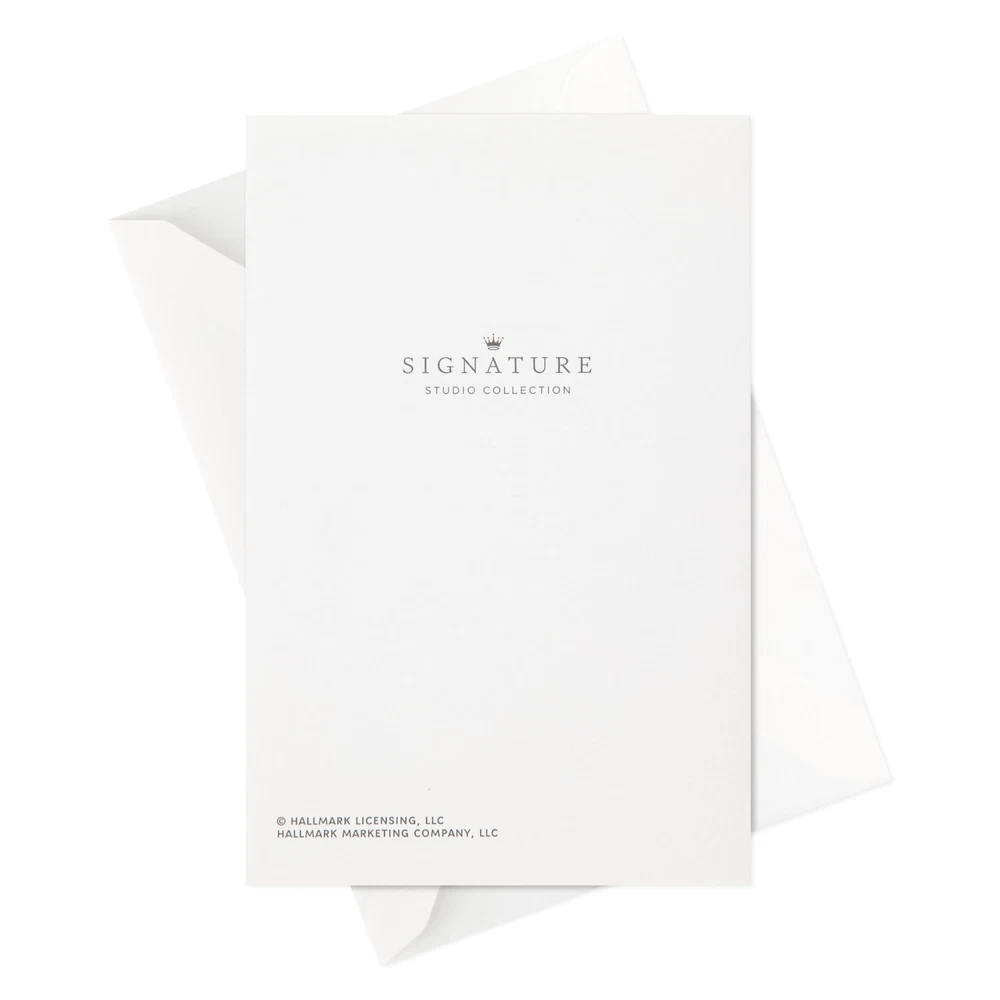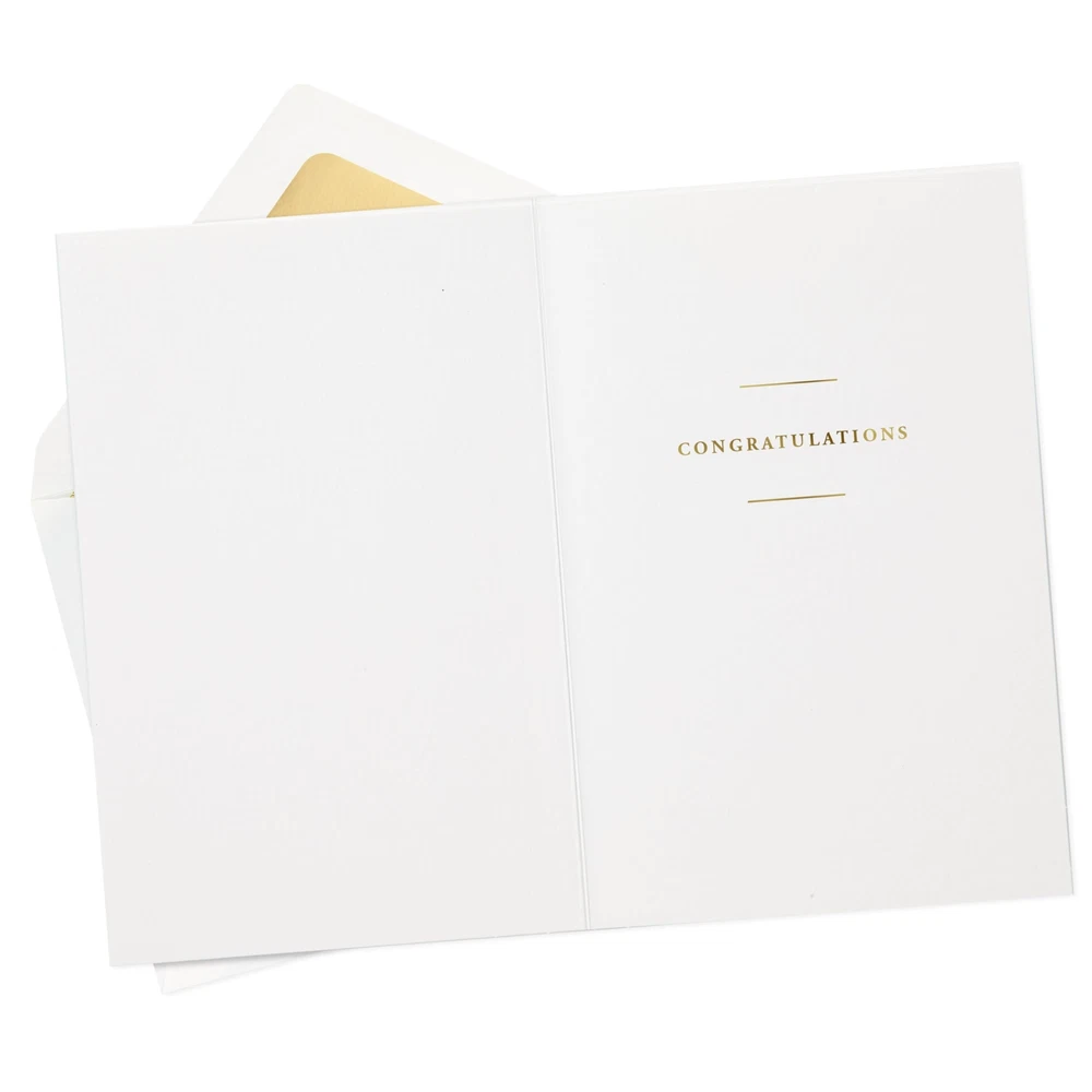 Send your best wishes to newlyweds, a bride to be, or fiancés with this premium wedding card featuring foil accents and a simple sentiment. A great pairing for a gift card or present, or a beautiful standalone offering at an engagement party, wedding shower, or the big day. The Hallmark brand is widely recognized as the very best for greeting cards, gift wrap, and more. For more than 100 years, Hallmark has been helping its customers make everyday moments more beautiful and celebrations more joyful. Wish the happy couple well with a beautiful card and a sweet sentiment. Cover features gold foil lettering on a light blue background that reads: "May the rest of your lives be the best of your lives." Inside reads: "Congratulations." Perfect for including with a wedding, shower, or engagement gift, or enclosing cash or gift cards. Congratulations card measures 4" x 6" and comes with a coordinating envelope. Printed on high quality paper stock, Hallmark's greeting cards are made with paper from well-managed forests. Hallmark Signature greeting cards assortment offers stylish shoppers a curated and considered line of upscale and unique cards and gifts that reflect their personal style and make an immediate and lasting impression.