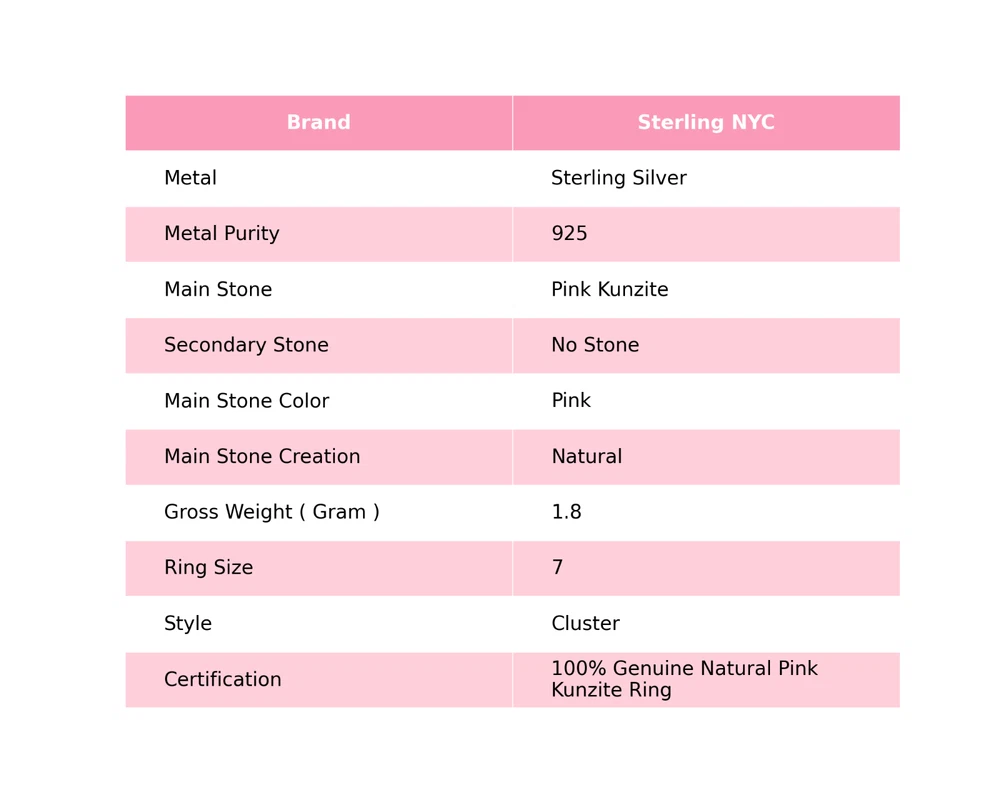 Welcome to Sterling NYC Gift For Her 925 Silver Natural Pink Kunzite Gemstone Cluster Ring Size 7 Handmade Ring, Sterling Silver Ring, Pink Kunzite Ring, Handcrafted Ring Specifications:- SKU : JS-63730 Gemstone : Pink Kunzite Stone Shape : As Seen In Picture Metal Purity : 925 Sterling Silver Ring Size : 7 US Adjustable : ----------------------------------------------------------------------------------------------------- Experience the timeless allure of silver jewelry, a cherished choice known for its exceptional properties and countless rewards. Explore the captivating charm of its unique attributes, enveloping you with elegance and remarkable healing qualities. Immerse yourself in the enigmatic world of silver, where beauty and benefits harmoniously intertwine. Benefits: Embrace the Elegance : Silver jewelry seamlessly blends accessible luxury with timeless beauty, elevating any jewelry collection without the need for extravagant spending. A Mindful Companion : Adorn yourself with silver jewelry as a gentle nudge towards mindfulness, a tangible reminder to cherish the beauty of every moment. Amplify Positivity : Silver, known for its energy-conducting qualities, is thought to enhance the power of positive intentions and affirmations, aiding in the clear manifestation of your desires. Unleash Self-Expression : Silver jewelry, with its versatile designs, empowers individuals to express their unique style, allowing their personality to shine through every piece. Soothing Serenity : Silver's cooling properties are believed to have a therapeutic effect, bestowing a sense of relief and tranquility upon both body and mind. ----------------------------------------------------------------------------------------------------- For Mother's Day Gift For Father's Day Gift For Promise For Valentine' Day For Halloween Party For Christmas Day Gift For New Year Party For Mom For Her ----------------------------------------------------------------------------------------------------- Discover the impeccable designs tailored just for you, and receive personalized guidance by reaching out to us. Our skilled artisans meticulously handcraft each piece in our workshop, infusing them with love and unwavering attention to detail. Your visit holds immense significance to us, and we are committed to ensuring that your shopping experience is nothing short of exceptional. Thank you for choosing us; we sincerely hope you thoroughly enjoy your shopping journey. Happy shopping! ----------------------------------------------------------------------------------------------------- At SterlingNYC, exquisite craftsmanship meets premium sterling silver gemstone jewelry. Our handcrafted pieces reflect authenticity and uniqueness, a testament to our commitment to excellence. Explore our collection and create your own dazzling jewelry ensemble.
