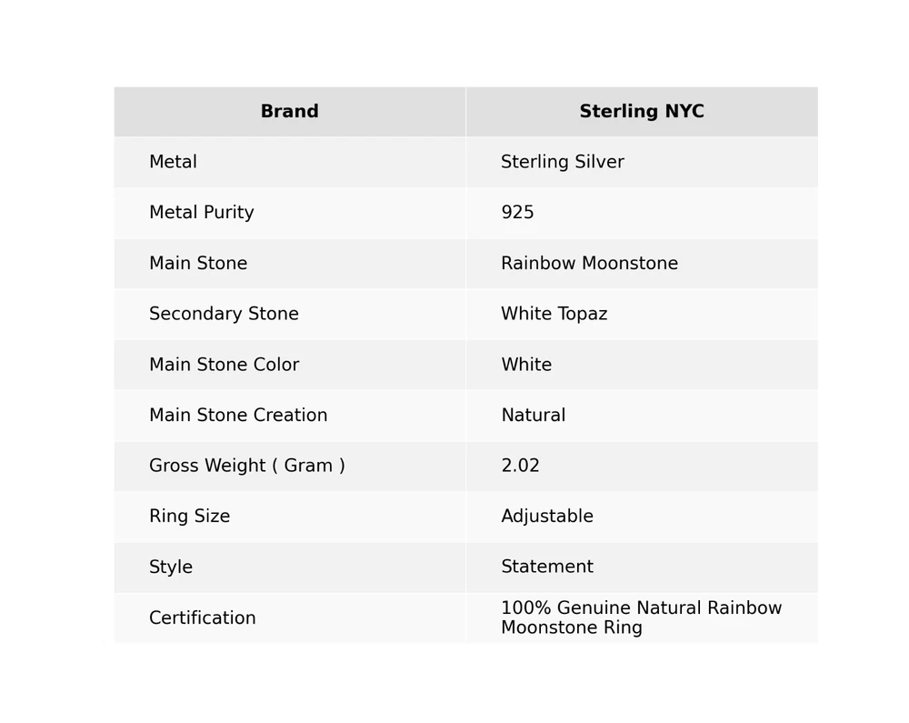 Welcome to Sterling NYC Gift For Her 925 Silver Natural Rainbow Moonstone Statement Adjustable Ring Handmade Ring, Sterling Silver Ring, Rainbow Moonstone Ring, Handcrafted Ring Specifications:- SKU : GJ-199 Gemstone : Rainbow Moonstone Stone Shape : As Seen In Picture Metal Purity : 925 Sterling Silver Ring Size : Adjustable US Adjustable : Yes ----------------------------------------------------------------------------------------------------- Experience the timeless allure of silver jewelry, a cherished choice known for its exceptional properties and countless rewards. Explore the captivating charm of its unique attributes, enveloping you with elegance and remarkable healing qualities. Immerse yourself in the enigmatic world of silver, where beauty and benefits harmoniously intertwine. Benefits: Embrace the Elegance : Silver jewelry seamlessly blends accessible luxury with timeless beauty, elevating any jewelry collection without the need for extravagant spending. A Mindful Companion : Adorn yourself with silver jewelry as a gentle nudge towards mindfulness, a tangible reminder to cherish the beauty of every moment. Amplify Positivity : Silver, known for its energy-conducting qualities, is thought to enhance the power of positive intentions and affirmations, aiding in the clear manifestation of your desires. Unleash Self-Expression : Silver jewelry, with its versatile designs, empowers individuals to express their unique style, allowing their personality to shine through every piece. Soothing Serenity : Silver's cooling properties are believed to have a therapeutic effect, bestowing a sense of relief and tranquility upon both body and mind. ----------------------------------------------------------------------------------------------------- For Mother's Day Gift For Father's Day Gift For Promise For Valentine' Day For Halloween Party For Christmas Day Gift For New Year Party For Mom For Her ----------------------------------------------------------------------------------------------------- Discover the impeccable designs tailored just for you, and receive personalized guidance by reaching out to us. Our skilled artisans meticulously handcraft each piece in our workshop, infusing them with love and unwavering attention to detail. Your visit holds immense significance to us, and we are committed to ensuring that your shopping experience is nothing short of exceptional. Thank you for choosing us; we sincerely hope you thoroughly enjoy your shopping journey. Happy shopping! ----------------------------------------------------------------------------------------------------- At SterlingNYC, exquisite craftsmanship meets premium sterling silver gemstone jewelry. Our handcrafted pieces reflect authenticity and uniqueness, a testament to our commitment to excellence. Explore our collection and create your own dazzling jewelry ensemble.