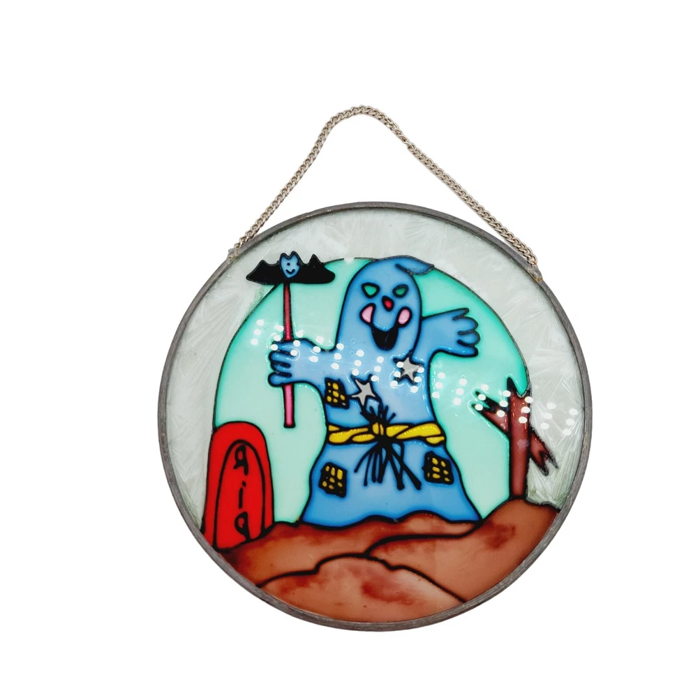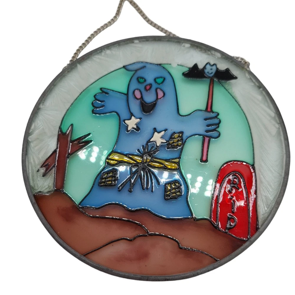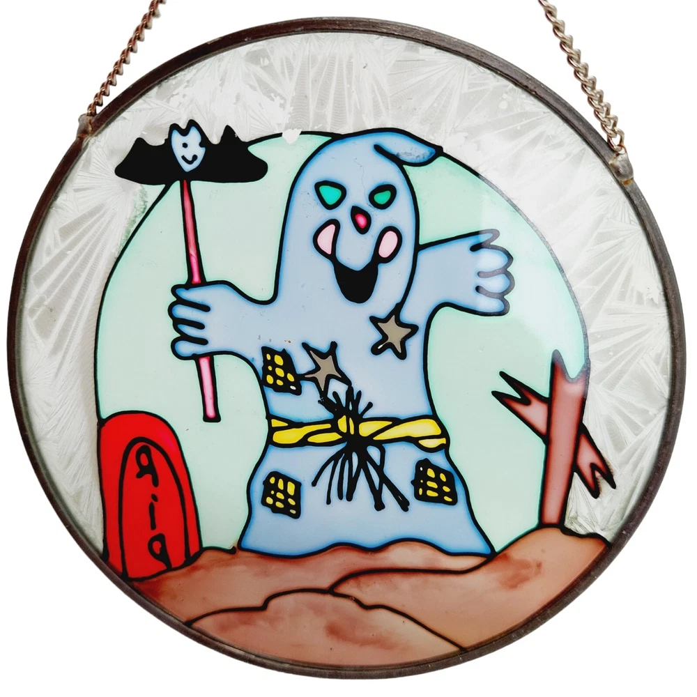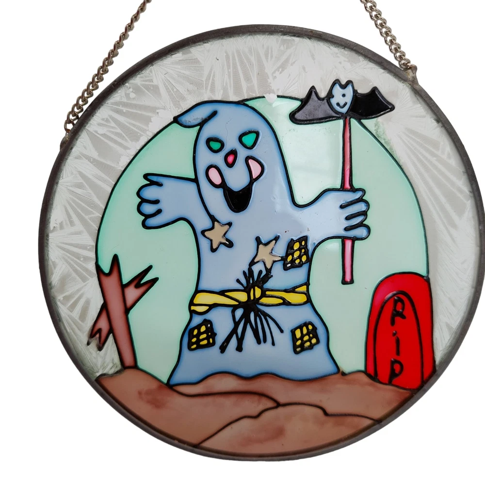 Halloween Stained Glass Ghost Bat Gravestone Suncatcher Round READ