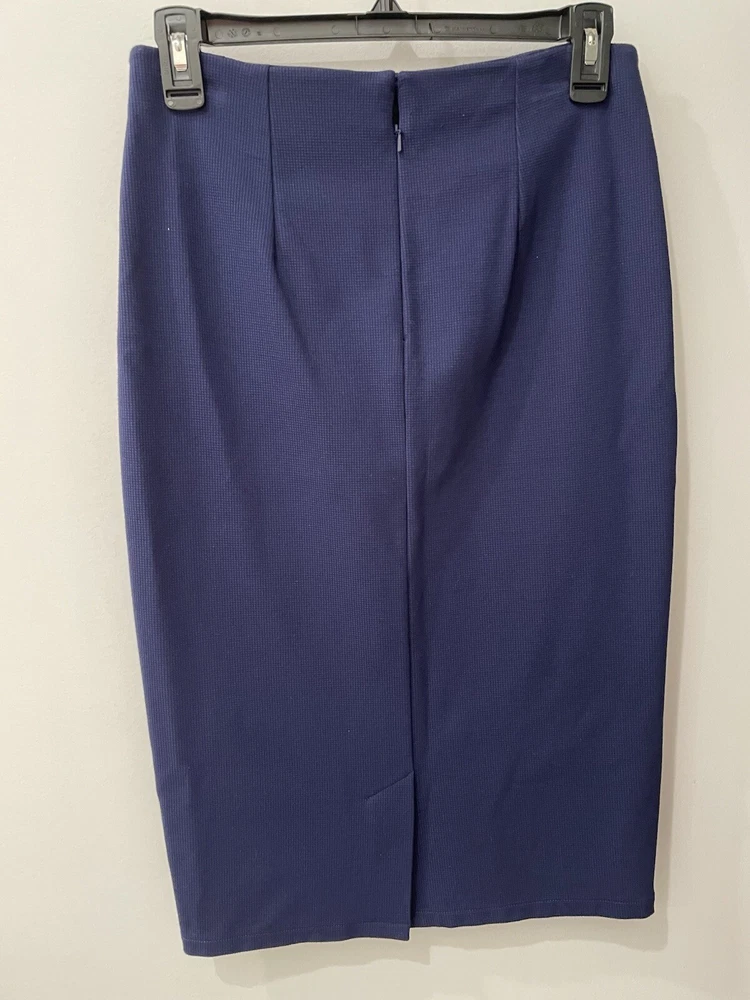 This Halogen skirt is a size XS in a solid blue color with a front side button design and back split. It is made of a Rayon Nylon Spandex fabric blend, tailored in a straight & pencil style. The skirt is below the knee in length and perfect for a fashionable and professional look.