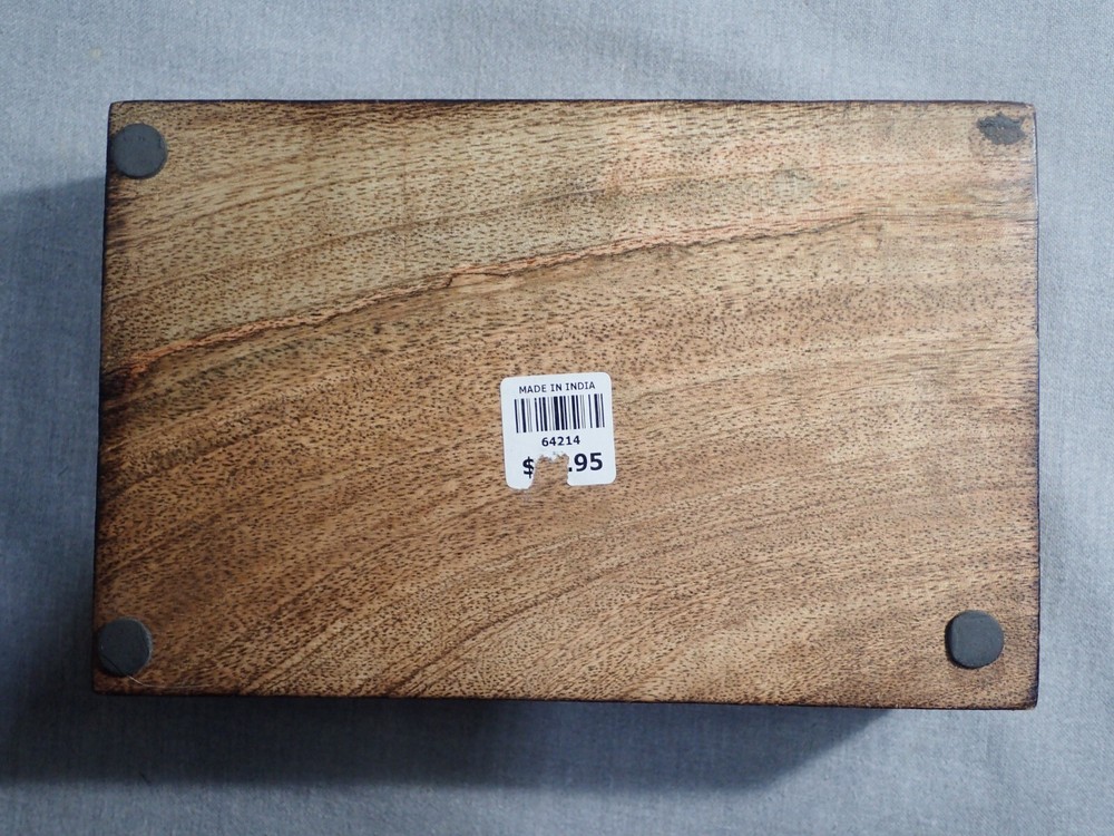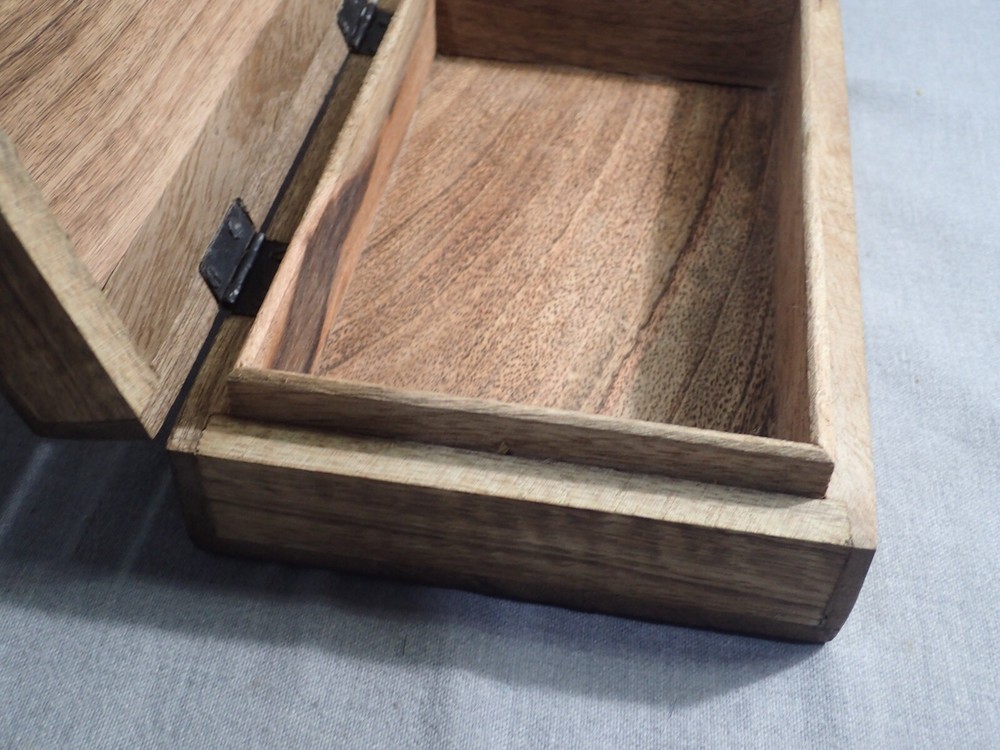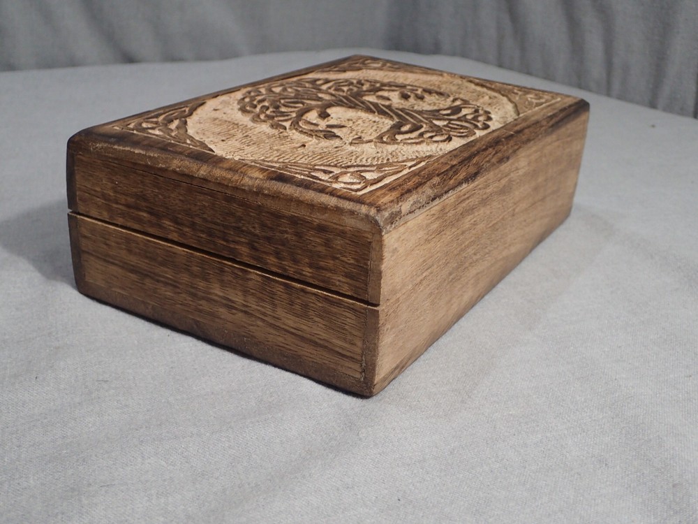 Tree of Life Hand Carved Jewelry Trinket Keepsake Wooden Tarot Storage Box T his offer is for a Tree of Life hand carved jewelry trinket tarot card storage hinged storage box. Item measures 8⅜" x 5⅜" x 2⅝". Indulge in the exquisite artistry of this Hand Carved Jewelry Trinket Keepsake Wooden Storage Box. Crafted from eco-sustainable mango wood, this box features a deep Celtic Tree of Life design with delicate floral detailing. The distressed finish provides an antique look, while the inside is lined with soft velvet felt. Its durable and water-resistant quality makes it perfect for storing precious items like stones, watches, tarot cards, or even herbs. Each box is hand-carved and finished, giving it a unique charm with natural variations such as knots, grain detailing, and mineral deposits. Condition is pre-owned. If antique/vintage things are your jam (if you are here, they probably are) check out my store for more cool stuff. My store is primarily vintage holiday (Christmas and Halloween), vintage toys, and kitchen equipment. Thank you for looking. 😃 Please consider supporting small business. Your purchase helps put food on the table and keep the lights on. Thank you. Please come visit my eBay store "Professor Khimera MacGuffin's Emporium" where I have many other interesting things including some hidden treasures. Please feel free to contact me if you have any questions. Lastly, I truly appreciate your interest in my item and ask that you like, and share my store with your friends and family. Shipping weight 1 lbs. 8 ounces shipped USPS Ground Advantage or Priority. I'm always happy to combine shipping whenever possible. Local pickup also available. Please feel free to contact me if you have any questions. I use mostly recycled boxes and materials, or flat rate boxes and bubble mailers from USPS. It's my way of saving my customers money and doing my part for the environment. Please read the following Terms of Sale carefully. Payment is expected to be sent within 72 hours of the close of the auction or immediately with BIN unless other arrangements are made. I reserve the right to relist item if high bidder fails to pay for item within that time without making prior arrangements. High bidder to pay for shipping unless otherwise noted. Only what is shown in the eBay photo(s) and/or mentioned in the listing is included, anything else should be understood to not be included. In other words, item sold "As-Is". My items are described as accurately as possible including known flaws. I guarantee all my items to be as represented. Nearly all of my products are used (gently or otherwise) and the description is my opinion. I pack carefully and ship promptly . Merchandise is usually mailed within 24 hours of receipt of payment (save postal holidays). **INTERNATIONAL BUYERS** Any customs duties or fees are the sole responsibilty of the buyer. Please feel free to contact me if you have any questions. Lastly, I truly appreciate your interest in my item and ask that you like, and share my store with your friends and family.