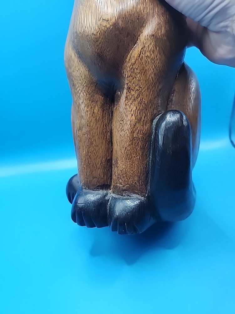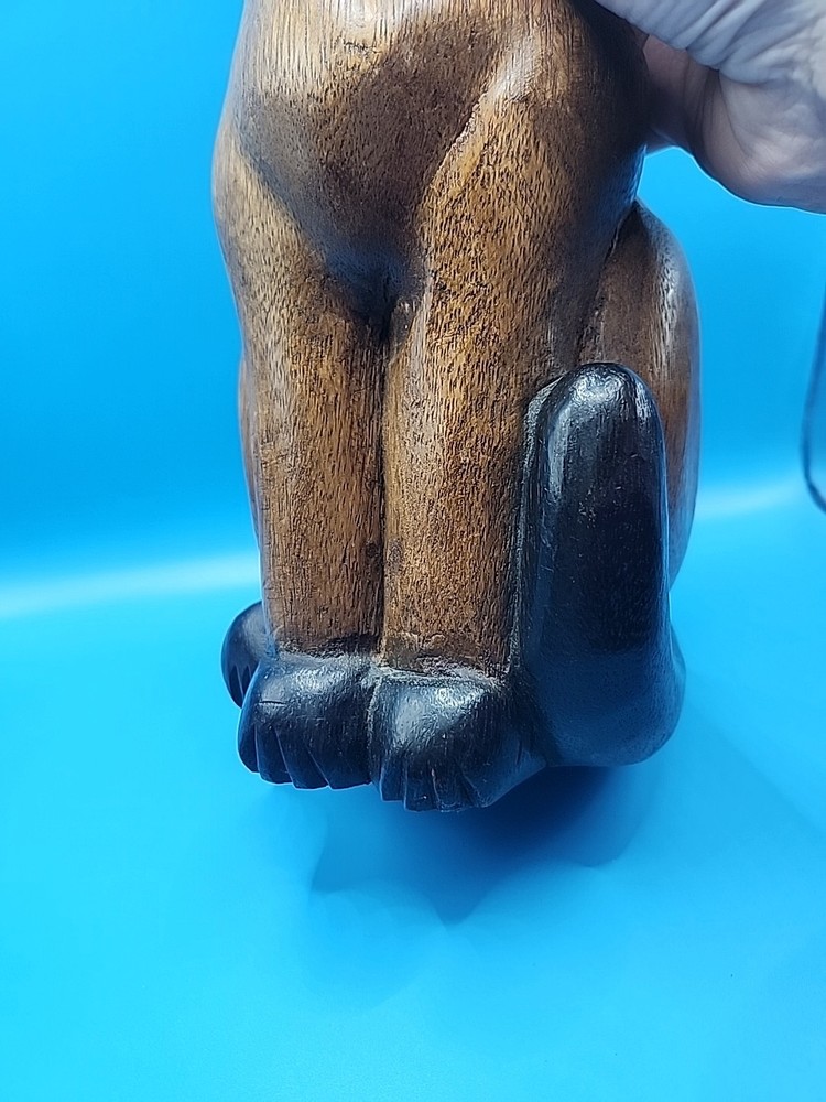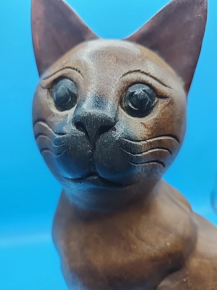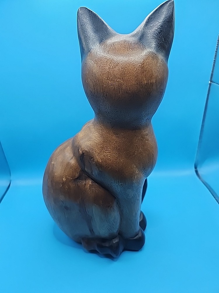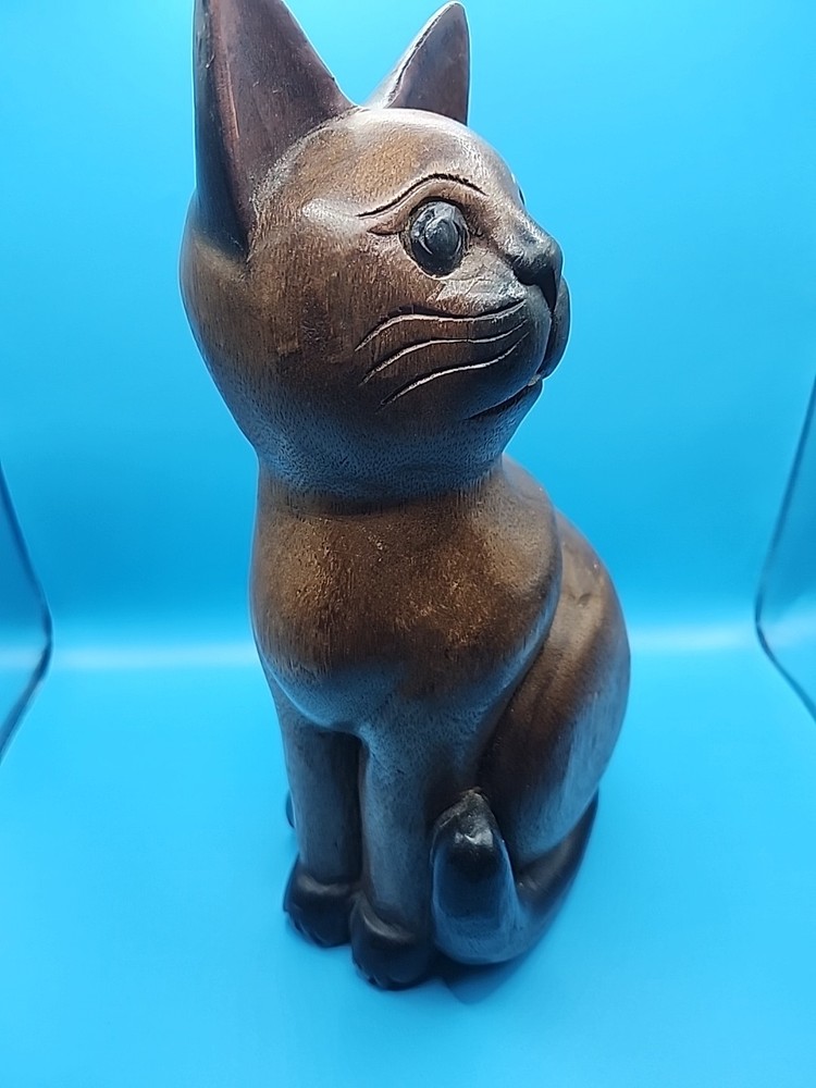 This hand-carved wooden sitting cat figurine is a charming vintage piece that would make a great gift for cat lovers or collectors. Standing at 12 inches tall, this solid wood figurine exudes a sense of craftsmanship and nostalgia. The intricate details and unique design make it a standout addition to any space, adding a touch of whimsy and character.