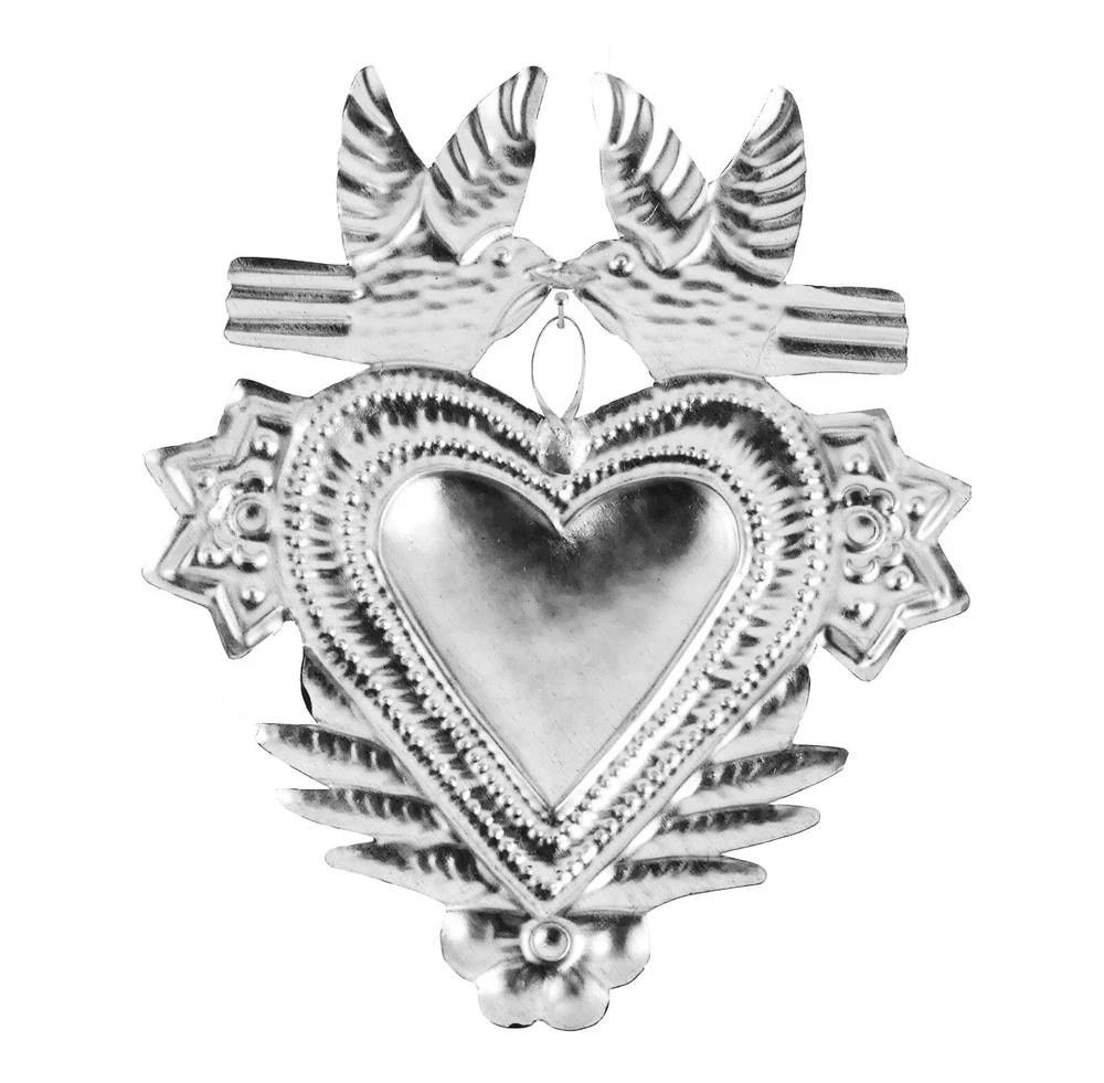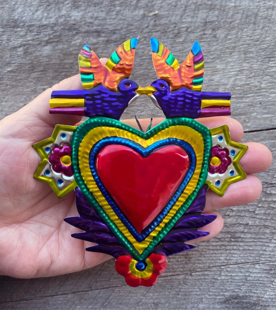 • Heart Milagro or Ex-Voto Ornament, carried by doves, hand-made from punched tin in Southern Mexico by skilled Tin Artisans • Bright, vivid colors, painted on one side only • 5.00” high x 4.25” wide (12.70 cm high x 10.8 cm wide) • Can be hung as Christmas ornaments, used in wreaths or garlands, or used as embellishments for greeting cards. • Nice gift, momento, or favor for weddings, wedding showers, anniversaries (or specifically, the 10th (tin) anniversary). Mexican Punched Tin Ornaments make nice gift boxes! If you order 5 or more ornaments (mix or match from the link below) and have them sent to the same address, I will package them in a nice box with colorful tissue paper. The box can be used to store the ornaments when not in use. Combined Shipping for mulitiple purchases: Ornaments shipped w/in the United States ship at a flat rate of $4.25 no matter what quantity you buy, but… To get the lower shipping charges, please request an invoice. If you request an invoice I will combine shipping costs. Please use the Cart feature (under the Buy-It-Now button) to add items until you are done shopping.Then hit the Request total from seller button. If you don’t do this, you will be charged excess postage by eBay. (note, if you are only buying multiples of the same ornament (i.e. only buying 4 cats) eBay will charge you the correct amount for shipping. International Combined Shipping for multiple purchases: Ornaments going internationally ship at a flat rate of $15.00 US dollars, no matter what quantity you buy. If shipping outside of the United States, please expect 1-3 weeks for arrival I sell a nice variety of tin ornaments which can be found here