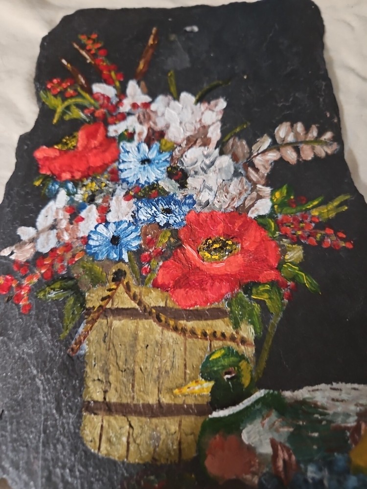 Decorative Hand Painted Small Slate Floral Trivet or wall hanging Vintage **Pre-Owned **Vintage **Type: Decorative Trivet **Design: Flowers **Hand Painted **Measurements: 8.5” Height…6” Length **THIS IS A HAND PAINTED VINTAGE PRE-OWNED SMALL SLATE TRIVET IN GOOD CONDITION…GENTLY USED**