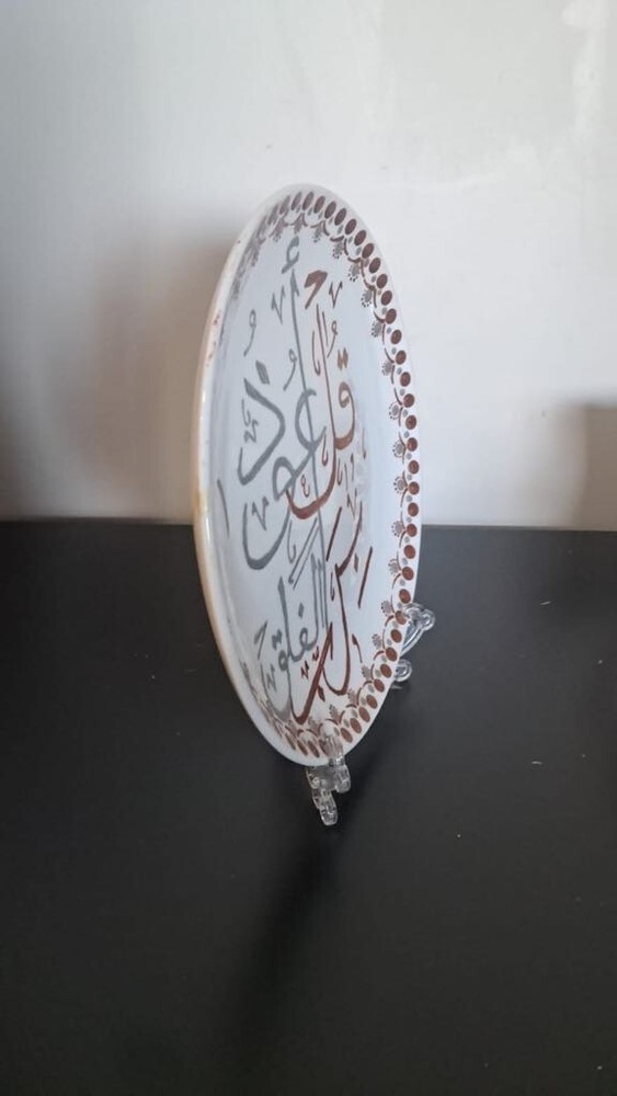 WELCOME Porcelain Decorative Collectible Plate Hand-Painted Art Saucer Arabic Words Quran اول كلمات من سوره الفلق With Stand Description: Item: Plate Material: Psoralen + Psoralen Colors Circle diameter size: 20 cm = 7.8 in Weight: 443g Very Beautiful Handmade Artist Work Please review all photos closely, since they are a large part of my item description (all made with daylight, to show the color as authentic as possible). Shipping I do worldwide shipping by Registered mail with a tracking number. Shipping takes up to 21 business days All additional payments such as tax, are the buyer’s responsibility. Return policy I checked each product and I sell only the best quality ones. In any case, if you are not satisfied with the product please get in touch with me and I will do everything for your satisfaction. You have a 100% guarantee and refund; it is only accepted within 14 days in its original packaging and the condition of the item you bought must remain the same. Buyers pay for shipping and all additional payments such as tax. Feedback: I give immediate positive feedback to buyers as soon as the payment is received for the purchase. In any case, if there is a problem contact me right away before leaving feedback. I will do my very best to resolve any problem that occurs and satisfy you . Thank you for shopping 😊