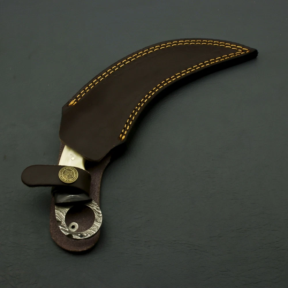 beautiful handmade damascus huntign karambit knife handle made of camel bone Vision & Mission of SuperSharp Steel total lenght 9" blade lenght 4.5" handle lenght 4.5" comes with leather sheath SuperSharp Steel was founded in 2015. We are manufacturers of Damascus Steel, Stainless Steel, D2, High Carbon Steel Knives and Folding Knives. Our Blades contain 1095 & 15N20 High carbon tool steel and hardness of 58 to 60 HRC after heat treatment. Our Products are hand made by skilled artisans and craftsmen, which reflects excellence in itself. Our unmatched quality of products set us ahead from our competitors in the international market. All the products are delivered within the stipulated time frame and checked by our quality experts to ensure complete satisfaction of our customers. Quality Control: From the selection of the finest raw materials to exacting and rigorous steps taken to maintain quality control during each phase of production, there is a lot of craftsmanship that has gone into every SuperSharp Steel knife, transforming a simple cutting task into a uniquely pleasurable experience each and every time. Rockwell testing equipment (HRC) is used to maintain strict control over the all important hardening process. Resistance to corrosion and cutting edge superiority are entirely dependent on this precise heat treatment process. To ensure optimum performance, our sharpness testing machine is used on every knife blade that we manufacture, guaranteeing the best possible performance with every knife. Throughout the production process, proper grinding and honing angles are continuously monitored with a laser angles control unit. The quality of steel: Quality knives require a very specific grade of steel to insure proper forging, tempering and hardening. All SuperSharp Steel knives are made of the finest quality steel. Our commitment to quality insures durability, strength and longevity of each blade that is made. The forging process the way which the knife is forged and tempered is as important to the process as the quality of the steel that is used, Forging is the process of heating steel to a red-hot state prior to applying a powerful blow to form a forged blank. Variations: As all Damascus Steel patterns are made particularly in proper way but it is not possible to get the same layers compaction all the time, So keep in your mind when you purchase our Damascus knives there may not be exactly as shown in Photos but you will always find a quality knife. Questions If you have any questions feel free to send us message we aim to answer all questions within 12 hours. Feedback As we are confident what we make, however If you are not satisfied with our services please contact us before leaving any negative or neutral feedback. We will resolve all issues as quickly as possible. Disclaimer: We are not responsible for any injuries associated with the use of our tools. Our products are intended for legal use only by responsible buyers. Therefore, we will not sell our products to anyone under the age of 18. Before bidding please check your country laws as some countries Custom don't allow this. If your purchase is held by Custom Authorities in your country/State we will Not be responsible for that and no refund will be issued. Complimentary gift messages *Gift wrapping service available for minimal additional fee ADD ONS: *Custom orders for 10 or more pieces. You can choose & submit your own handle or design. LIFETIME WARRANTY No premium knife is complete without a lifetime warranty; our masterpiece knife is fully covered for life, We do sell wholesale, please contact us for special discounts on bulk orders. FEEDBACK POLICY: YOUR FEEDBACK IS VERY IMPORTANT FOR US, IF THEIR IS ANY KIND OF PROBLEM PLEASE GIVE US OPPORTUNITY TO SORT THE ISSUE