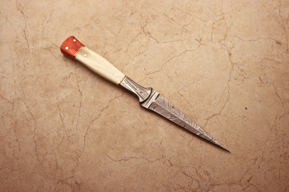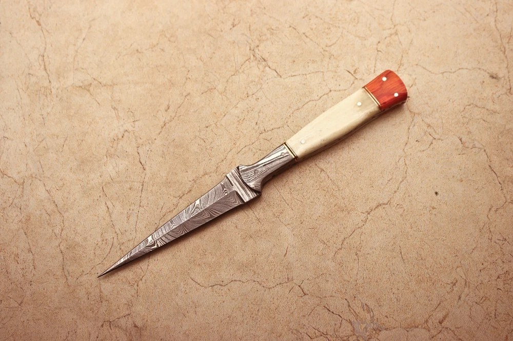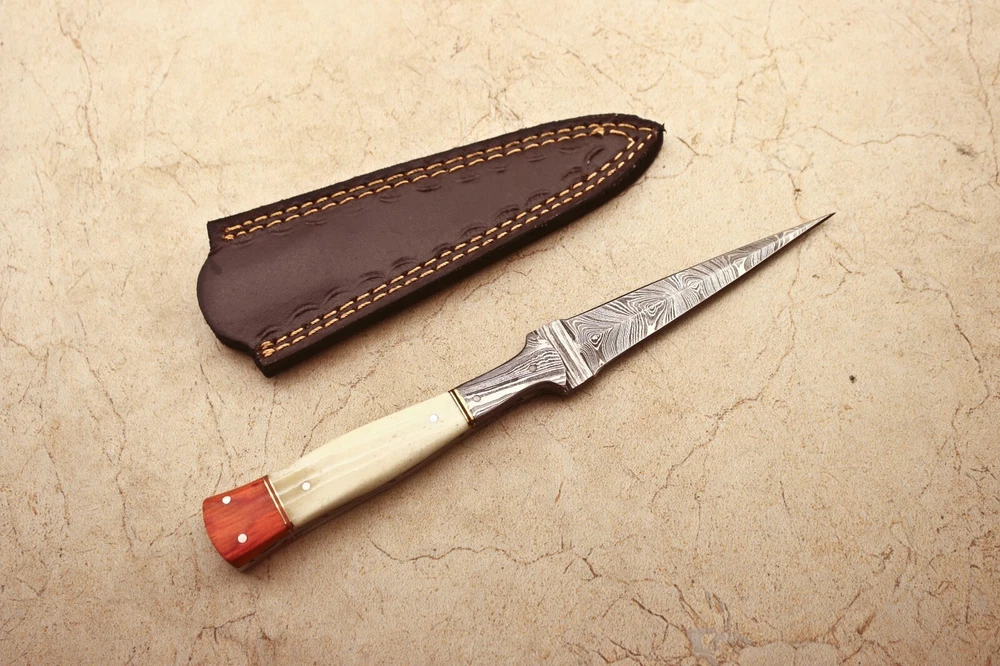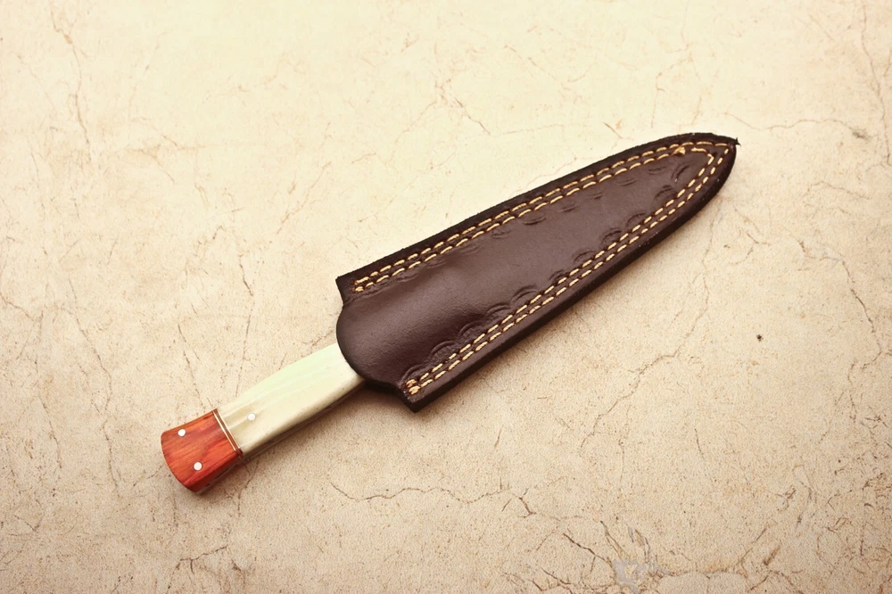 Beautiful Handmade Hunting Knife Designed with superb Handle Modern pattern welded Damascus steel, 512 layers of hard higher carbon steels are welded to many layers of soft lower carbon steels. The pattern is designed, the blade is forged-welded, twisted, drilled, flattened, grounded, and forge-welded some more. A note about the handle. wood is a natural material and will have some variances in color. Thank you!! FEATURES & SPECIFICATIONS Total Length: 9" Blade length: 4.5" Handle Length : 5" Blade Material: Damascus Blade Hardness: 50-58HRC on Rockwell scale Handle Material: Rose Bone Wood Sheath: Genuine Leather Care Instructions: Keep the blade dry after each cleaning. Warning : Take care when removing product from packaging. Keep fingers clear of blades. Store away from children. Complimentary gift messages *Gift wrapping service available for minimal additional fee ADD ONS: *Custom orders for 10 or more pieces. You can choose & submit your own handle or design. LIFETIME WARRANTY No premium knife is complete without a lifetime warranty; our masterpiece knife is fully covered for life, We do sell wholesale, please contact us for special discounts on bulk orders. FEEDBACK POLICY: YOUR FEEDBACK IS VERY IMPORTANT FOR US, IF THEIR IS ANY KIND OF PROBLEM PLEASE GIVE US OPPORTUNITY TO SORT THE ISSUE