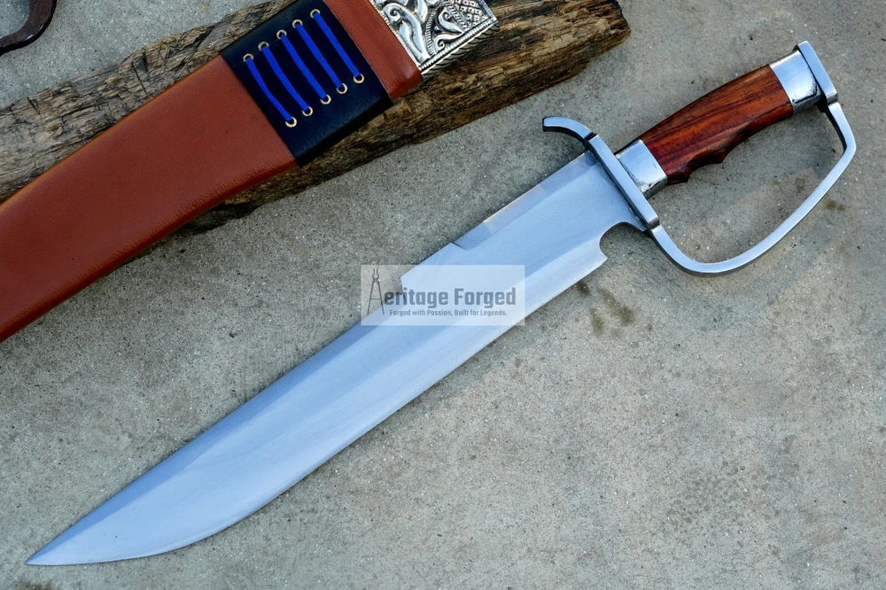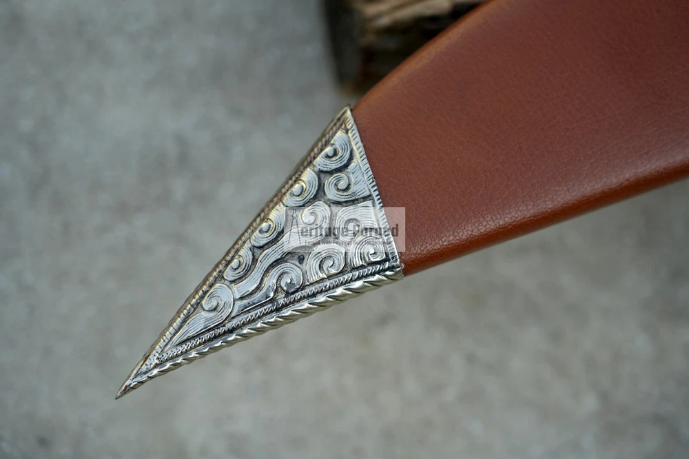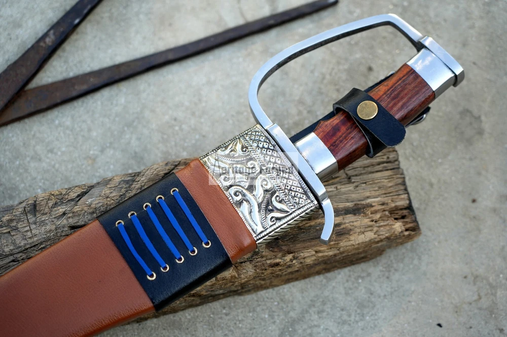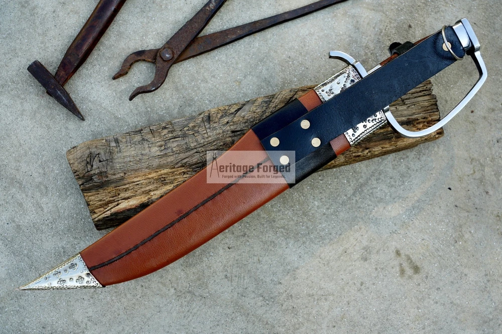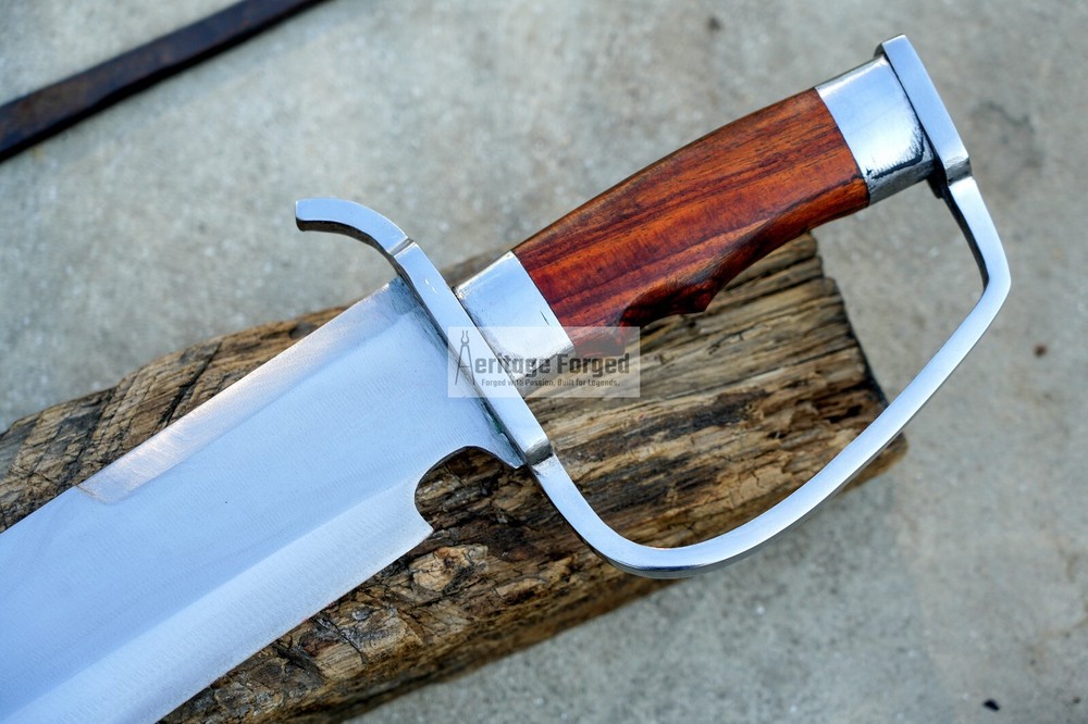 My blades are meticulously hand-forged from high-quality 5160 leaf spring steel, a material renowned for its durability and resilience. Using traditional forging techniques, each blade undergoes a rigorous crafting process that ensures both strength and precision. After shaping, the blades are tempered with water to achieve optimal hardness and flexibility. The final product is sharpened to a keen edge, making it ready use. This combination of traditional methods and modern steel technology results in blades that are both reliable and enduring, designed to perform exceptionally in a variety of tasks. Product Specifications: Blade Length: 16 inches Handle Length:6 inches Total Length: 22 inches Blade Weight:990 Grams Handle Material: Rosewood Leather Scabbard. 5 inches MUK knife included