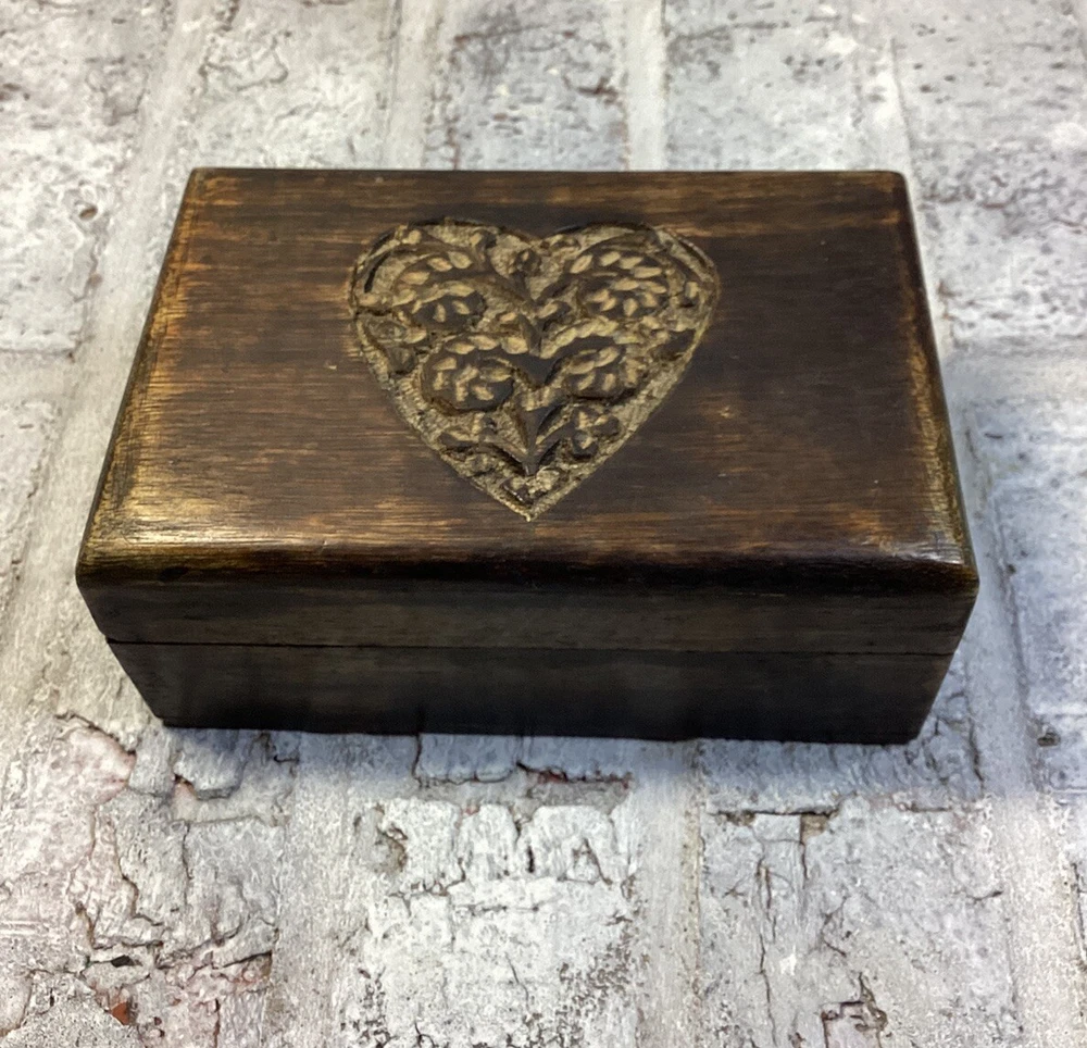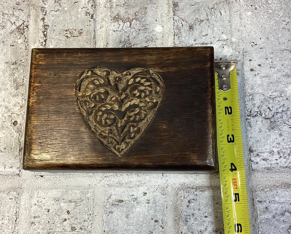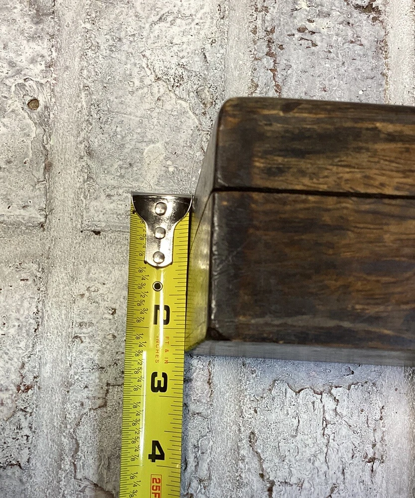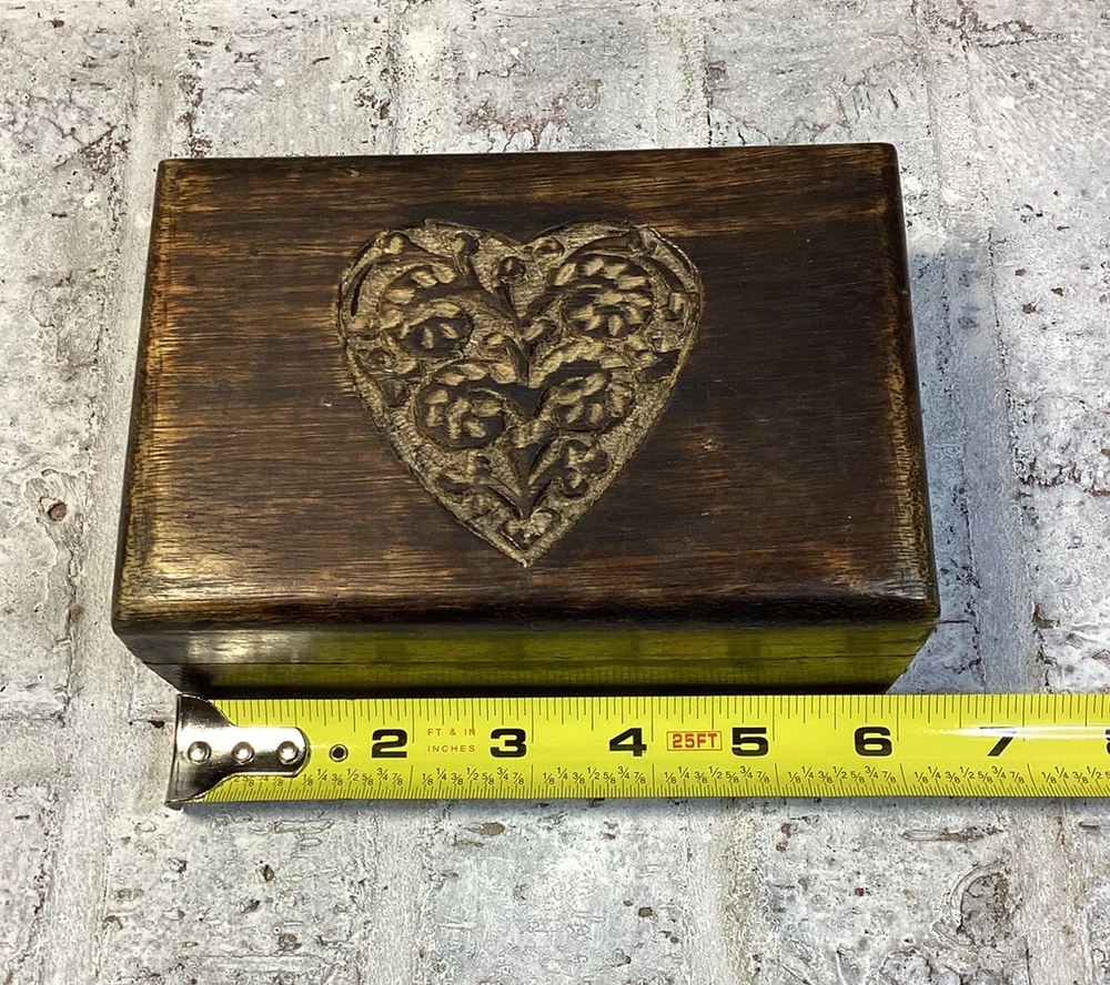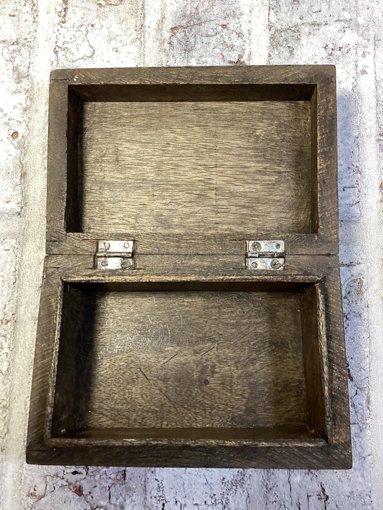 Nice handmade, hand carved wood hinged box. Could be used for anything you want to put in it. Well built. The hinges are in very good condition and tight. I'm happy to answer any questions you have. Please see pictures for more details. Thank you for stopping by!