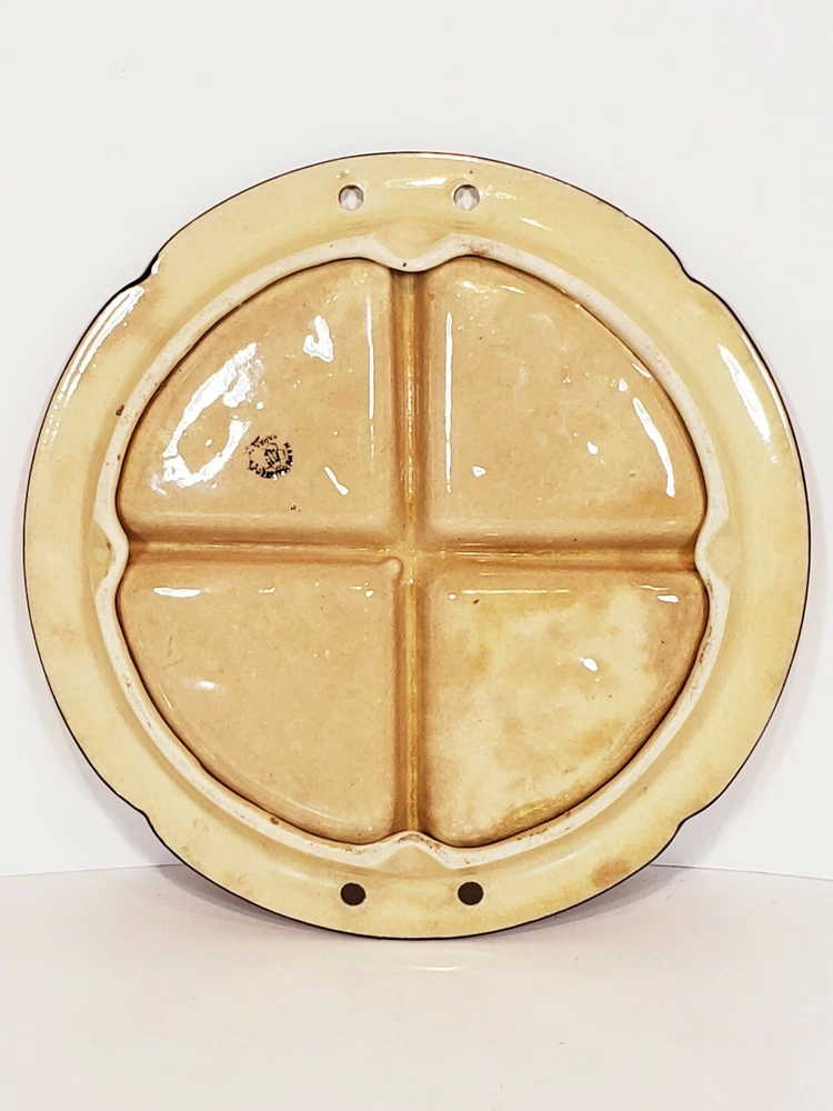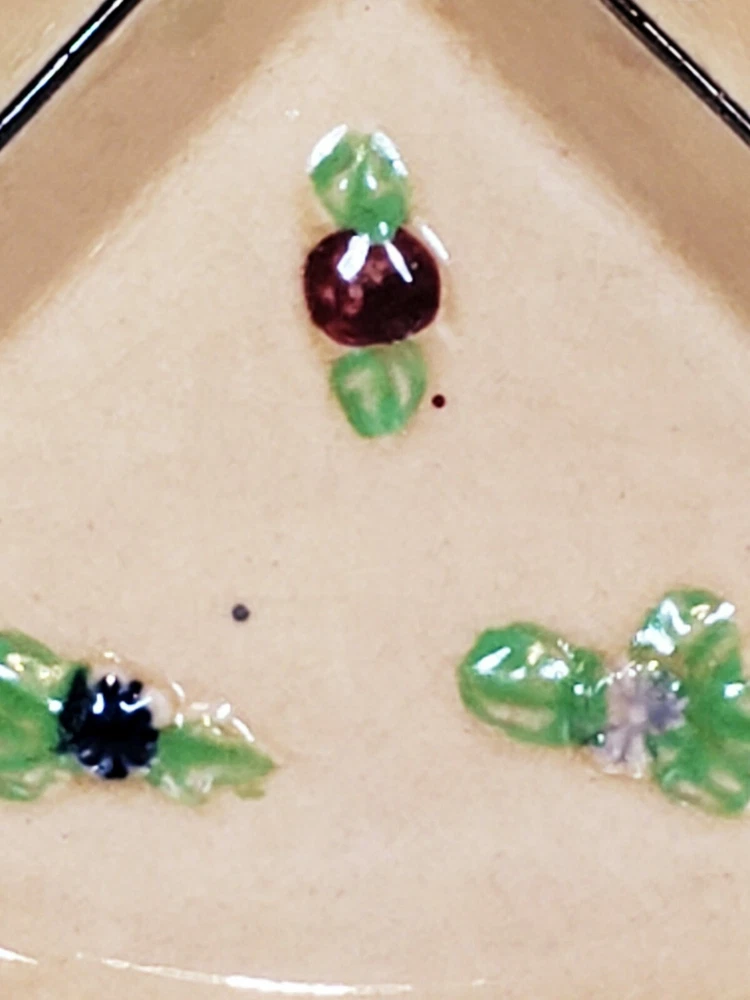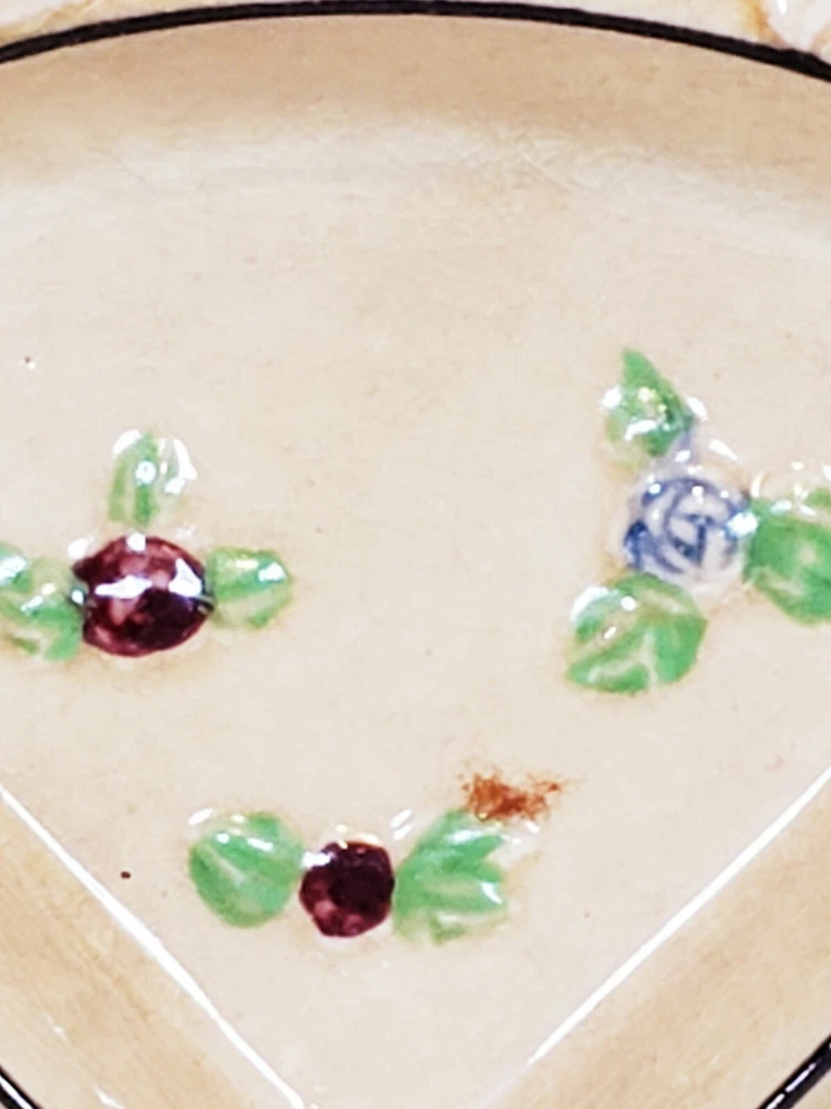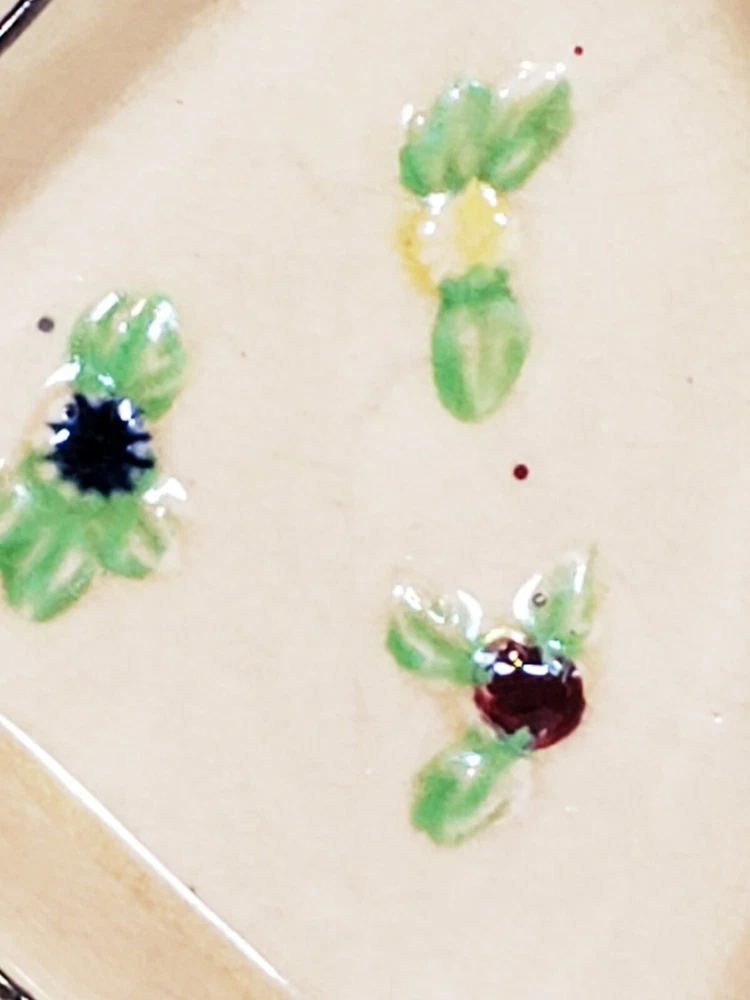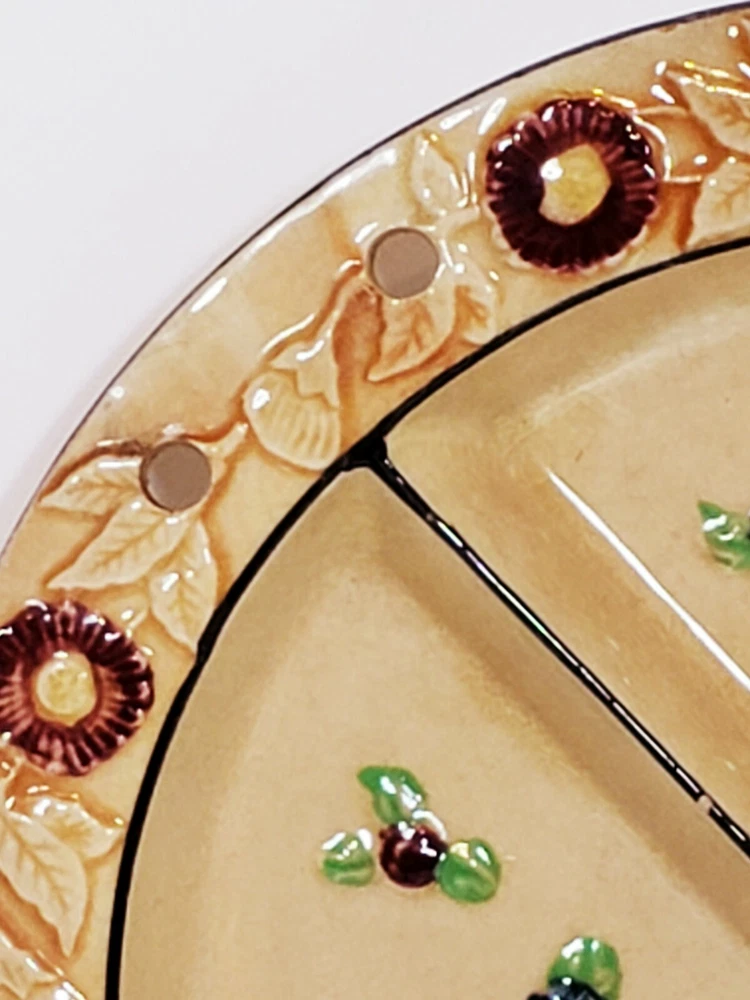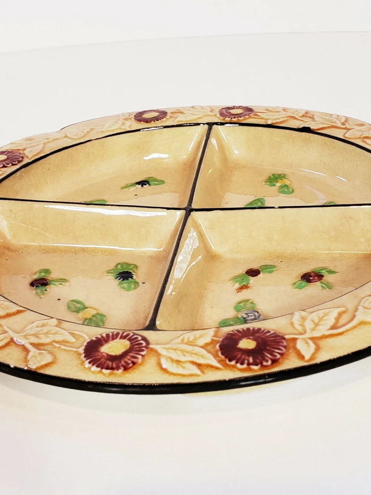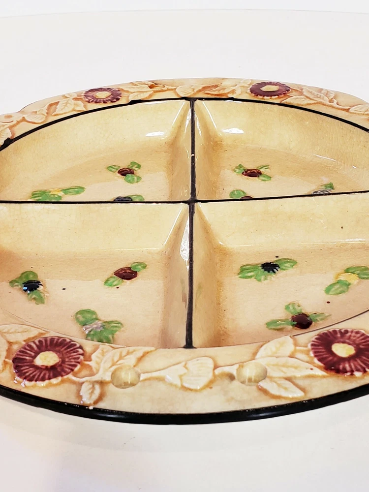 Handpainted Japan Slotted Relish Dish 4 Slots 9". There are 4 spots looks like maybe a Handle went across. Nice 4 slotted dish for condiments relish black olives pickles and so on . Has a couple of flea bits that can be touched up no cracks.