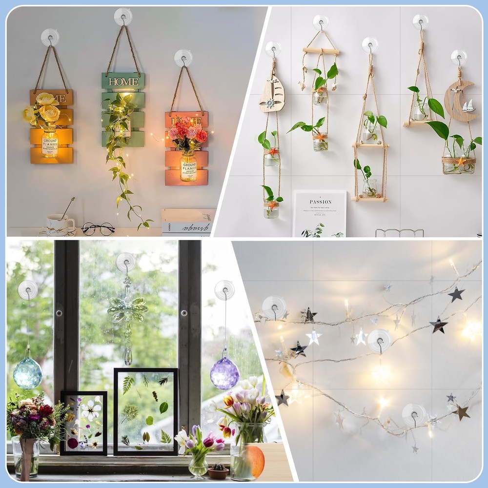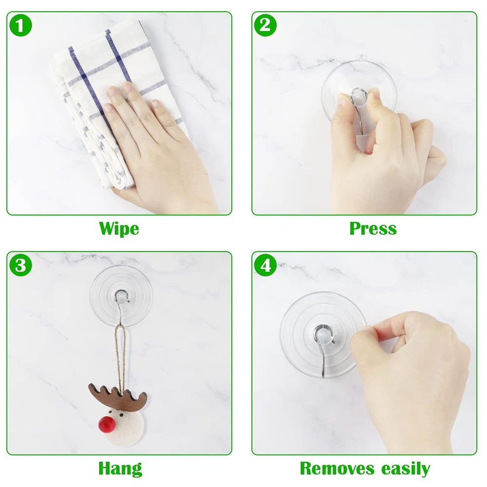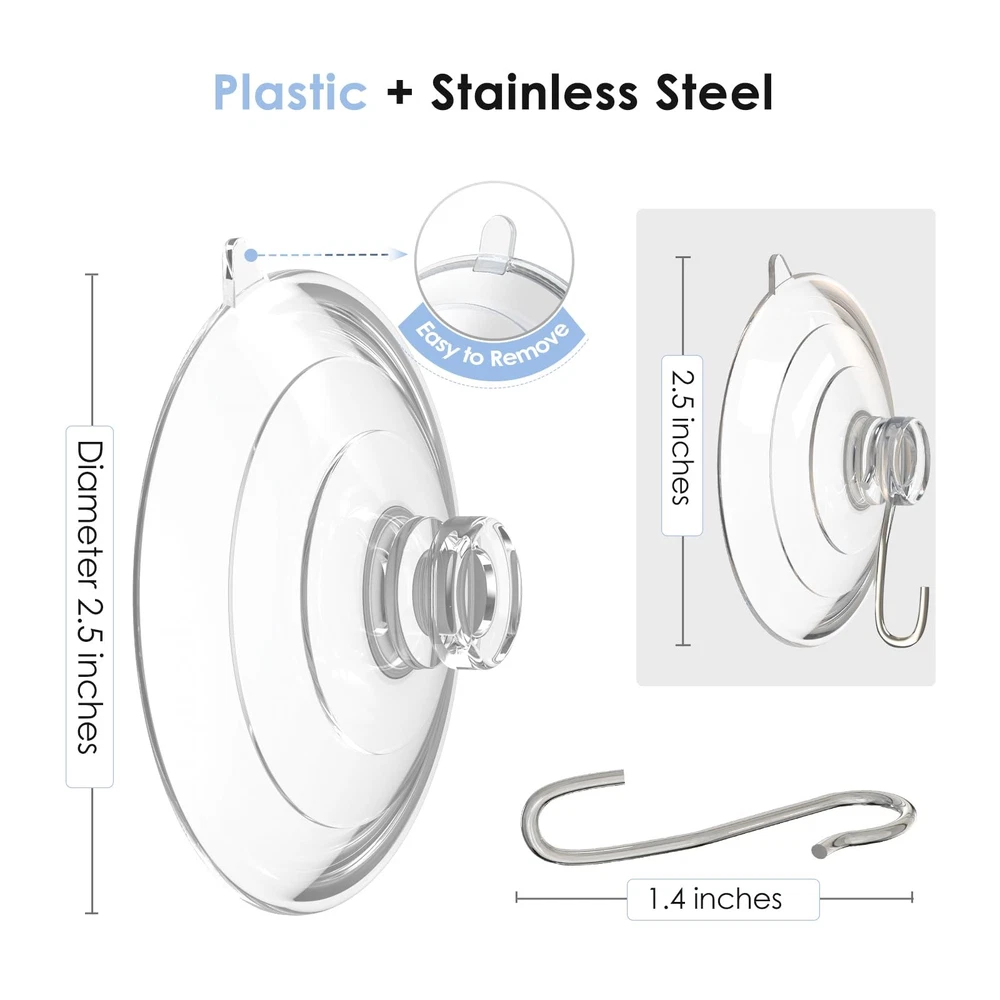 Hangerspace Suction Cup Hooks, 2.5 Inches Clear Cups Large, Product Details Lasting Quality: Our suction cup hooks is made of clear PVC and quality anti-rust stainless steel, it is soft and sturdy, lightweight and waterproof, temperature resistant, will not yellow or lose adhesion over time. Invisible Design: Our suction cups with metal hooks is transparent that almost invisible and blend in any decoration style. The diameter of suction cup is 2.5 inches that have compact shape, each suction cup hooks can hold up to 7lb, great for hanging towels, brushes, keys, wreaths, string lights. Detachable and Reusable: The PVC suction cup is reusable, the metal hooks and suction cups are detachable and can be used separately, you can use the cups without hooks for activities such as crafting. Easy to Use: The suction cup wall hooks don't need tools or drilling, makes installation a snap only few seconds, just press the sucker on the surface for hanging, suction cups has a release tab for easy removal and will not damage your wall. Multifunction: Our clear suction cup hooks can be easily attached to ceramic, window, mirror, glass, metal, fiberglass surface that can decoration your home and save more space.