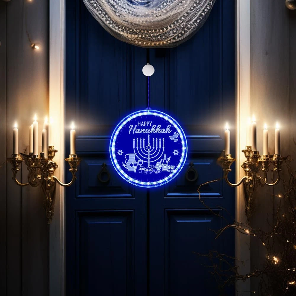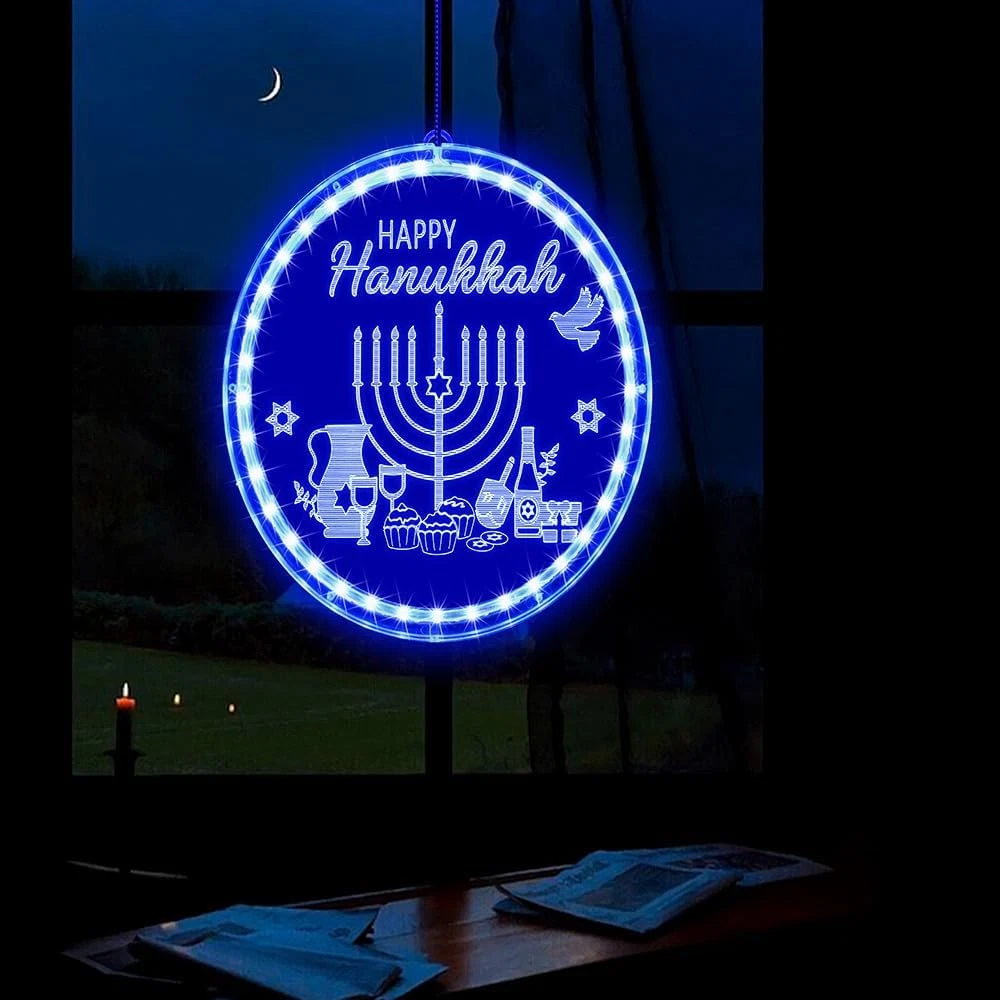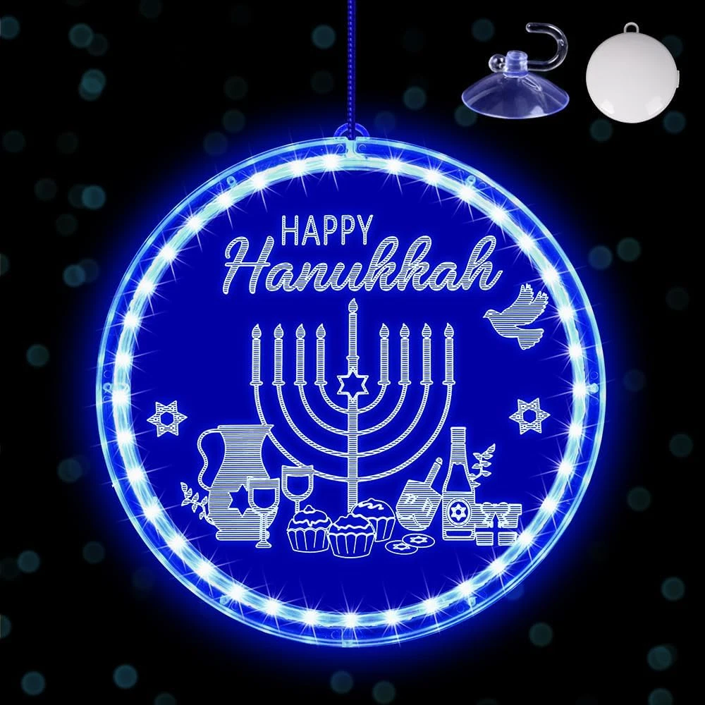 Menu Other Items Feedbacks About Us Contact Us Add To Favorites Hanukkah Decorations Blue Menorah Window Lights Battery Operated Chanukah LED Hanging Lights for Jews Judaism Synagogue Passover Shabbat Jewish Gifts Home Ornaments Indoor Outdoor Decor 🔵【Size】The diameter of the decorative lights is 8.26inch.The hanging rope and switch box, is approximately10inch. 🕎【Timeless Design Elements】Adorned with patterns and words that represent classic Hanukkah elements, these blue Chanukah lights infuse your Hanukkah gatherings or dining table with a rich Jewish ambiance. The vibrant blue light adds a dynamic touch to any space. ✡️【Quality Materials】Our decorative lights are expertly crafted from durable PVC materials, ensuring they remain sturdy and resistant to breakage even after long-term use. You can rest assured that they won't overheat. They're safe for children and pets, convenient to store, and can be reused for multiple occasions. 🕊️【Effortless Installation】The LED lights are accompanied by a suction cup hook, simplifying the installation process on glass, gates, cabinets, and other smooth surfaces. You can effortlessly adjust their height to fit your preferred location.Powered by 3 AAA batteries (not included) ❤️Please don't hesitate to get in touch with us if you encounter any quality issues with the product. There's no need to return it, as we can send you a replacement. Rest assured and enjoy your shopping experience. Product Description Specification Light Color: Blue Round Circle Color: Blue Size: 8.26 inch/ 21 cm Lighting Source: LED Lighting Operation: Battery Box Package Includes 1 x Hanukkah Window Light 1 x Suction Cup Hook Item Specification Item model number GMJ lights Light Source Type LED Room Type Bedroom Power Source Battery Powered Color Blue Included Components Battery Control Method Touch Model Number GMJ lights Base Material Glass Is Waterproof True Connectivity Technology USB Recommended Uses For Product Decoration Shade Material Glass, Polyvinyl Chloride Mount Type Ceiling Mount Package Dimensions 8.86 x 8.66 x 1.42 inches; 9.14 ounces Switch Type Slide Shipping FREE FREE SHIPPING We are always working hard to ensure your package arrives as soon as possible. Please understand that some factors like weather, high postal traffic, and the performance of shipping companies are outside of our control. We offer free shipping to the lower 48 states. We do not accept P.O. Boxes. Please provide a physical address. If you have a problem or question regarding your transaction please contact us immediately. We will work with you to resolve any problem you may have. Thank you