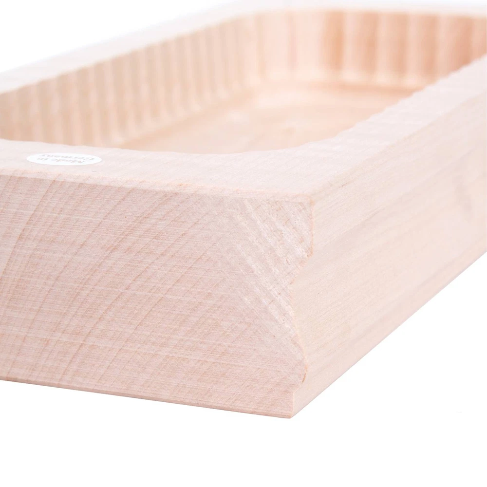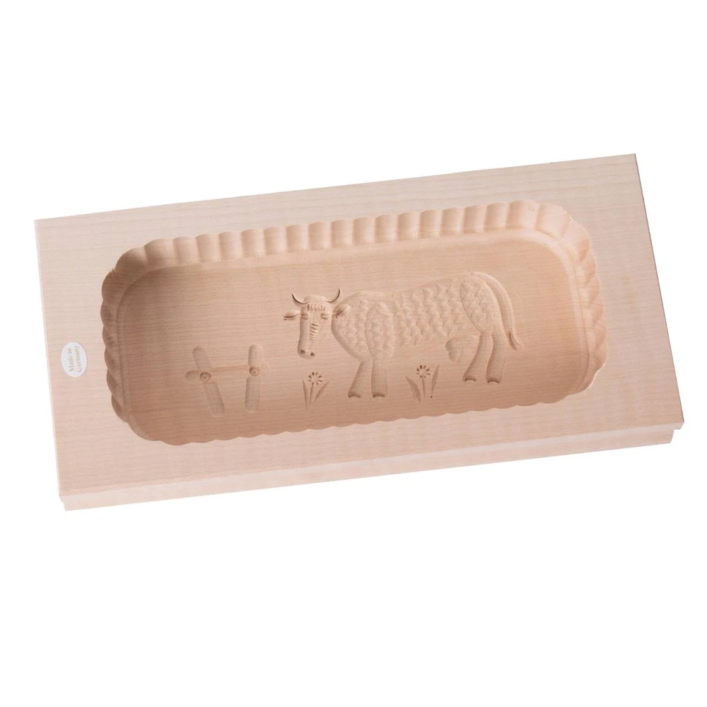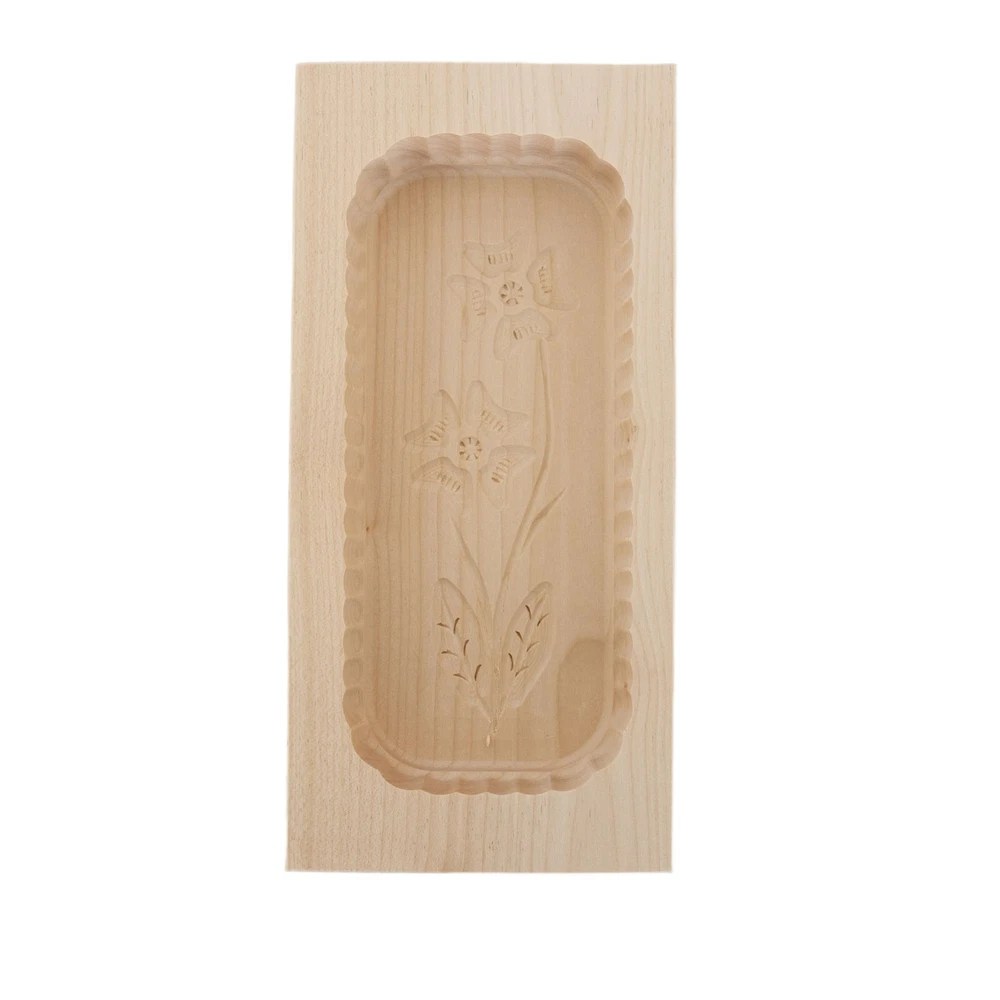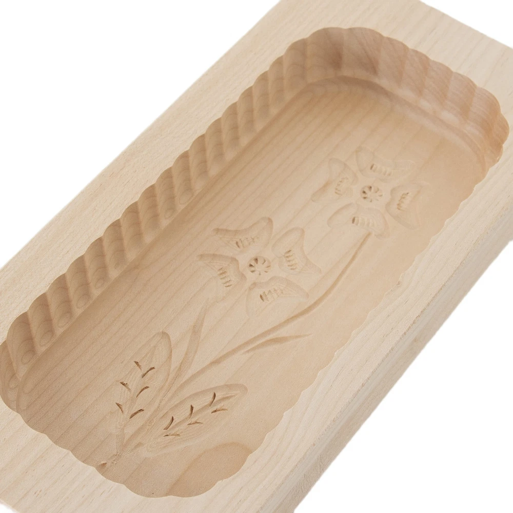 Finely carved interior and smoothly sanded exterior sets these German-made molds far above any other we've found. To use one-piece (leaves butter smooth and seamless), soak in cold water for 30 minutes, then add butter and chill. Turn over and molded butter drops out. Blemish-free, close-grained hardwoods with non-toxic natural finish.. Butter molds are handmade - dimensions may vary.. Outside measurements: 4-1/2" x 10"; Inside measurements: 3-1/2" x 8". Holds about 1 lb. of butter. Note: Patterns may vary. To prevent molds from cracking, coat mold with mineral oil after every use. Visit Our Store Contact Us Large Carved Rectangular Butter Mold Finely carved interior and smoothly sanded exterior sets these German-made molds far above any other we've found. To use one-piece (leaves butter smooth and seamless), soak in cold water for 30 minutes, then add butter and chill. Turn over and molded butter drops out. Blemish-free, close-grained hardwoods with non-toxic natural finish. Butter molds are handmade - dimensions may vary. Outside measurements: 4-1/2" x 10"; Inside measurements: 3-1/2" x 8" Holds about 1 lb. of butter Note: Patterns may vary. To prevent molds from cracking, coat mold with mineral oil after every use.