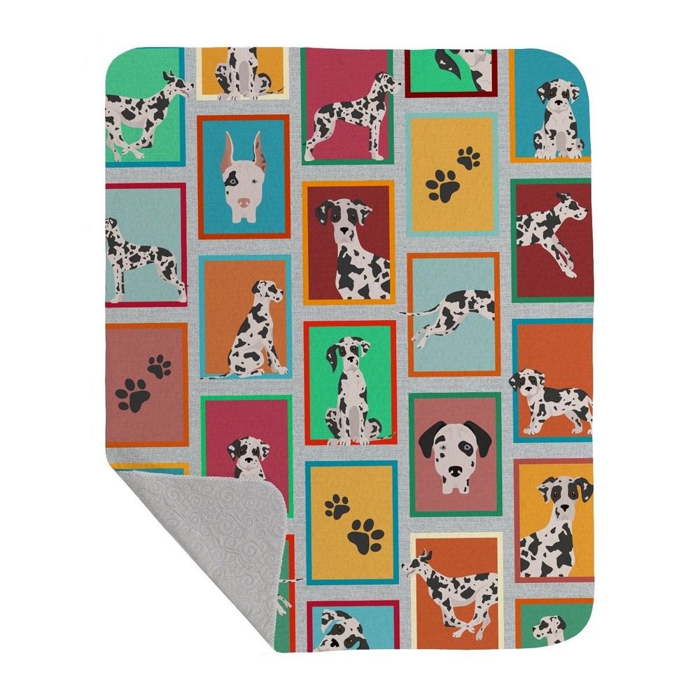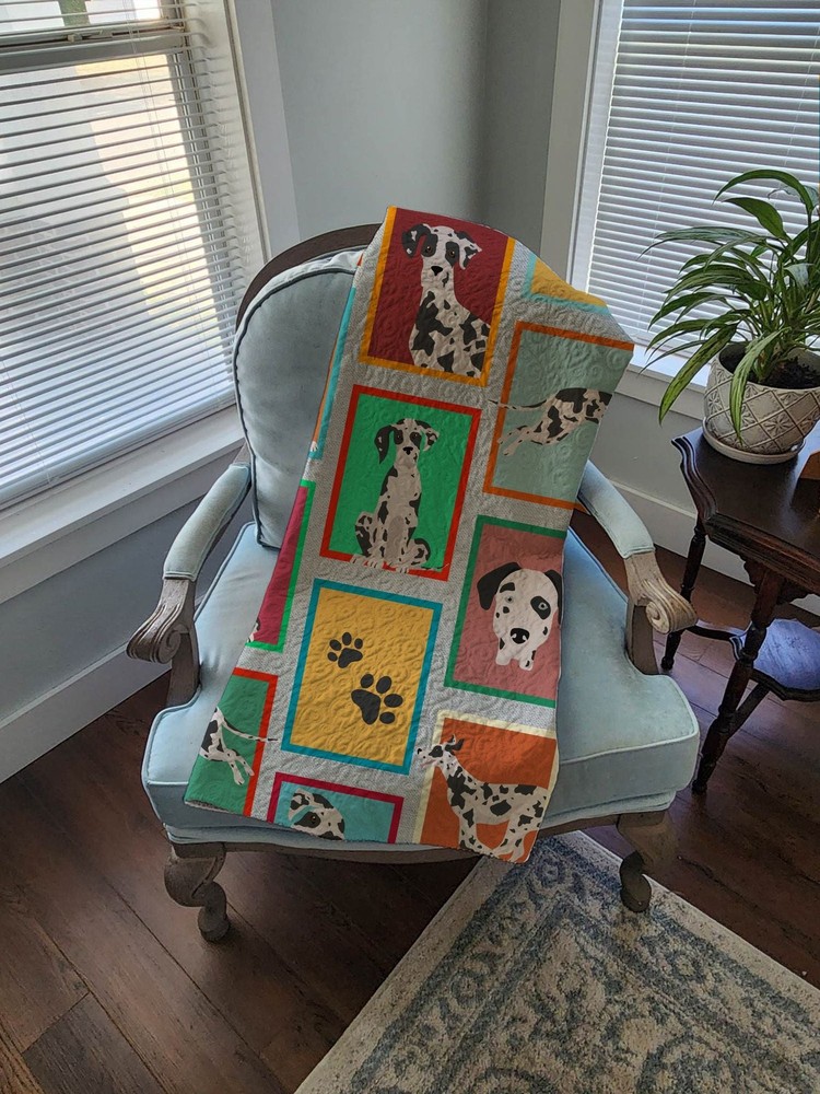 Thank you for visiting this listing. We have dozens of artistically painted items depicting your favorite breed of dog (almost 300 breeds). Floor mats, dish drying mats, indoor/outdoor welcome mats, cutting boards, soap dispensers, aprons, potholders, kitchen towels, bath towels, beach towels, garden flags, pole flags, pillows, throws, greetings and thank you cards, and more. Many holidays themed selections! We do combine shipping. $5.25 for the first item and $2.00 for each additional item. Commit to purchase and then send a message asking for a combined shipping invoice. At the top right of this listing, click on Seller?s other items. Once on that page, type in your favorite breed and enter. We think you will love the artwork and the selection. The feedback on these items has been excellent. Whether for yourself or for a gift, you will be pleased with your purchase. Thank you for visiting this listing. We have dozens of artistically painted items depicting your favorite breed of dog (almost 300 breeds). Floor mats, dish drying mats, indoor/outdoor welcome mats, cutting boards, soap dispensers, aprons, potholders, kitchen towels, bath towels, beach towels, garden flags, pole flags, pillows, throws, greetings and thank you cards, and more. Many holidays themed selections! We do combine shipping. $5.25 for the first item and $2.00 for each additional item. Commit to purchase and then send a message asking for a combined shipping invoice. At the top right of this listing, click on Seller?s other items. Once on that page, type in your favorite breed and enter. We think you will love the artwork and the selection. The feedback on these items has been excellent. Whether for yourself or for a gift, you will be pleased with your purchase. Highlights Versatile: This throw blanket quilt can also be used as a lap or wheelchair blanket, an indoor blanket, outdoor blanket, kennel blanket, crib blanket, or even as a chair blanket to keep you cozy at sporting events, music festivals, movie theaters, BBQ's, picnics, road trips, parks, or anywhere else you may need to keep warm. Its heavier design also makes it ideal for children and pets to sit on and relax whether inside or outside Craftsmanship: This blanket is made of 67% Polyester and 33% Cotton to ensure durability and comfort. Filled with 100% Cotton and quilted, it does an excellent job at keeping the chill at bay. Our products are made with high quality materials that will last with proper care. Portable: Our quilted blanket travels well when folded up and is ideal for weekend getaways or visits to the park. When not in use, it makes an excellent decorative addition to the back of any couch, loveseat, sectional, or recliner. Giftable: Our favorite thing about this blanket is that it's a wonderful gift for anyone who loves their fuzzy friends. It's the perfect present for graduations, birthdays, holidays, weddings, baby showers, housewarmings, or any other occasion where you would wish to give the gifts of warmth, style, and comfort. Great Dane gifts,Great Dane collectibles Specification Brand:Caroline's Treasures Details Quilted Blanket 50x60 featuring breed specific Great Dane artwork. This Quilted Blanket 50x60 is from Caroline's Treasures collection Lots of Dogs. Our quilted throw blanket is a must-have for anyone who values Form as well as Function! It measures 50 inches by 60 inches and is trimmed with a whip stitch. This heavier blanket is sure to keep away any draft or breeze without causing you to overheat. Use it as an accent piece for furniture, wrap your child in its comforting warmth, keep your pet calm on visits to the vet's office, or use it as an extra layer of softness for any crib or kennel. Here at Caroline's Treasures, we know that some dogs love to share sleeping accommodations with their favorite humans; This blanket makes a great coverlet for the foot of your bed so your four-legged companion has a warm, soft area to snooze on all night without getting your bedding dirty over time. When the blanket does get too many pawprints on it, simply throw it in the wash and follow the care instructions on the tag to restore it to like-new condition. This blanket is made of 67% Polyester and 33% Cotton to ensure durability and comfort. Filled with 100% Cotton and quilted, it does an excellent job at keeping the chill at bay. This is from Caroline's Treasures Dogs category of products.