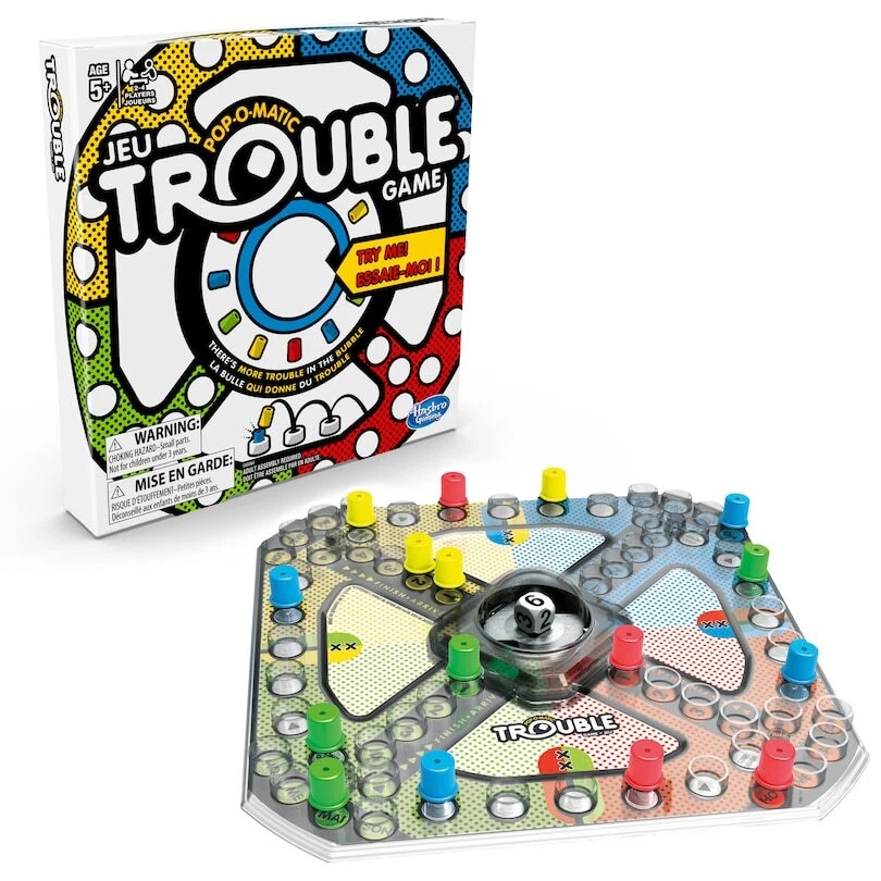 The Trouble game is pegpopping fun! The excitement begins as soon as a player presses the PopOMatic bubble to roll the die. In the Trouble board game, kids race to get all their game pieces around the board; but be careful! A player could get bumped and sent back to the beginning. Kids can play the classic Trouble game or a more challenging version with Power Up spaces. Be the first player to get all 4 pegs into the Finish zone to win. The Trouble board game can be a fun activity for kids ages 5 and up 2, 3, or 4 players can play at a time.Hasbro Gaming and all related terms are trademarks of Hasbro.Includes gameboard, plastic game unit with PopOMatic die roller, 16 pegs, and instructions.For 2 to 4 PlayersAdult Assembly Required.Warning: Choking Hazard Small parts. Not for children under 3 years © 2018 Hasbro. All Rights Reserved. ||DPSP-IN630509892228 Our Store We have more items available. Please check them out. Shipping & Handling Flat shipping rate, if specified, does not apply to Canadian territories and remote areas. For U.S., flat shipping rate only applies to lower 48 states. Please contact us for shipping rate if flat shipping rate does not apply to you. Upon receipt of payment, item will ship via Canada Post surface or UPS, Fedex Ground service or another economic service within the timeline specified in item listing. If possible, we will combine shipping for multiple items. International Orders Import duties, taxes, customs fees and charges are not included in the item price or shipping charges. These charges are normally collected when you pick up the package. Please check with your country's customs office on what these additional charges will be prior to buying the item(s). International buyers are responsible for these charges. Please note that package shipped from outside your country can be held up in customs and it can cause delay in shipping time. This is beyond our control and there is nothing we can do to speed up the process. Sales Tax For the Canadian buyer, applicable retail sales tax will be charged. Taxes are charged on both Item Price and Shipping & Handling charges if applicable. Store Policy Sales Agreement Upon purchase, you have entered a binding contract under the terms of the listing. If an item is out of stock or on backorder , you will be notified and given the option to wait for the item to become available, choose another item, or a full refund. Backordered items are shipped as they become available. Return and Refund Unless specified otherwise, every item purchase (except health, hygienic, food products and items with No Return Accepted specified in the listing) comes with unconditional money back guarantee minus shipping & handling charge and 20% restocking fee . Before returning, please contact us for a RMA number. All returns must come with a RMA number. Return without a RMA number will NOT be accepted. Buyer is responsible for the shipping cost of returning the item(s) to us and all original shipping, handling, insurance, and other fee associated with the returned item(s) are not refundable. For free shipping item(s), we still pay for shipping when sending item(s). The shipping cost associated with free shipping item(s) is not refundable. All merchandise returned must be in its original states with tag intact, undamaged, clean and unused. Any return must be made within 30 days of receipt. Upon receipt and careful examination of the returned merchandise, refund will be issued and you will be notified after the refund is processed. Please allow 5 business days from the time we receive your returned item(s) for your refund to be issued. Communication All communication must be conducted via online message. We do not offer customer service over the phone. We answer all messages promptly, usually within 1-2 days. As a general note, if you do encounter a problem with your item(s), please contact us as soon as possible before leaving a negative feedback. We will do our best to help you. Contact Us For local pickup, special requests and special offers, please contact us.