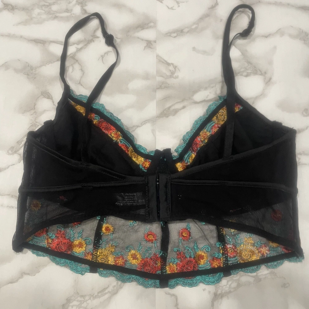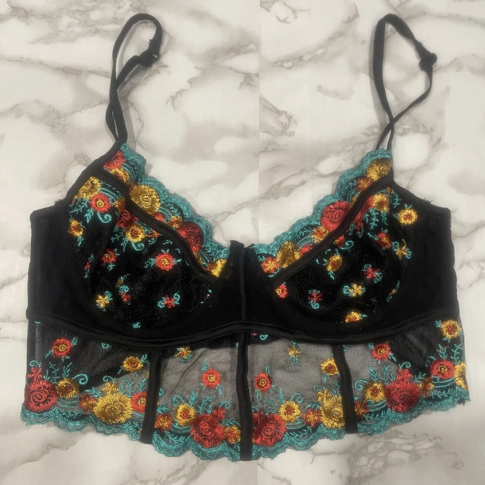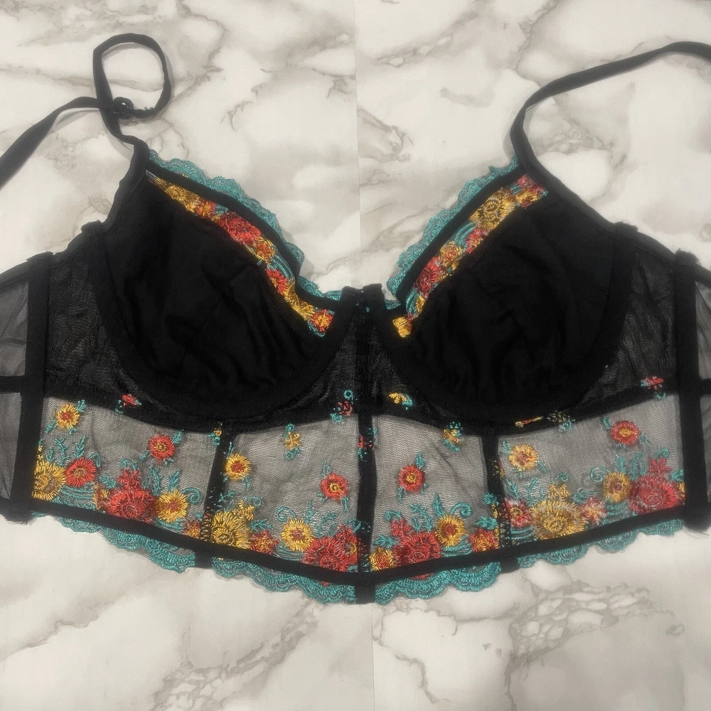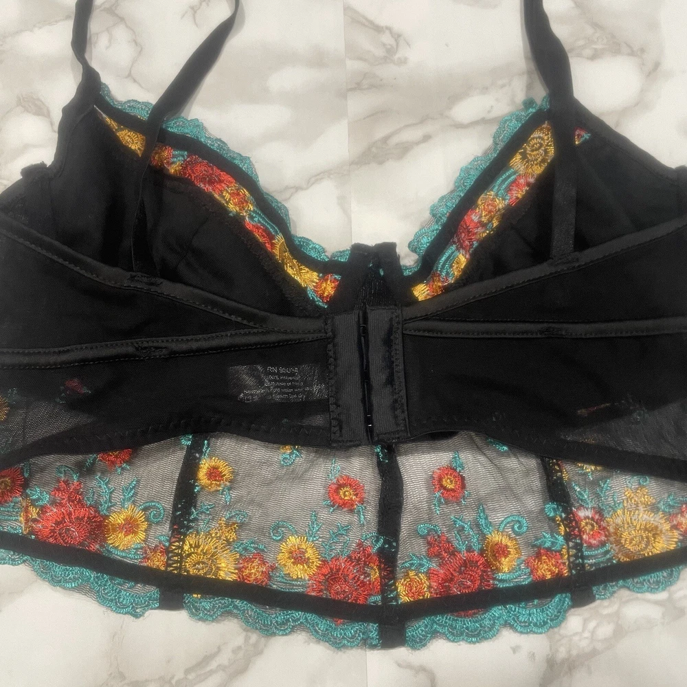 HAUTY BLACK FLORAL BRA: Details: bra, floral, red, yellow, blue, hook closure, lace, adjustable straps, preowned, mesh, lingerie, stylish, sexy Weight: 1.7 oz *All Measurements are Approximate* *All Offers Welcome (I Accept or Counter)* ~Smoke-free home~