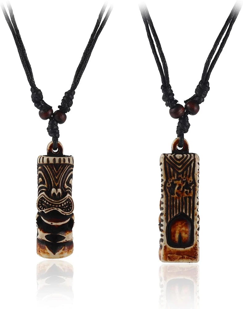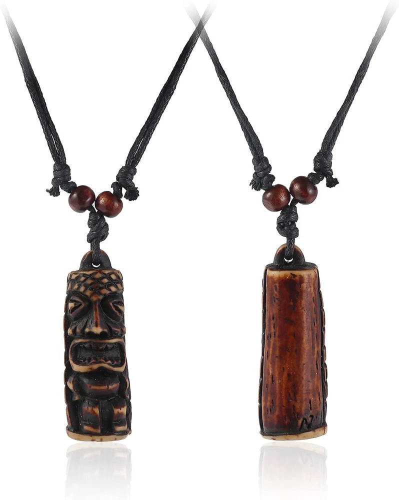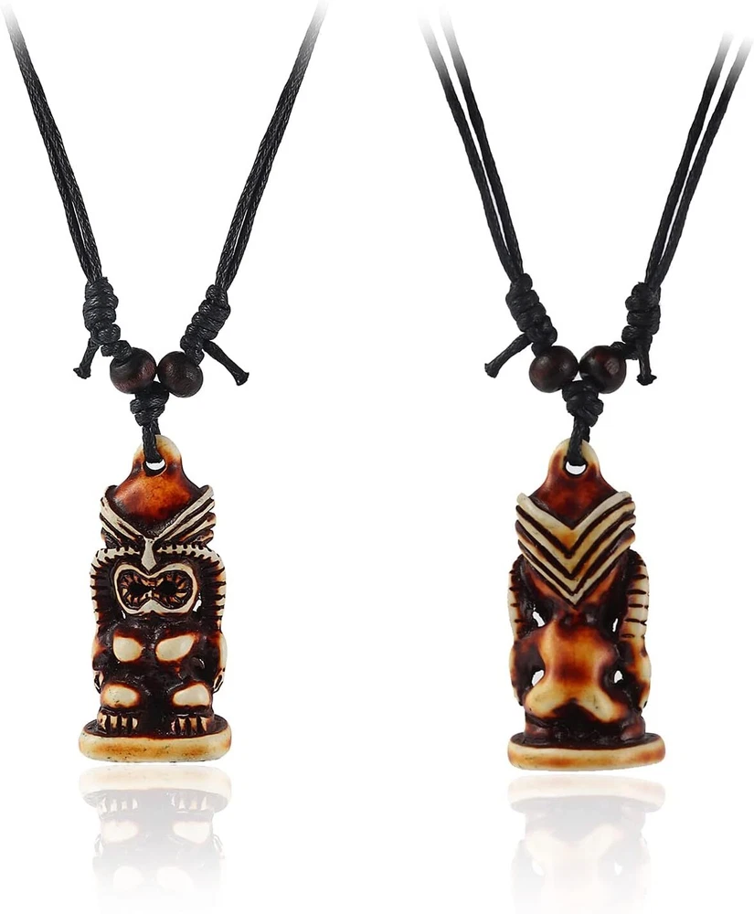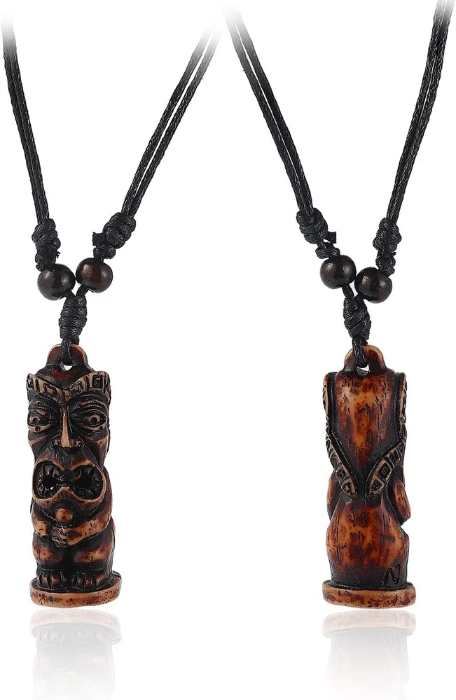 Hawaiian Tiki Resin Protection Amulet Lucky Pendant Necklace Cute Caved Satue Adjustable Rope Chain Handmade Vintage Jwelry for Mens Boys Women Girls