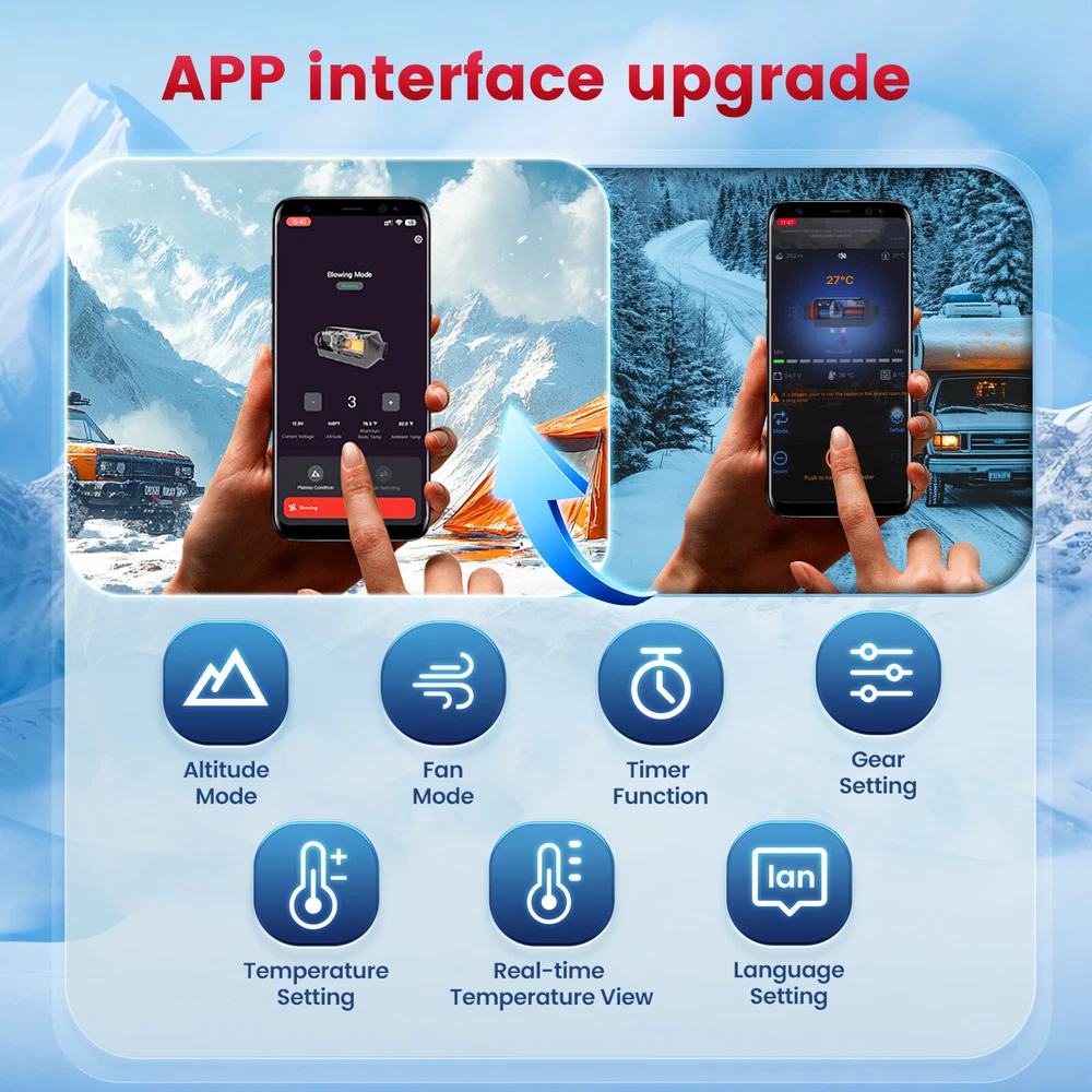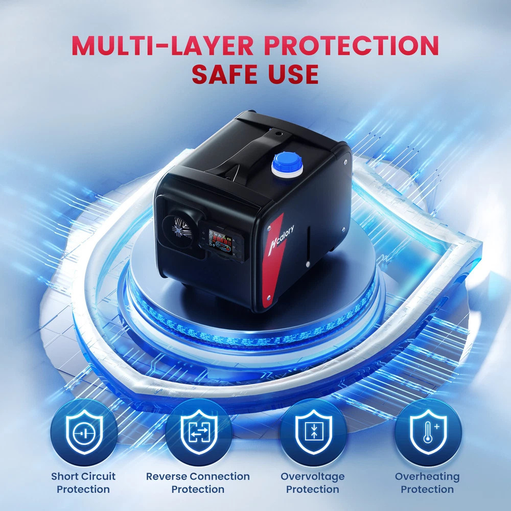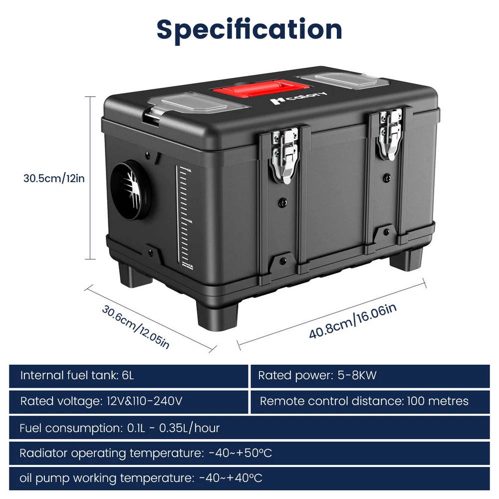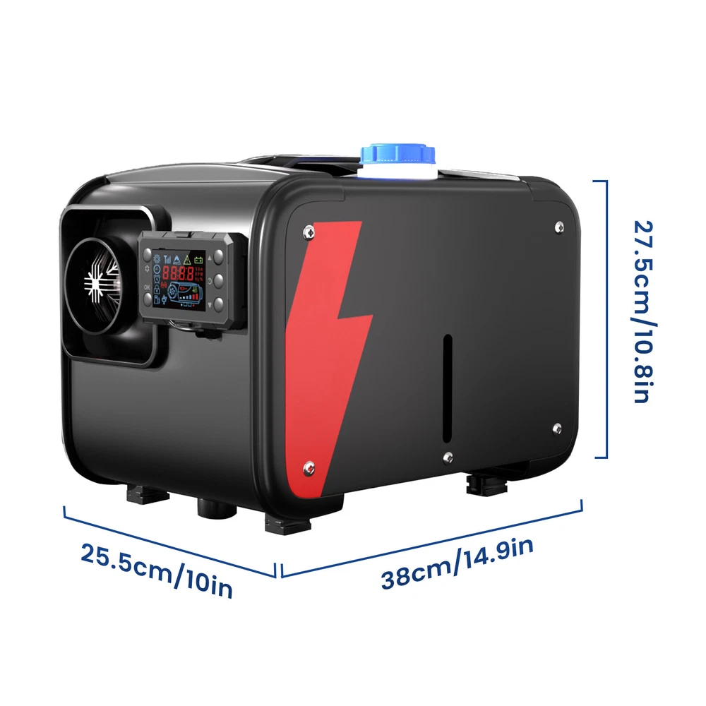 Similar Items Description Product advantages and characteristics: 1. Heating the car/indoor space: Heating the space by outputting warm air through the heat conversion in the combustion chamber of the heater; 2. DC12V-24V, AC 100-240V universal voltage automatic conversion, can be connected to two types of input power sources: AC-DC power adapter/positive and negative electrode battery; 3. temperature (Celsius/Fahrenheit switching) adjustment setting; 4. Timing switch function: start and close according to the set time; 5. Smarter - Download the "airheaterble" App, available for iOS and Android devices, which enables user to remotely control the heater via Bluetooth 6. Small size, space saving, comfortable to carry, portable 7. The built-in fuel tank has no odor, and the oil level scale is marked, making it easy to monitor the oil level and refuel in a timely manner; 8. No installation of intake pipe, fixed air filter at the bottom, easy to install 9. Install exhaust pipes on the side, without the need for bottom padding installation, and can effectively avoid the problem of exhaust pipe blockage 10. The metal buckle opening and closing design is sturdy and sealed, and the fuel tank is completely built-in to prevent odor. It is easy to open and convenient for maintenance and repair. A : Black tool box style Specification: Brand:Hcalory Built-in fuel tank: 5L Rated power: 5~8KW Rated voltage: 12V&110-240V Fuel consumption: 0.1 liters - 0.35 liters / hour Remote control effective distance: 50-100 meters Radiator working temperature: -40~+50°C Operating temperature of oil pump: -40~+40°C Packaged included: 1 x Air Diesel Heater 1 x Remote control 1 x AC power adapter 1 x Silencer 1 x Exhaust pipe 1 set Screw accessory kit 1 x User manual 1 x DC battery power cable B: Black and red horizontal style Specifications: Name Diesel air heater all in one Material metal + plastic Color Black& Red Voltage 12V/24V/110V Power 5KW-8KW Fuel Diesel Complete burn rate 100% Consumption 0.1 - 0.53 L/h Remote controlled effective distance 50-100m Working temperature -40 °c ~ 50 °c Package Included: 1 x Air Heater Host with LCD Display 1 x LCD Remote control 1 x Intake pipe 1 x Air Outlet pipe 1 x Exhaust pipe 1 x Filter 1x Silencer 1x L-type exhaust pipe bracket 4 x Connection holder 1 set Fixture Accessories set 1 x Instructions Note: 1. Please allow 0.5-1cm differences due to manual measurement. 2. Due to the light and screen difference, the item's color may be slightly different from the pictures. #divSKUDetail2 Detail Image Payment 1.We accept Payoneer、PayPal、Mastercard、VISA、Google Pay 、American Express etc. 2.All major credit cards are accepted through secure payment processor. 3.Payment must be received within 7 business days of auction closing. 4.We ship to your eBay or payment address. Please make sure your eBay and payment address is correct before you pay. Shipping 1.We ship to your eBay or Paypal address. Please make sure your eBay and Paypal address is correct before you pay. 2.Items will be shipped within 1-3 business day when we received payment. 3.Delivery time depends on destination and other factors;