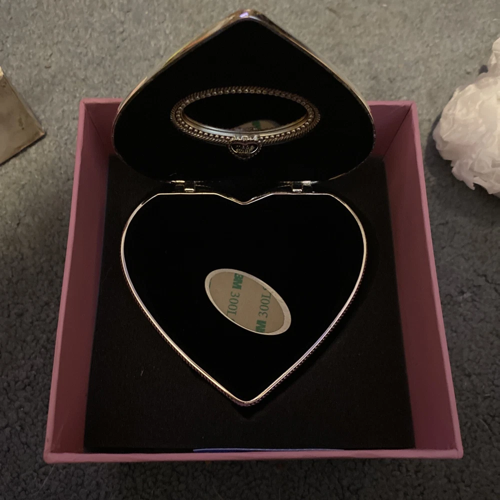 This is a heart-shaped jewelry box from Things Remembered, featuring an angel design. The box is made of silver metal with a glossy finish and velvet interior. It is small in size, measuring 3.5 inches in length and 2 inches in height. The keepsake box is adorned with hearts and is suitable for all occasions, making it a thoughtful gift for adults. The jewelry box was in its gift box when both survived a house fire. The jewelry box is still brand new, however the box I’m sending it in (which has the heart shape cut into it for perfect fit) was in the house, but far enough from the fire to not burn up, yet, it did receive soot stains & looks dirty. It is perfectly clean inside. You will probably want to remove the jewelry box & toss the gift box it sits in, upon delivery. The jewelry box has never been used.