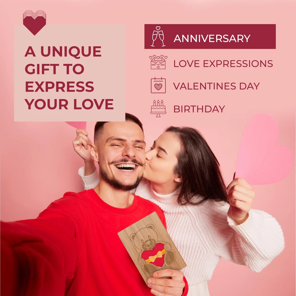 Let them know that they are surrounded by warmth and love with this teddy bear inspired card. This lightly colored wood card features a sweet teddy bear holding a brightly colored red heart tied with a yellow ribbon. This pop of color shows the recipient that they're in your heart. Inside the playful teddy bear theme is reflected as the perfect backdrop for a handwritten message or note. UNIQUE EXPRESSION OF LOVE - Elevate heartfelt messages with HeartSpace's handcrafted bamboo cards. Swap paper for this distinctive wooden card, a perfect anniversary card for your wife, husband, or an 'I love you' card for your girlfriend. Express your love uniquely! ENDURING KEEPSAKE - The wooden anniversary card from HeartSpace isn't just a card; it's a durable, long-lasting memento of your affection. Perfect for any wedding anniversary or to express your deep, unspoken love. LUXURY & NATURE IN YOUR HANDS: Experience the luxurious blend of artistry and sustainability with HeartSpace's handcrafted bamboo cards. Paired with quality envelopes, they are perfect for birthdays or anniversaries. YOUR LOVE, YOUR WORDS - Inside, left blank, HeartSpace's Bamboo Love Cards offers a canvas for your emotions. Craft a personalized anniversary card or a sincere expression of love that truly speaks from your heart to your loved one. SUSTAINABLE LOVE EXPRESSIONS- Embrace Flora's commitment to sustainability and HeartSpace's mission for a cleaner, greener world. Our eco-friendly sustainable Love Cards are not just heartfelt messages; they symbolize love and respect for Mother Earth.
